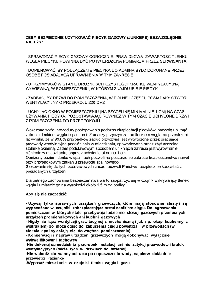 ŻEBY BEZPIECZNIE UŻYTKOWAĆ PIECYK GAZOWY (JUNKERS) BEZWZGLĘDNIE NALEŻY: - SPRAWDZAĆ PIECYK GAZOWY COROCZNIE. PRAWIDŁOWA ZAWARTOŚĆ TLENKU WĘGLA PIECYKU POWINNA BYĆ POTWIERDZONA POMIAREM PRZEZ SERWISANTA - DOPILNOWAĆ, BY PODŁĄCZENIE PIECYKA DO KOMINA BYŁO DOKONANE PRZEZ OSOBĘ POSIADAJĄCĄ UPRAWNIENIA W TYM ZAKRESIE - UTRZYMYWAĆ W STANIE DROŻNOŚCI I CZYSTOŚCI KRATKĘ WENTYLACYJNĄ WYWIEWNĄ, W POMIESZCZENIU, W KTÓRYM ZNAJDUJE SIĘ PIECYK - ZADBAĆ, BY DRZWI DO POMIESZCZENIA, W DOLNEJ CZĘŚCI, POSIADAŁY OTWÓR WENTYLACYJNY O PRZEKROJU 220 CM2 - UCHYLAĆ OKNO W POMIESZCZENIU (NA SZCZELINĘ MINIMALNIE 1 CM) NA CZAS UŻYWANIA PIECYKA, POZOSTAWIAJĄC RÓWNIEŻ W TYM CZASIE UCHYLONE DRZWI Z POMIESZCZENIA DO PRZEDPOKOJU Wskazane wyżej procedury postępowania podczas eksploatacji piecyków, pozwolą uniknąć zatrucia tlenkiem węgla i spalinami. Z analizy przyczyn zatruć tlenkiem węgla na przestrzeni lat wynika, że w 99,8% przypadków zatruć przyczyną jest wytworzone przez pracujące przewody wentylacyjne podciśnienie w mieszkaniu, spowodowane przez zbyt szczelną stolarkę okienną. Zatem podstawowym sposobem uniknięcia zatrucia jest wyrównanie ciśnienia w mieszkaniu, poprzez uchylenie okna na 1 cm Obniżony poziom tlenku w spalinach pozwoli na poszerzenie zakresu bezpieczeństwa nawet przy przypadkowym zatkaniu przewodu spalinowego. Stosowanie się do tych podstawowych zasad, pozwoli Państwu bezpiecznie korzystać z posiadanych urządzeń. Dla pełnego zachowania bezpieczeństwa warto zaopatrzyć się w czujnik wykrywający tlenek węgla i umieścić go na wysokości około 1,5 m od podłogi. Aby się nie zaczadzić: - Używaj tylko sprawnych urządzeń grzewczych, które mają stosowne atesty i są wyposażone w czujniki zabezpieczające przed zanikiem ciągu. Do ogrzewania pomieszczeń w których stale przebywają ludzie nie stosuj gazowych przenośnych urządzeń promiennikowych ani kuchni gazowych - Nigdy nie łącz wentylacji grawitacyjnej z mechaniczną ( jak np. okap kuchenny z wiatrakiem) bo może dojść do zaburzenia ciągu powietrza w przewodach (w efekcie spaliny cofają się do wnętrza pomieszczenia) - Konserwacji i napraw urządzeń grzewczych mogą dokonywać wyłącznie wykwalifikowani fachowcy -Nie dokonuj samodzielnie przeróbek instalacji ani nie zatykaj przewodów i kratek wentylacyjnych (także tych w drzwiach do łazienki) -Nie wchodź do wanny od razu po napuszczeniu wody, najpierw dokładnie przewietrz łazienkę -Wyposaż mieszkanie w czujniki tlenku węgla i gazu.