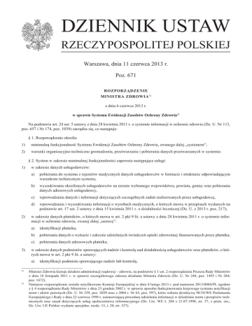 DZIENNIK USTAW RZECZYPOSPOLITEJ POLSKIEJ Warszawa, dnia 11 czerwca 2013 r. Poz. 671 ROZPORZĄDZENIE MINISTRA ZDROWIA 1) z dnia 6 czerwca 2013 r. w sprawie Systemu Ewidencji Zasobów Ochrony Zdrowia2) Na podstawie art. 24 ust. 5 ustawy z dnia 28 kwietnia 2011 r. o systemie informacji w ochronie zdrowia (Dz. U. Nr 113, poz. 657 i Nr 174, poz. 1039) zarządza się, co następuje: § 1. Rozporządzenie określa: 1) minimalną funkcjonalność Systemu Ewidencji Zasobów Ochrony Zdrowia, zwanego dalej „systemem”; 2) warunki organizacyjno-techniczne gromadzenia, przetwarzania i pobierania danych przetwarzanych w systemie. § 2. System w zakresie minimalnej funkcjonalności zapewnia następujące usługi: 1) w zakresie danych usługodawców: a) pobierania do systemu z rejestrów medycznych danych usługodawców w formacie i strukturze odpowiadającym warunkom technicznym systemu, b) wyszukiwania określonych usługodawców na terenie wybranego województwa, powiatu, gminy oraz pobierania danych adresowych usługodawcy, c) wprowadzania danych i informacji dotyczących szczególnych zadań realizowanych przez usługodawcę, d) wprowadzania i wyszukiwania informacji o wyrobach medycznych, o których mowa w przepisach wydanych na podstawie art. 17 ust. 2 ustawy z dnia 15 kwietnia 2011 r. o działalności leczniczej (Dz. U. z 2013 r. poz. 217); 2) w zakresie danych płatników, o których mowa w art. 2 pkt 9 lit. a ustawy z dnia 28 kwietnia 2011 r. o systemie informacji w ochronie zdrowia, zwanej dalej „ustawą”: a) identyfikacji płatnika, b) pobierania danych o wykazie i zakresie udzielanych świadczeń opieki zdrowotnej finansowanych przez płatnika, c) pobierania danych adresowych płatnika; 3) w zakresie danych podmiotów sprawujących nadzór i kontrolę nad działalnością usługodawców oraz płatników, o których mowa w art. 2 pkt 9 lit. a ustawy: a) identyfikacji podmiotu sprawującego nadzór lub kontrolę, Minister Zdrowia kieruje działem administracji rządowej – zdrowie, na podstawie § 1 ust. 2 rozporządzenia Prezesa Rady Ministrów z dnia 18 listopada 2011 r. w sprawie szczegółowego zakresu działania Ministra Zdrowia (Dz. U. Nr 248, poz. 1495 i Nr 284, poz. 1672). 2) Niniejsze rozporządzenie zostało notyfikowane Komisji Europejskiej w dniu 8 lutego 2013 r. pod numerem 2013/0084/PL zgodnie z § 4 rozporządzenia Rady Ministrów z dnia 23 grudnia 2002 r. w sprawie sposobu funkcjonowania krajowego systemu notyfikacji norm i aktów prawnych (Dz. U. Nr 239, poz. 2039 oraz z 2004 r. Nr 65, poz. 597), które wdraża dyrektywę 98/34/WE Parlamentu Europejskiego i Rady z dnia 22 czerwca 1998 r. ustanawiającą procedurę udzielania informacji w dziedzinie norm i przepisów technicznych oraz zasad dotyczących usług społeczeństwa informacyjnego (Dz. Urz. WE L 204 z 21.07.1998, str. 37, z późn. zm.; Dz. Urz. UE Polskie wydanie specjalne, rozdz. 13, t. 20, str. 337). 1) Dziennik Ustaw – 2 – Poz. 671 b) wymiany danych drogą elektroniczną z podmiotami sprawującymi nadzór lub kontrolę, c) przesyłania dokumentów elektronicznych do podmiotu sprawującego nadzór lub kontrolę oraz uzyskania potwierdzenia ich przyjęcia; 4) w zakresie statystyki: a)wczytywania danych z rejestrów medycznych, wprowadzanie ich przez administratora systemu oraz weryfikację ich poprawności i jakości, b)agregacji danych, c)dostępu do danych gromadzonych w systemie, d)bieżącej aktualizacji danych, e)okresowego i automatycznego wykonywania kopii bezpieczeństwa. § 3. System zapewnia dostęp do danych zgromadzonych w systemie w portalu edukacyjno-informacyjnym, o którym mowa w art. 36 ustawy. § 4. 1. W systemie są gromadzone, przetwarzane i udostępniane dane pozyskiwane z rejestrów medycznych za pomocą Platformy Udostępniania On-Line Usług i Zasobów Cyfrowych Rejestrów Medycznych, o której mowa w art. 6 ustawy. 2. Wzory dokumentów elektronicznych wprowadzanych do systemu są przechowywane w centralnym repozytorium wzorów dokumentów elektronicznych, o którym mowa w art. 19b ust. 1 ustawy z dnia 17 lutego 2005 r. o informatyzacji działalności podmiotów realizujących zadania publiczne (Dz. U. z 2013 r. poz. 235), w portalu edukacyjno-informacyjnym, o którym mowa w art. 36 ustawy, oraz w Biuletynie Informacji Publicznej ministra właściwego do spraw zdrowia. 3. Dokumenty elektroniczne, o których mowa w ust. 2, opatruje się bezpiecznym podpisem elektronicznym w rozumieniu art. 3 pkt 2 ustawy z dnia 18 września 2001 r. o podpisie elektronicznym (Dz. U. z 2013 r. poz. 262) albo podpisem potwierdzonym profilem zaufanym ePUAP w rozumieniu art. 3 pkt 15 ustawy z dnia 17 lutego 2005 r. o informatyzacji działalności podmiotów realizujących zadania publiczne. 4. Zestawienie stosowanych w oprogramowaniu interfejsowym systemu struktur dokumentów elektronicznych, formatów danych oraz protokołów komunikacyjnych i szyfrujących wraz z dokumentacją systemu udostępnia się w repozytorium interoperacyjności, o którym mowa w przepisach wydanych na podstawie art. 18 ustawy z dnia 17 lutego 2005 r. o informatyzacji działalności podmiotów realizujących zadania publiczne, w portalu edukacyjno-informacyjnym, o którym mowa w art. 36 ustawy, oraz w Biuletynie Informacji Publicznej ministra właściwego do spraw zdrowia. 5. W zakresie warunków organizacyjno-technicznych gromadzenia i pobierania danych przetwarzanych w systemie system jest zgodny z warunkami określonymi w przepisach wydanych na podstawie art. 18 ustawy z dnia 17 lutego 2005 r. o informatyzacji działalności podmiotów realizujących zadania publiczne, a w zakresie nieuregulowanym w tych przepisach z następującymi normami, których przedmiotem są zasady gromadzenia i wymiany informacji w ochronie zdrowia: 1) PN-EN ISO 13606-1:2013 Informatyka w ochronie zdrowia – Przesyłanie elektronicznej dokumentacji zdrowotnej, 2) PN-EN 13606:2-4:2009 Informatyka w ochronie zdrowia – Przesyłanie elektronicznej d