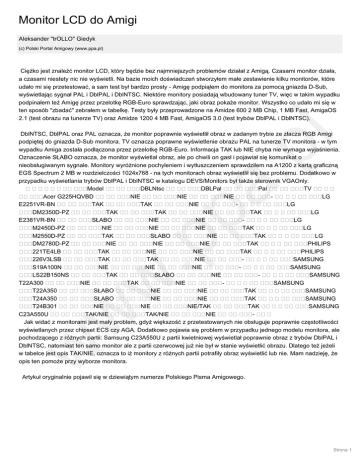 Monitor LCD do Amigi Aleksander "trOLLO" Giedyk (c) Polski Portal Amigowy (www.ppa.pl) Ciężko jest znaleźć monitor LCD, który będzie bez najmniejszych problemów działał z Amigą. Czasami monitor działa, a czasami niestety nic nie wyświetli. Na bazie moich doświadczeń stworzyłem małe zestawienie kilku monitorów, które udało mi się przetestować, a sam test był bardzo prosty - Amigę podpiąłem do monitora za pomocą gniazda D-Sub, wyświetlając sygnał PAL i DblPAL i DblNTSC. Niektóre monitory posiadają wbudowany tuner TV, więc w takim wypadku podpinałem też Amigę przez przelotkę RGB-Euro sprawdzając, jaki obraz pokaże monitor. Wszystko co udało mi się w ten sposób "zbadać" zebrałem w tabelkę. Testy były przeprowadzone na Amidze 600 2 MB Chip, 1 MB Fast, AmigaOS 2.1 (test obrazu na tunerze TV) oraz Amidze 1200 4 MB Fast, AmigaOS 3.0 (test trybów DblPAL i DblNTSC). w w w .p pa .p l DblNTSC, DblPAL oraz PAL oznacza, że monitor poprawnie wyświetlił obraz w zadanym trybie ze złacza RGB Amigi podpiętej do gniazda D-Sub monitora. TV oznacza poprawne wyświetlenie obrazu PAL na tunerze TV monitora - w tym wypadku Amiga została podłączona przez przelotkę RGB-Euro. Informacja TAK lub NIE chyba nie wymaga wyjaśnienia. Oznaczenie SŁABO oznacza, że monitor wyświetlał obraz, ale po chwili on gasł i pojawiał się komunikat o nieobsługiwanym sygnale. Monitory wyróżnione pochyleniem i wytłuszczeniem sprawdziłem na A1200 z kartą graficzną EGS Spectrum 2 MB w rozdzielczości 1024x768 - na tych monitorach obraz wyświetlił się bez problemu. Dodatkowo w przypadku wyświetlania trybów DblPAL i DblNTSC w katalogu DEVS/Monitors był także sterownik VGAOnly. Model DBLNtsc DBLPal Pal TV Acer G225HQVBD NIE NIE NIE LG E2251VR-BN TAK TAK NIE LG DM2350D-PZ TAK TAK NIE TAK LG E2381VR-BN SŁABO NIE NIE LG M2450D-PZ NIE NIE NIE TAK LG M2550D-PZ TAK SŁABO NIE TAK LG DM2780D-PZ NIE NIE NIE TAK PHILIPS 221TE4LB TAK NIE NIE TAK PHILIPS 226V3LSB TAK TAK NIE SAMSUNG S19A100N NIE NIE NIE SAMSUNG LS22B150NS TAK SŁABO NIE SAMSUNG T22A300 NIE TAK NIE SAMSUNG T22A350 SŁABO NIE NIE TAK SAMSUNG T24A350 SŁABO NIE NIE TAK SAMSUNG T24B301 NIE NIE NIE/TAK TAK SAMSUNG C23A550U TAK/NIE TAK/NIE NIE Jak widać z monitorami jest mały problem, gdyż większość z przetestowanych nie obsługuje poprawnie częstotliwości wyświetlanych przez chipset ECS czy AGA. Dodatkowo pojawia się problem w przypadku jednego modelu monitora, ale pochodzącego z różnych partii: Samsung C23A550U z partii kwietniowej wyświetlał poprawnie obraz z trybów DblPAL i DblNTSC, natomiast ten samo monitor ale z partii czerwcowej już nie był w stanie wyświetlić obrazu. Dlatego też jeżeli w tabelce jest opis TAK/NIE, oznacza to iż monitory z różnych partii potrafiły obraz wyświetlić lub nie. Mam nadzieję, że opis ten pomoże przy wyborze monitora. Artykuł oryginalnie pojawił się w dziewiątym numerze Polskiego Pisma Amigowego. Strona 1
