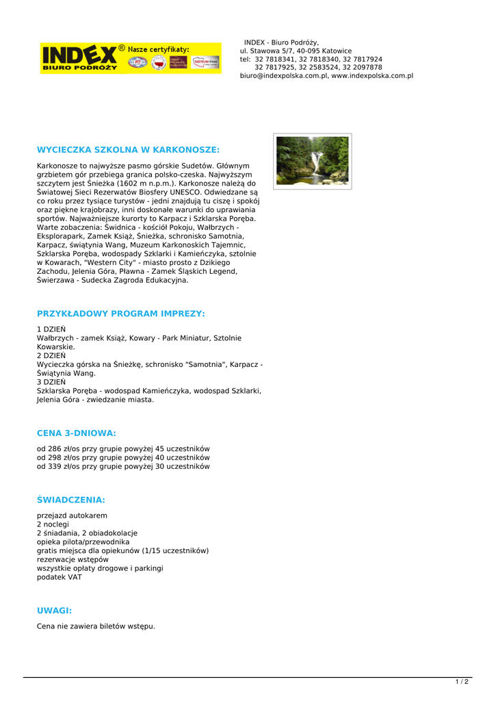 INDEX - Biuro Podróży, ul. Stawowa 5/7, 40-095 Katowice tel: 32 7818341, 32 7818340, 32 7817924 32 7817925, 32 2583524, 32 2097878 [email protected], www.indexpolska.com.pl WYCIECZKA SZKOLNA W KARKONOSZE: Karkonosze to najwyższe pasmo górskie Sudetów. Głównym grzbietem gór przebiega granica polsko-czeska. Najwyższym szczytem jest Śnieżka (1602 m n.p.m.). Karkonosze należą do Światowej Sieci Rezerwatów Biosfery UNESCO. Odwiedzane są co roku przez tysiące turystów - jedni znajdują tu ciszę i spokój oraz piękne krajobrazy, inni doskonałe warunki do uprawiania sportów. Najważniejsze kurorty to Karpacz i Szklarska Poręba. Warte zobaczenia: Świdnica - kościół Pokoju, Wałbrzych Eksplorapark, Zamek Książ, Śnieżka, schronisko Samotnia, Karpacz, świątynia Wang, Muzeum Karkonoskich Tajemnic, Szklarska Poręba, wodospady Szklarki i Kamieńczyka, sztolnie w Kowarach, "Western City" - miasto prosto z Dzikiego Zachodu, Jelenia Góra, Pławna - Zamek Śląskich Legend, Świerzawa - Sudecka Zagroda Edukacyjna. PRZYKŁADOWY PROGRAM IMPREZY: 1 DZIEŃ Wałbrzych - zamek Książ, Kowary - Park Miniatur, Sztolnie Kowarskie. 2 DZIEŃ Wycieczka górska na Śnieżkę, schronisko "Samotnia", Karpacz Świątynia Wang. 3 DZIEŃ Szklarska Poręba - wodospad Kamieńczyka, wodospad Szklarki, Jelenia Góra - zwiedzanie miasta. CENA 3-DNIOWA: od 286 zł/os przy grupie powyżej 45 uczestników od 298 zł/os przy grupie powyżej 40 uczestników od 339 zł/os przy grupie powyżej 30 uczestników ŚWIADCZENIA: przejazd autokarem 2 noclegi 2 śniadania, 2 obiadokolacje opieka pilota/przewodnika gratis miejsca dla opiekunów (1/15 uczestników) rezerwacje wstępów wszystkie opłaty drogowe i parkingi podatek VAT UWAGI: Cena nie zawiera biletów wstępu. 1/2 DODATKOWO: + 10 zł zwiedzanie Wrocławia + 39 zł całodzienna wycieczka do PRAGI! + 25 zł wycieczka do Skalnego Miasta w Czechach lub do Centrum Nauki Iqlandia w Czechach + 20 zł wycieczka do ZOO Safari w Czechach Ceny biletów wstępu mogą ulec zmianie niezależnie od Biura Podróży Index, dlatego prosimy o powiększenie funduszu na pokrycie ewentualnych podwyżek cen biletów. 2/2 Powered by TCPDF (www.tcpdf.org)