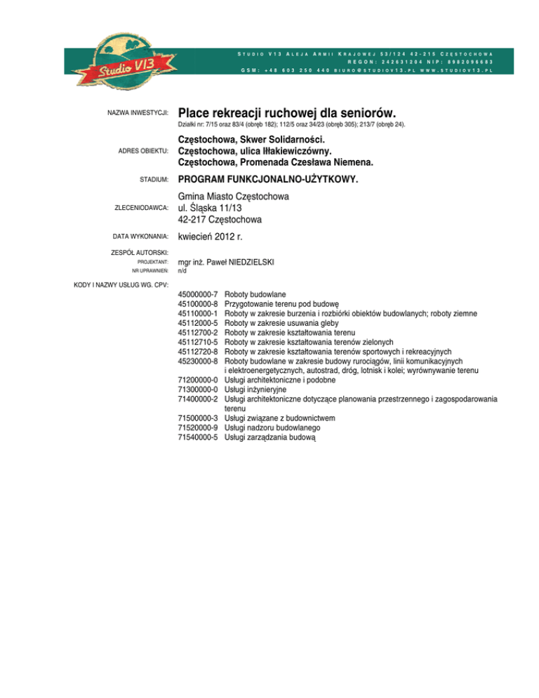 STU D I O V1 3 A LE JA ARM I I K RA JO WE J 53 /1 2 4 42 - 2 15 CZĘSTO C HO WA R EG O N : 2 4 2 6 31 2 0 4 N IP: G SM: NAZWA INWESTYCJI: + 4 8 6 0 3 2 5 0 898 2 0 9 6 6 83 4 4 0 BI U RO @ S TU DI OV 1 3 .P L WWW .S TU DIO V 1 3 .P L Place rekreacji ruchowej dla seniorów. seniorów Działkii nr: 7/15 oraz 83/4 (obręb ę 182); 112/5 oraz 34/23 (obręb ęb 305); 213/7 (obręb 24). 24) ADRES OBIEKTU: STADIUM: Częstochowa, ęstochowa, Skwer Solidarności. Solidarnoś Częstochowa, ęstochowa, ulica Iłłakiewiczówny. Częstochowa, ęstochowa, Promenada Czesława Niemena. PROGRAM FUNKCJONALNO-UŻYTKOWY. FUNKCJONALNO ZLECENIODAWCA: Gmina Miasto Częstochowa Czę ul. Śląska Ślą 11/13 42-2217 Częstochowa DATA WYKONANIA: kwiecień 2012 r. ZESPÓŁ AUTORSKI: PROJEKTANT: NR UPRAWNIEŃ: mgr inż. inż Paweł NIEDZIELSKI n/d KODY I NAZWY USŁUG WG. CPV: 45000000-7 45000000 45100000 45100000-8 45110000 45110000-1 45112000 45112000-5 45112700 45112700-2 45112710 45112710-5 45112720 45112720-8 45230000 45230000-8 71200000-0 71200000 71300000 71300000-0 71400000 71400000-2 71500000-3 71500000 71520000 71520000-9 71540000 71540000-5 Roboty budowlane Przygotowanie terenu pod budowę Roboty w zakresie burzenia i rozbiórki obiektów budowlanych; roboty ziemne Roboty w zakresie usuwania gleby Roboty w zakresie kształtowania terenu Roboty w zakresie kształtowania terenów zielonych Roboty w zakresie kształtowania terenów sportowych i rekreacyjnych Roboty budowlane w zakresie budowy rurociągów, ągów, linii komunikacyjnych i elektroenergetycznych, autostrad, dróg, lotnisk i kolei; wyrównywanie terenu Usługi architektoniczne i podobne Usługi inżynieryjne Usługi architektoniczne dotyczące ące planowania przestrzennego przest i zagospodarowania terenu Usługi związane z budownictwem Usługi nadzoru budowlanego Usługi zarządzania budową Place rekreacji ruchowej dla seniorów. Strona | 2 ZAWARTOŚĆ OPRACOWANIA I. CZĘŚĆ OPISOWA. ........................................................................................................................... 3 I.1. I.1.1. I.1.2. I.2. I.2.1. I.2.2. I.2.3. I.2.4. I.3. II. I.3.1. I.3.2. I.3.3. I.3.4. I.3.5. I.3.6. II.1. II.2. II.3. II.4. II.4.1. II.4.2. II.4.3. II.4.4. II.4.5. II.4.6. II.4.7. II.4.8. III. II.4.9. III.1. III.2. III.3. III.4. III.5. III.6. III.7. III.8. III.9. III.10. CEL OPRACOWANIA ORAZ PRZEDMIOT ZAMÓWIENIA. ............................................................................................ 3 Cel opracowania. ............................................................................................................................................................... 3 Przedmiot zamówienia. ..................................................................................................................................................... 3 OPIS OGÓLNY PRZEDMIOTU ZAMÓWIENIA. ........................................................................................................... 3 Charakterystyczne parametry obiektu i zakres robót. ....................................................................................................... 3 Aktualne uwarunkowania wykonania przedmiotu zamówienia. ......................................................................................... 5 Ogólne właściwości funkcjonalno-użytkowe. ..................................................................................................................... 5 Szczegółowe właściwości funkcjonalno-użytkowe. ........................................................................................................... 7 WYMAGANIA ZAMAWIAJĄCEGO W STOSUNKU DO PRZEDMIOTU ZAMÓWIENIA.......................................................... 9 Przygotowanie terenu budowy. ......................................................................................................................................... 9 Architektura. .................................................................................................................................................................... 10 Konstrukcja. ..................................................................................................................................................................... 11 Instalacje. ........................................................................................................................................................................ 11 Wykończenie. .................................................................................................................................................................. 11 Zagospodarowanie terenu. .............................................................................................................................................. 11 CZĘŚĆ INFORMACYJNA............................................................................................................... 12 DOKUMENTY POTWIERDZAJĄCE ZGODNOŚĆ ZAMIERZENIA BUDOWLANEGO Z WYMAGANIAMI WYNIKAJĄCYMI Z ODRĘBNYCH PRZEPISÓW.................................................................................................................................. 12 OŚWIADCZENIE ZAMAWIAJĄCEGO STWIERDZAJĄCE JEGO PRAWO DO DYSPONOWANIA NIERUCHOMOŚCIĄ NA CELE BUDOWLANE. .......................................................................................................................................... 12 PRZEPISY PRAWNE I NORMY ZWIĄZANE Z PROJEKTOWANIEM I WYKONANIEM ZAMIERZENIA BUDOWLANEGO. ......... 12 INNE POSIADANE INFORMACJE I DOKUMENTY NIEZBĘDNE DO ZAPROJEKTOWANIA ROBÓT BUDOWLANYCH. ............ 13 Kopia mapy zasadniczej. ................................................................................................................................................. 13 Wyniki badań gruntowo-wodnych na terenie budowy dla potrzeb posadowienia obiektów. ........................................... 13 Zalecenia konserwatora 