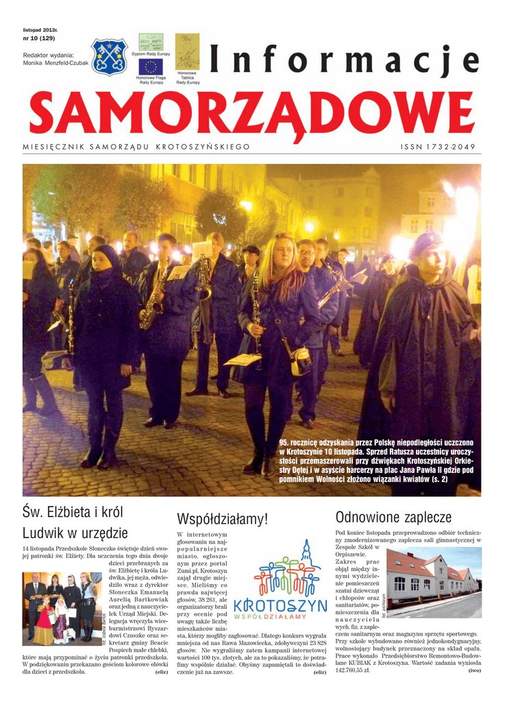 listopad 2013r. www.is.krotoszyn.pl nr 10 (129) 10 (129) Redaktor wydania: Monika Menzfeld-Czubak MIESIĘCZNIK SAMORZĄDU KROTOSZYŃSKIEGO I S S N 1 7 3 2 -2 0 4 9 95. rocznicê odzyskania przez Polskê niepodleg³oœci uczczono w Krotoszynie 10 listopada. Sprzed Ratusza uczestnicy uroczystoœci przemaszerowali przy dŸwiêkach Krotoszyñskiej Orkiestry Dêtej i w asyœcie harcerzy na plac Jana Paw³a II gdzie pod pomnikiem Wolnoœci z³o¿ono wi¹zanki kwiatów (s. 2) fot. Izabela Bartoœ 14 listopada Przedszkole Słoneczko świętuje dzień swojej patronki św. Elżiety. Dla uczczenia tego dnia dwoje dzieci przebranych za św. Elżbietę i króla Ludwika, jej męża, odwiedziło wraz z dyrektor Słoneczka Emanuelą Aurelią Bartkowiak oraz jedną z nauczycielek Urząd Miejski. Delegacja wręczyła wiceburmistrzowi Ryszardowi Czuszke oraz sekretarz gminy Beacie Pospiech małe chlebki, które mają przypominać o życiu patronki przedszkola. W podziękowaniu przekazano gościom kolorowe ołówki (eliz) dla dzieci z przedszkola. Wspó³dzia³amy! Odnowione zaplecze W internetowym głosowaniu na najpopularniejsze miasto, ogłoszonym przez portal Zumi.pl, Krotoszyn zajął drugie miejsce. Mieliśmy co prawda najwięcej głosów, 38 261, ale organizatorzy brali przy ocenie pod uwagę także liczbę mieszkańców miasta, którzy mogliby zagłosować. Dlatego konkurs wygrała mniejsza od nas Rawa Mazowiecka, zdobywczyni 23 828 głosów. Nie wygraliśmy zatem kampanii internetowej wartości 100 tys. złotych, ale za to pokazaliśmy, że potrafimy wspólnie działać. Obyśmy zapamiętali to doświad(eliz) czenie już na zawsze. Pod koniec listopada przeprowadzono odbiór techniczny zmodernizowanego zaplecza sali gimnastycznej w Zespole Szkół w Orpiszewie. Zakres prac objął między innymi wydzielenie pomieszczeń szatni dziewcząt i chłopców oraz sanitariatów, pomieszczenia dla nauczyciela wych. fiz. z zapleczem sanitarnym oraz magazynu sprzętu sportowego. Przy szkole wybudowano również jednokondygnacyjny, wolnostojący budynek przeznaczony na skład opału. Prace wykonało Przedsiębiorstwo Remontowo-Budowlane KUBIAK z Krotoszyna. Wartość zadania wyniosła 1 142.760,55 zł. (iwo) fot. archiwum Œw. El¿bieta i król Ludwik w urzêdzie 10 (129) 1 grudnia 2013 r. (niedziela) o godz. 19.00 w nowej salce koncertowej Krotoszyñskiego Oœrodka Kultury (ul. 56 Pu³ku Piechoty Wlkp. 18) wyst¹pi znany m.in. ze wspó³pracy z Pej¹ KROOLIK UNDERWOOD z zespo³em oraz zaproszeni goœcie: BNS, CARTMAN, KARZE£, K6, VALLY, SIGMA NGWM oraz DJ WLB. Dodatkowo wyst¹pi¹ krotoszyñscy B-Boy’e. Bilety na koncert w cenie 10 z³otych do nabycia w klubie Rivendell (Stowarzyszenie Twoja Alternatywa) oraz w KL Studio w Krotoszynie. Zamówienia pod numerem telefonu: 793 216 479 Do 3 grudnia w krotoszyñskim Muzeum Regionalnym mo¿na ogl¹daæ wystawê „Wrzesieñ 1939”. Krotoszyñski Oœrodek Kultury ju¿ po raz 22. organizuje Ogólnopolski Turniej Poetycki „Autoportret Jesienny” i serdecznie zaprasza wszystkich poetów powy¿ej 21. roku ¿ycia do udzia³u. Termin nadsy³ania wierszy mija 7 grudnia 2013 r. Regulamin dostêpny na stronie internetowej KOK-u. 6 grudnia o godz. 12.00 w sali reprezentacyjnej krotoszyñskiego Ratusza odbêdzie siê uroczysta sesja Rady Miejskiej zwi¹zana z nadaniem tytu³u "Honorowy Obywatel Krotoszyna" profesorowi W³adys³awowi Stró¿ewskiemu 8 grudnia na krotoszyñskim rynku w godz. od 9.00 do 15.00 odbêdzie siê IV Jarmark Œwi¹teczny organizowany przez Stowarzyszenie Szko³y na Parcelkach wraz ze Stowarzyszeniem „Krotoszyñskie Centrum Przedsiêbiorczoœci” (plakat - s.8). 16 grudnia o godz. 19.00 w herbaciarni Camellia na Ma³ym Rynku wyst¹pi Guillaume Maupin - wstêp wolny. Guillaume koncertuje na ca³ym œwiecie, wystêpuje w mieszkaniach i na wielkich scenach. Œpiewa od dziecka: covery, tradycyjne utwory francuskie i inne. Koncert na Facebooku: https://www.facebook.com/events/ 175727395959966/?source=1 Urz¹d Miejski w Krotoszynie Centrala Faks Punkt Informacyjny Sekretariat Burmistrza Biuro Rady Miejskiej Stra¿ Miejska (62) (62) (62) (62) (62) (62) (62) 725 725 722 722 722 722 722 42 34 74 74 74 74 74 01 36 58 14 51 07 57 Burmistrz Julian Jokœ przyjmuje interesantów we wtorki w godz. 15.30 – 16.30. Przewodnicz¹ca Rady Miejskiej Zofia Jamka przyjmuje interesantów we wtorki w godz. 14.00 – 15.00. Starostwo Powiatowe (62) 725 42 56 (62) 725 42 57 Powiatowy Urz¹d Pracy (62) 725 36 84 (62) 725 44 56 Komenda Powiatowa Policji w Krotoszynie (62) 725 52 00 Komenda Powiatowa Pañstwowej Stra¿y Po¿arnej (62) 725 29 21 (62) 725 29 22 Miejsko-Gminny Oœrodek Pomocy Spo³ecznej (62) 725 36 68 (62) 725 39 96 Urz¹d Skarbowy 2 95. rocznicê odzyskania przez Polskê niepodleg³oœci uczczono w Krotoszynie 10 listopada. Uroczystoœæ rozpoczê³a siê na krotoszyñskim Rynku o godz. 17.30 podniesieniem flagi pañstwowej na Ratuszu. O wydarzeniach sprzed 95 lat przypomnieli zgromadzonym historycy: dr Edward Jokiel, nauczyciel I LO oraz Piotr Mikołajczyk, dyrektor krotoszyńskiego muzeum. Uczestnicy uroczystości: poczty sztandarowe, władze samorządowe powiatu i gmin ościennych, reprezentanci organizacji politycznych i kombatanckich, przedstawiciele służb i jednostek organizacyjnych, delegacje młodzieży oraz mieszkańcy przemaszerowali przy dźwiękach Krotoszyńskiej Orkiestry Dętej i w asyście harcerzy na plac Jana Pawła II gdzie pod pomnikiem Wolności złożono wiązanki kwiatów. O godz. 18.00 w kościele św. Apostołów Piotra i Pawła odprawiona została msza św. w intencji Ojczyzny. Uroczystości patriotyczne zakończyły się w”Przedwiośniu”, gdzie dla publiczności wystąpił Zespół Tańca Ludowego”Krotoszanie”. (mm) Muzeum Regionalne w Krotoszynie serdecznie zaprasza na „Spotkania Gwiazdkowe”. Zajęcia adresowane są głównie dla dzieci przedszkolnych oraz uczniów szkół podstawowych i obejmują: • krotoszyńskie 