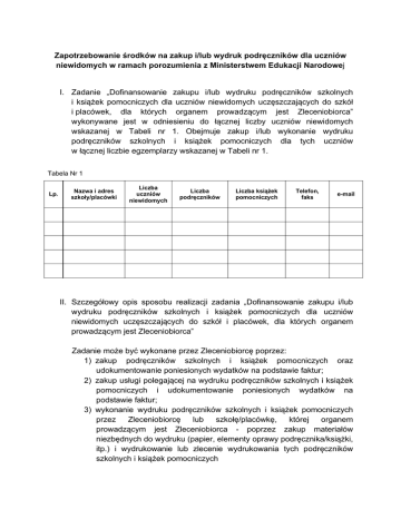 Zapotrzebowanie środków na zakup i/lub wydruk podręczników dla uczniów niewidomych w ramach porozumienia z Ministerstwem Edukacji Narodowej I. Zadanie „Dofinansowanie zakupu i/lub wydruku podręczników szkolnych i książek pomocniczych dla uczniów niewidomych uczęszczających do szkół i placówek, dla których organem prowadzącym jest Zleceniobiorca” wykonywane jest w odniesieniu do łącznej liczby uczniów niewidomych wskazanej w Tabeli nr 1. Obejmuje zakup i/lub wykonanie wydruku podręczników szkolnych i książek pomocniczych dla tych uczniów w łącznej liczbie egzemplarzy wskazanej w Tabeli nr 1. Tabela Nr 1 Lp. Nazwa i adres szkoły/placówki Liczba uczniów niewidomych Liczba podręczników Liczba książek pomocniczych Telefon, faks e-mail II. Szczegółowy opis sposobu realizacji zadania „Dofinansowanie zakupu i/lub wydruku podręczników szkolnych i książek pomocniczych dla uczniów niewidomych uczęszczających do szkół i placówek, dla których organem prowadzącym jest Zleceniobiorca” Zadanie może być wykonane przez Zleceniobiorcę poprzez: 1) zakup podręczników szkolnych i książek pomocniczych oraz udokumentowanie poniesionych wydatków na podstawie faktur; 2) zakup usługi polegającej na wydruku podręczników szkolnych i książek pomocniczych i udokumentowanie poniesionych wydatków na podstawie faktur; 3) wykonanie wydruku podręczników szkolnych i książek pomocniczych przez Zleceniobiorcę lub szkołę/placówkę, której organem prowadzącym jest Zleceniobiorca - poprzez zakup materiałów niezbędnych do wydruku (papier, elementy oprawy podręcznika/książki, itp.) i wydrukowanie lub zlecenie wydrukowania tych podręczników szkolnych i książek pomocniczych oraz udokumentowanie poniesionych wydatków na podstawie rachunków lub faktur; Dopuszcza się wykonanie zadania w części zgodnie z pkt 1, a w pozostałej części zgodnie z pkt 2 i/lub 3. III. Kalkulacja kosztów realizacji zadania „„Dofinansowanie zakupu i/lub wydruku podręczników szkolnych i książek pomocniczych dla uczniów niewidomych uczęszczających do szkół i placówek, dla których organem prowadzącym jest Zleceniobiorca” przedstawiona jest w Tabeli nr 2. Tabela nr 2 Koszt Liczba Koszt jednostkowy Jednostka jednostek całkowity w PLN Koszty programowe 1. Zakup podręczników podręcznik szkolnych i książek szkolny/książka pomocniczych pomocnicza 2. Zakup usługi, o której podręcznik mowa w cz. II pkt 1 szkolny/książka pomocnicza 3. Wykonanie wydruku, o którym mowa w cz. II pkt 2 poprzez:: 3.1 zakup materiałów niezbędnych do wydruku, w tym: 3.1.1 papier 3.1.2 elementy oprawy podręcznika/książki (np. bindy, okładki, teczki do wpinania map, itp.) 3.1.3 …………… 3.2 wydrukowanie podręcznik podręczników szkolny/książka szkolnych i książek pomocnicza pomocniczych Koszty zarządzania zadaniem - stanowiące maksymalnie 10% wartości otrzymanej przez Zleceniobiorcę dotacji 4. …………….. 5. ……………. 6. …………….. Razem: Lp. Kategoria kosztów