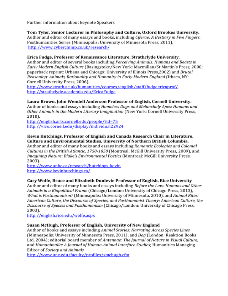 Further information about keynote Speakers Tom Tyler, Senior Lecturer in Philosophy and Culture, Oxford Brookes University. Author and editor of many essays and books, including Ciferae: A Bestiary in Five Fingers, Posthumanities Series (Minneapolis: University of Minnesota Press, 2011). http://www.cyberchimp.co.uk/research/ Erica Fudge, Professor of Renaissance Literature, Strathclyde University. Author and editor of several books including Perceiving Animals: Humans and Beasts in Early Modern English Culture (Basingstoke/New York: Macmillan/St Martin’s Press, 2000; paperback reprint: Urbana and Chicago: University of Illinois Press,2002) and Brutal Reasoning: Animals, Rationality and Humanity in Early Modern England (Ithaca, NY: Cornell University Press, 2006). http://www.strath.ac.uk/humanities/courses/english/staff/fudgeericaprof/ http://strathclyde.academia.edu/EricaFudge Laura Brown, John Wendell Anderson Professor of English, Cornell University. Author of books and essays including Homeless Dogs and Melancholy Apes: Humans and Other Animals in the Modern Literary Imagination (New York: Cornell University Press, 2010). http://english.arts.cornell.edu/people/?id=75 http://vivo.cornell.edu/display/individual22924 Kevin Hutchings, Professor of English and Canada Research Chair in Literature, Culture and Environmental Studies, University of Northern British Columbia. Author and editor of many books and essays including Romantic Ecologies and Colonial Cultures in the British Atlantic, 1750-1850 (Montreal: McGill University Press, 2009), and Imagining Nature: Blake’s Environmental Poetics (Montreal: McGill University Press, 2003). http://www.unbc.ca/research/hutchings-kevin http://www.kevinhutchings.ca/ Cary Wolfe, Bruce and Elizabeth Dunlevie Professor of English, Rice University Author and editor of many books and essays including Before the Law: Humans and Other Animals in a Biopolitical Frame (Chicago/London: University of Chicago Press, 2013), What is Posthumanism? (Minneapolis: University of Minnesota, 2010), and Animal Rites: American Culture, the Discourse of Species, and Posthumanist Theory: American Culture, the Discourse of Species and Posthumanism (Chicago/London: University of Chicago Press, 2003). http://english.rice.edu/wolfe.aspx Susan McHugh, Professor of English, University of New England Author of books and essays including Animal Stories: Narrating Across Species Lines (Minneapolis: University of Minnesota Press, 2011), and Dog (London: Reaktion Books Ltd, 2004); editorial board member of Antennae: The Journal of Nature in Visual Culture, and Humanimalia: A Journal of Human-Animal Interface Studies; Humanities Managing Editor of Society and Animals. http://www.une.edu/faculty/profiles/smchugh.cfm