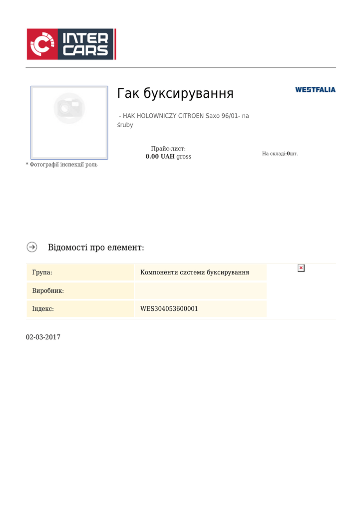 Гак буксирування - HAK HOLOWNICZY CITROEN Saxo 96/01- na śruby Прайс-лист: 0.00 UAH gross * Фотографії інспекції роль Відомості про елемент: Група: Компоненти системи буксирування Виробник: Індекс: 02-03-2017 WES304053600001 На складі:0шт.