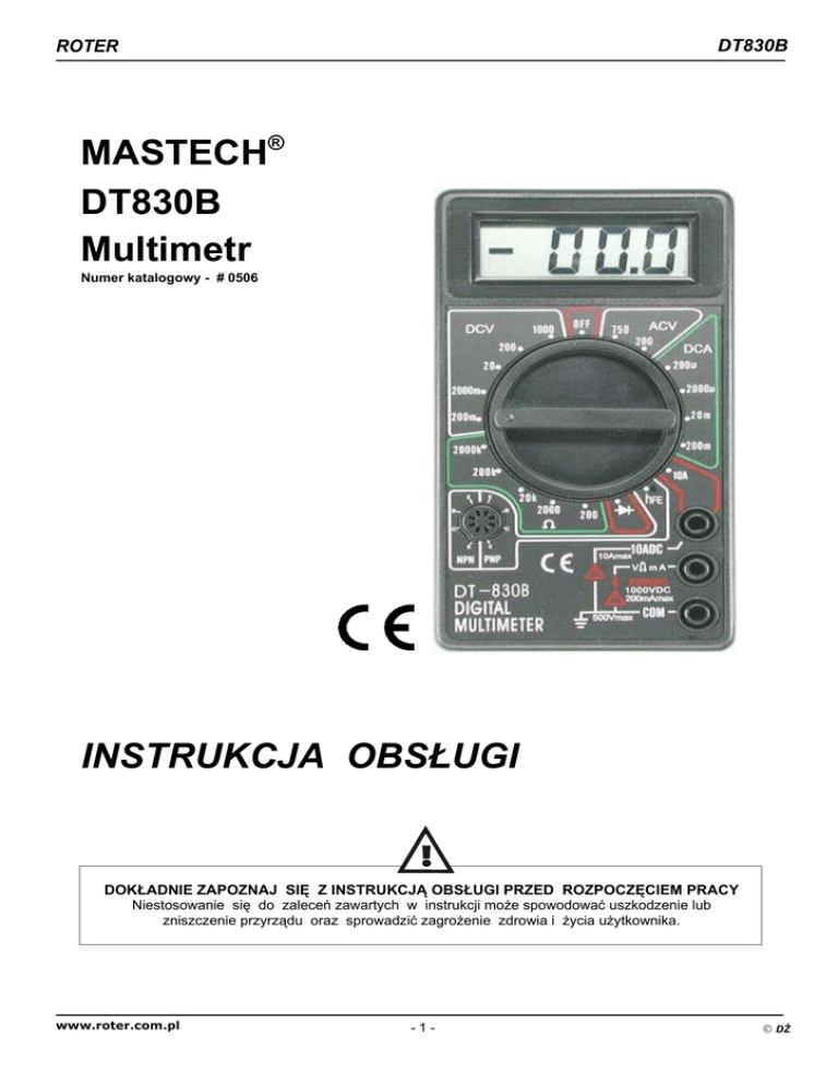 DT830B ROTER MASTECH® DT830B Multimetr Numer katalogowy - # 0506 INSTRUKCJA OBSŁUGI DOKŁADNIE ZAPOZNAJ SIĘ Z INSTRUKCJĄ OBSŁUGI PRZED ROZPOCZĘCIEM PRACY Niestosowanie się do zaleceń zawartych w instrukcji może spowodować uszkodzenie lub zniszczenie przyrządu oraz sprowadzić zagrożenie zdrowia i życia użytkownika. www.roter.com.pl -1- Ó DŻ DT830B ROTER Bezpieczeństwo użytkowania Dziękujemy za zakup miernika DT830B. Dla bezpieczeństwa zalecamy zapoznanie się z instrukcją obsługi. Szczególnie ważne są fragmenty dotyczące BEZPIECZEŃSTWA OBSŁUGI oraz METOD POMIARU. Proszę przechowywać INSTRUKCJĘ OBSŁUGI razem z miernikiem i nie zgubić jej. Multimetr DT830B został zaprojektowany zgodnie z IEC-1010, kategorią bezpieczeństwa CATII oraz stopniem ochrony środowiska 2. Stosowane symbole bezpieczeństwa Oznaczenie ważnej bezpieczeństwa informacji. dla UWAGA ! Niebezpieczeństwo wysokiego napięcia. Uziemienie zacisk / gniazdo uziemienia. Podwójna izolacja. Bezpiecznik - wymiana na inny tylko o parametrach podanych w instrukcji. Nigdy nie zwierać bezpiecznika. Pełna zgodność ze standardami bezpieczeństwa jest gwarantowana tylko, gdy używane są dostarczone w komplecie przewody pomiarowe. W wypadku uszkodzenia przewody powinny być wymienione na ten sam model lub przewody o takich samych parametrach elektrycznych. = Nie używać uszkodzonych przewodów pomiarowych. Nie dotykać końcówek i gniazd pomiarowych podczas pomiaru. Nie wykonywać pomiarów mokrymi rękami oraz w miejscach o dużej wilgotności. Niestosowanie się do zaleceń grozi porażeniem prądem. = Nie wolno przekraczać wartości granicznych wielkości elektrycznych podanych dla każdego zakresu pomiarowego. Gdy nie jest znana skala mierzonej wielkości elektrycznej należy do pomiaru wybrać najwyższy zakres. = Należy odłączyć sondy pomiarowe od mierzonego obwodu przed zmianą zakresu przełącznikiem. = W gniazdach pomiarowych miernika [ np. hFE, Cm, °C ] nie mogą znajdować się elementy elektroniczne gdy sondami pomiarowymi jest mierzone napięcie . = Przed pomiarem tranzystora upewnić się, że odłączono sondy pomiarowe od innego mierzonego obwodu. Przed pomiarem rezystancji lub ciągłości obwodu należy rozładować pojemności oraz odłączyć wszystkie źródła zasilania. = Zachować szczególną ostrożność przy pomiarach powyżej 60VDC lub 30 VACrms = DT830B – to przenośny multimetr do pomiarów V AC/DC, A DC, R, diody, tranzystorów. Wyposażony w wyświetlacz LCD, 3 ½ cyfry. 1 2 6 5 1. 2. 3. 4. Wyświetlacz LCD, 3 ½ cyfry; H:13mm Przełącznik funkcji i zakresów Gniazdo COM : gniazdo pomiarowe, czarny przewód “ - “ Gniazdo wejściowe : VΩmA, czerwony przewód “ + “, pomiar V, A (oprócz zakresu 10A), R. 5. Gniazdo 10A : gniazdo pomiarowe dla zkresu 10A, czerwony przewód “ + “ 6. Gniazdo pomiaru tranzystora. Przełącznik funkcji i zakresów ( 2 ) – obrotowy przełącznik wyboru. W Pozycji OFF – miernik jest wyłączony. 4 3 www.roter.com.pl -2- Ó DŻ DT830B ROTER Gniazda pomiarowe – miernik ma trzy gniazda pomiarowe, dwa zabezpieczone przed przekroczeniem zakresów pomiarowych. Podczas używania czarny przewód należy przyłączyć do gniazda COM a czerwony do gniazda VΩmA lub 10A (bez zabezpieczenia). Wielkość mierzona czerwonym przewodem zależy od wybranej przełącznikiem funkcji. Dokładności pomiarów są podane dla okresu jednego roku po kalibracji oraz dla temperatury pracy 18°C do 28°C (64°F do 82°F) dla wilgotności RH75%. DANE TECHNICZNE Napięcie maksymalne pomiędzy gniazdem a uziemieniem : CAT II 500V (szczytowe) Bezpiecznik : F200mA / 250V Zasilanie : bateria 9V, 6F22 lub Neda1604 Wyświetlacz : LCD, cyfry 1999, odświeżanie 2-3 sekundy Metoda pomiarowa : przetwornik A/C (podwójne całkowanie zbocza) Wskaźnik przekroczenia zakresu : “ 1 “ - na wyświetlaczu Wskaźnik polaryzacji : “- “ dla ujemnej polaryzacji Temperatura pracy : 0°C – 40°C ( 32°F – 104°F) Temperatura przechowywania : -10°C – 50°C ( 14°F – 122°F) Wskaźnik rozładowania baterii : “ BAT “ na wyświetlaczu Wymiary / waga : H:22 x W:69 x L:124 [mm] / 150g (wraz z baterią) OBSŁUGA Pomiar prądu A DC 1. Ustawić przełącznik zakresów na odpowiedni zakres DCA. Czerwony przewód pomiarowy załączyć do gniazda VΩmA (do 200mA, dla prądu ponad 200mA do 10A właściwe jest gniazdo 10A) a czarny do gniazda COM. 2. Wpiąć przewody pomiarowe szeregowo w mierzony obwód. 3. Odczytać wartość na wyświetlaczu (pokazana polaryzacja czerwonego przewodu pomiarowego). Zakres Rozdzielczość Dokładność Zabezpieczenie przeciążeniowe : 200μA 100nA Bezpiecznik : F200mA/250V 2mA 1μA ±1,0% wskazania ±2 cyfry Zakres 10A – niezabezpieczony. Spadek napięcia : 200mV 10μA 20mA 200mA 100μA ±1,2% wskazania ±2 cyfry 10A 10mA ±2,0% wskazania ±2 cyfry Pomiar napięcia V DC i V AC 1. Ustawić przełącznik zakresów na odpowiedni zakres DCV lub ACV (jeżeli nie znamy wielkości napięcia mierzonego – wybrać największy zakres). Czerwony przewód pomiarowy załączyć do gniazda VΩmA a czarny do gniazda COM. 2. Wpiąć przewody pomiarowe równolegle w mierzony obwód. 3. Odczytać wartość na wyświetlaczu (pokazana polaryzacja czerwonego przewodu pomiarowego). Zabezpieczenie przeciążeniowe : Zakres Rozdzielczość Dokładność 250Vrms – dla zakresu 200mV 100μV 200mV DC 1000VDC lub 750VACrms - inne 2V DC 1mV ±0,5% wskazania ±2 cyfry zakresy 20V DC 10mV 200V DC 100mV 1000V DC 1V ±0,8% wskazania ±2 cyfry Częstotliwość : 45Hz – 450Hz 200V AC 100mV ±1,2% wskazania ±10 cyfr Wartość średnia rms (sinus). ±1,2% wskazania ±10 cyfr 750V AC 1V Test tranzystora hFE. Włożyć końcówki tranzystora 1. Ustawić przełącznik zakresów miernika na pozycję odpowiednio (ECBE)( PNP / NPN ) do gniazda pomiarowego. 2. Odczytać przybliżoną wartość hFE ( Ib=10μA / Vce=2,8V) Uwaga : Przed pomiarem odłączyć 