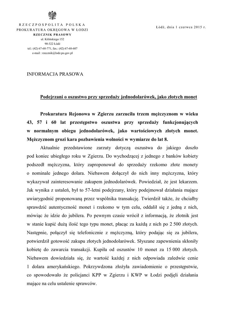 RZECZPOSPOLITA POLSKA PROKURATURA OKRĘGOWA W ŁODZI Łódź, dnia 1 czerwca 2015 r. RZE CZNIK P RASOWY ul. Kilińskiego 152 90-322 Łódź tel.: (42) 67-68-771, fax.: (42) 67-68-607 e-mail : [email protected] INFORMACJA PRASOWA Podejrzani o oszustwo przy sprzedaży jednodolarówek, jako złotych monet Prokuratura Rejonowa w Zgierzu zarzuciła trzem mężczyznom w wieku 43, 57 i 60 lat przestępstwo oszustwa przy sprzedaży funkcjonujących w normalnym obiegu jednodolarówek, jako wartościowych złotych monet. Mężczyznom grozi kara pozbawienia wolności w wymiarze do lat 8. Aktualnie przedstawione zarzuty dotyczą oszustwa do jakiego doszło pod koniec ubiegłego roku w Zgierzu. Do wychodzącej z jednego z banków kobiety podszedł mężczyzna, który zaproponował do sprzedaży rzekomo złote monety o nominale jednego dolara. Niebawem dołączył do nich inny mężczyzna, który wykazywał zainteresowanie zakupem jednodolarówek. Powiedział, że jest lekarzem. Jak wynika z ustaleń, był to 57-letni podejrzany, który podejmował działania mające uwiarygodnić proponowaną przez wspólnika transakcję. Twierdził także, że chciałby sprawdzić autentyczność monet i rzekomo w tym celu, oddalił się z jedną z nich, mówiąc że idzie do jubilera. Po pewnym czasie wrócił z informacją, że złotnik jest w stanie kupić dużą ilość tego typu monet, płacąc za każdą z nich po 2 500 złotych. Następnie, połączył się telefonicznie z mężczyzną, który podając się za jubilera, potwierdził gotowość zakupu złotych jednodolarówek. Słyszane zapewnienia skłoniły kobietę do zawarcia transakcji. Kupiła od oszustów 10 monet za 15 000 złotych. Niebawem dowiedziała się, że wartość każdej z nich odpowiada zaledwie cenie 1 dolara amerykańskiego. Pokrzywdzona złożyła zawiadomienie o przestępstwie, co spowodowało że policjanci KPP w Zgierzu i KWP w Łodzi podjęli działania mające na celu ustalenie sprawców. 2 Okazało się, że na terenie Polski, taką samą metodą oszukano także inne osoby. W ten sposób w Ciechanowie pokrzywdzony stracił 52 500 złotych, w Częstochowie 35 000 złotych i w Grodzisku Mazowieckim także 15 000 złotych. W dniu 28 maja br. w jednym z hoteli na terenie województwa kujawsko-pomorskiego zatrzymanych zostało trzech mężczyzn w wieku 43, 57 i 60 lat. Usłyszeli oni zarzuty dotyczące oszustwa, do jakiego doszło w Zgierzu. Prawdopodobne jest jednakże, że ulegną one poszerzeniu o przestępstwa popełnione w innych częściach kraju. W procederze mogły brać udział także inne osoby. Podczas zatrzymania podejrzanych zabezpieczono przy nich 88 monet o nominale jednego dolara, a także kilka telefonów komórkowych oraz pieczątki z napisem „JUBILER SKUP-SPRZEDAŻ ZŁOTA” – prawdopodobnie służące do popełniania przestępstw. Mieli również przy sobie 57 000 złotych. Na wniosek zgierskiej prokuratury, karany wcześniej 57-latek został tymczasowo aresztowany. Co do pozostałych podejrzanych prokurator zastosował policyjne dozory i poręczenia majątkowe. Rzecznik Prasowy Prokuratury Okręgowej w Łodzi Krzysztof Kopania