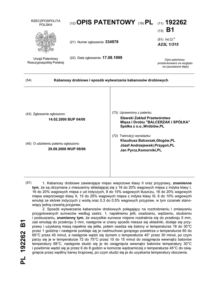 RZECZPOSPOLITA POLSKA (12) OPIS PATENTOWY (19) PL (51) Int.Cl.8 (21) Numer zgłoszenia: 334978 Urząd Patentowy Rzeczypospolitej Polskiej (54) 192262 (13) B1 (11) A23L 1/315 (22) Data zgłoszenia: 17.08.1999 Opis patentowy przedrukowano ze względu na zauważone błędy Kabanosy drobiowe i sposób wytwarzania kabanosów drobiowych (43) Zgłoszenie ogłoszono: 14.02.2000 BUP 04/00 (73) Uprawniony z patentu: Sławski Zakład Przetwórstwa Mięsa i Drobiu "BALCERZAK I SPÓŁKA" Spółka z o.o.,Wróblów,PL (72) Twórca(y) wynalazku: (45) O udzieleniu patentu ogłoszono: 29.09.2006 WUP 09/06 PL 192262 B1 (57) Klaudiusz Balcerzak,Głogów,PL Józef Andrzejewski,Przygoń,PL Jan Pyrcz,Komorniki,PL 1. Kabanosy drobiowe zawierające mięso wieprzowe klasy II oraz przyprawy, znamienne tym, że są otrzymane z mieszaniny składającej się z 16 do 20% wagowych mięsa z indyka klasy I, 16 do 20% wagowych mięsa z ud indyczych, 8 do 15% wagowych tłuszczu, 16 do 20% wagowych mięsa wieprzowego klasy II, 15 do 25% wagowych mięsa z indyka klasy III, 6 do 10% wagowych emulsji ze skórek indyczych z wodą oraz 0,3 do 0,5% wagowych przypraw, w tym czosnek stanowiący jedną czwartą przypraw. 2. Sposób wytwarzania kabanosów drobiowych polegający na rozdrobnieniu i zmieszaniu przygotowanych surowców według zastrz. 1, napełnieniu jelit, osadzaniu, wędzeniu, studzeniu i podsuszaniu, znamienny tym, że wszystkie surowce mięsne rozdrabnia się do przekroju 5 mm, zaś emulsję do przekroju 3 mm, następnie w znany sposób miesza się składniki, dodaje się przyprawy i uzyskaną masą napełnia się jelita, potem osadza się batony w temperaturze 18 do 30°C przez 1 godzinę i następnie poddaje się je nadmuchowi gorącego powietrza o temperaturze 60 do 65°C przez 45 minut, a następnie wędzi się dymem o temperaturze 45° przez 30 minut, po czym parzy się je w temperaturze 72 do 75°C przez 10 do 15 minut do osiągnięcia wewnątrz batonów temperatury 68°C, następnie studzi się je do osiągnięcia wewnątrz batonów temperatury 30°C i powtórnie wędzi się je przez 6 do 8 godzin w komorze wędzarniczej o temperaturze 45°C do osiągnięcia przez wędliny barwy brązowej, po czym studzi się je do uzyskania temperatury otoczenia. 2 PL 192 262 B1 Opis wynalazku Przedmiotem wynalazku są kabanosy drobiowe i sposób wytwarzania kabanosów drobiowych. Znane są kabanosy wieprzowe o recepturze opracowanej przez Centralę Przemysłu Mięsnego, zawartej w zbiorze dokumentacji technologicznej pt. „Wędliny i wyroby wędliniarskie”, Przepisy wewnętrzne nr 21, Warszawa 1964 r. W skład kabanosów wchodzi peklowana wieprzowina klasy I w ilości 40 do 45% wagowych, peklowana wieprzowina klasy II w ilości 55 do 60% wagowych oraz sól warzonka, cukier, gałka muszkatołowa i pieprz - stanowiące przyprawy w ilości 0,5 do 0,7% wagowo. Znany sposób wytwarzania kabanosów wieprzowych, podany w przytoczonych wyżej Przepisach wewnętrznych nr 21, polega na rozdrobnieniu wieprzowiny klasy I do przekroju 8 mm, a wieprzowiny klasy II do przekroju 5 mm. Oba te rodzaje wieprzowiny miesza się ze sobą, dodaje przyprawy i uzyskaną masą napełnia się jelita, po czym osadza się batony w pomieszczeniu o temperaturze od 2 do 6°C przez 12 godzin, a następnie wędzi się gorącym dymem i piecze się przez około 70 do 90 minut, potem kabanosy studzi się i podsusza w temperaturze 12 do 18°C przez 5 do 7 dni. Kabanosy drobiowe według wynalazku są otrzymane z mieszaniny składającej się z 16 do 20% wagowych mięsa z indyka klasy I, 16 do 20% wagowych mięsa z ud indyczych, 8 do 15% wagowych tłuszczu, 16 do 20% wagowych mięsa wieprzowego klasy II, 15 do 25% wagowych mięsa z indyka klasy III, 6 do 10% wagowych emulsji ze skórek indyczych z wodą oraz 0,3 do 0,5% wagowych przypraw, w tym czosnek stanowiący jedną czwartą przypraw. Sposób wytwarzania kabanosów drobiowych polegający na rozdrobnieniu i zmieszaniu przygotowanych surowców, dodaniu przypraw, napełnieniu jelit, osadzeniu, wędzeniu, studzeniu i podsuszaniu, charakteryzuje się tym, że wszystkie surowce mięsne są rozdrabniane do przekroju 5 mm, zaś emulsja do przekroju 3 mm. Następnie w znany sposób miesza się składniki, dodaje się przyprawy i napełnia się jelita. Potem osadza się batony w temperaturze 18 do 30°C przez 1 godzinę i następnie poddaje się je podmuchowi gorącego powietrza o temperaturze 60 do 65°C przez 45 minut, a następnie wędzi się je dymem o temperaturze 45°C, potem parzy się je w temperaturze 72 do 75°C przez 10 do 15 minut do osiągnięcia wewnątrz temperatury 68°C. Następnie studzi się batony do osiągnięcia wewnątrz batonów temperatury 30°C i powtórnie wędzi się przez 6 do 8 godzin w komorze wędzarniczej o temperaturze 45°C do osiągnięcia przez wędliny barwy brązowej, po czym studzi się je do uzyskania temperatury otoczenia. Kabanosy drobiowe są wyrobem nowym, dotychczas nie wytwarzanym, o smaku i zapachu charakterystycznym dla kiełbas podsuszanych z mięsa drobiowego. Kabanosy drobiowe wytworzone sposobem według wynalazku charakteryzują się, po zastosowaniu procesu parzenia, zachowaniem cech sensorycznych i odżywczych mięsa drobiowego. Modyfikacja obróbki cieplnej, w odniesieniu do kabanosów wieprzowych, pozwoliła na wydatne skrócenie czasu dojrzewania wyrobu - z 5 do 7 dni dla kabanosów wieprzowych - do 24 godzin w przypadku kabanosów drobiowych. Skrócenie cyklu produkcyjnego umożliwia wzrost efektywności procesu wytwarzania. Przedmiot wynalazku przedstawiono w przykładzie wykonania Receptura: 1. Mięso z indyka klasy I 2. Mięso z ud indyczych 3. Tłuszcz 4. Mięso wieprzowe klasy II 5. Mięso z indyka klasy III 6. Emulsja 7. Przyprawy 8. Czosnek Razem - 18 kg 18 kg 14,6 kg 17 kg 24 kg 8 kg 0,3 kg 0,1 kg 100 kg Zgodnie ze sposobem według wynalazku wszystkie surowce mięsne rozdrabnia się do przekroju 5 mm a emulsję do przekroju 3 mm Następnie miesza si