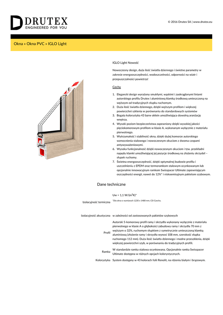 © 2016 Drutex SA | www.drutex.eu Okna » Okna PVC » IGLO Light IGLO Light Nowość Nowoczesny design, duża ilość światła dziennego i świetne parametry w zakresie energooszczędności, wodoszczelności, odporności na wiatr i przepuszczalności powietrza! Cechy 1. Elegancki design wyrażony smukłymi, wąskimi i zaokrąglonymi liniami 2. 3. 4. 5. 6. autorskiego profilu Drutex i aluminiową klamką środkową umieszczoną na węższym od tradycyjnych słupku ruchomym. Duża ilość światła dziennego, dzięki węższym profilom i większej powierzchni szklenia w porównaniu do standardowych systemów Bogata kolorystyka 43 barw oklein umożliwiająca dowolną aranżację wnętrza. Wysoki poziom bezpieczeństwa zapewniony dzięki wysokiej jakości pięciokomorowym profilom w klasie A, wykonanym wyłącznie z materiału pierwotnego. Wytrzymałość i stabilność okna, dzięki dużej komorze autorskiego wzmocnienia stalowego i nowoczesnym okuciom z dwoma czopami antywyważeniowymi. Wysoka funkcjonalność dzięki nowoczesnym okuciom i tzw. przekładni napędu klamki umożliwiającej jej pozycje środkową na złożeniu skrzydeł – słupek ruchomy. 7. Świetna energooszczędność, dzięki optymalnej budowie profilu i uszczelnieniu z EPDM oraz termoramkom stalowym ocynkowanym lub opcjonalnie innowacyjnym ramkom Swisspacer Ultimate zapewniającym oszczędności energii, nawet do 12%* i niskoemisyjnym pakietom szybowym. Dane techniczne Uw = 1,1 W/(m2K)* Izolacyjność termiczna *Dla okna o wymiarach 1230 x 1480 mm, CSI Czechy. Izolacyjność akustyczna w zależności od zastosowanych pakietów szybowych Autorski 5-komorowy profil ramy i skrzydła wykonany wyłącznie z materiału pierwotnego w klasie A o głębokości zabudowy ramy i skrzydła 70 mm z węższym o 32%, ruchomym słupkiem z symetrycznie umieszczoną klamką Profil aluminiową (złożenie ramy i skrzydła wynosi 108 mm, szerokość słupka ruchomego 112 mm). Duża ilość światła dziennego i modne przeszklenia, dzięki większej powierzchni szyb, w porównaniu do tradycyjnych profili. Ramka W standardzie ramka stalowa ocynkowana. Opcjonalnie ramka Swisspacer Ultimate dostępna w różnych opcjach kolorystycznych. Kolorystyka System dostępny w 43 kolorach folii Renolit, na rdzeniu białym i brązowym. Innowacyjny, autorski sposób ułożenia wzmocnienia w komorze wpływający na statykę i stabilność systemu. Duża komora wzmocnienia w porównaniu do tego rodzaju systemów dostępnych na rynku - zbrojenie stalowe o wymiarach 35 mm x 24 mm x 2 mm. W standardzie wzmocnienie ramy i skrzydła - stalowe w kształcie „ceownika” . Wzmocnienie Możliwość zastosowania wzmocnienia pełnego w ościeżnicy. W przypadku wzmocnienia pełnego zaczepy anywyważeniowe przykręcone do stali. Okno wyposażone w system podwójnego uszczelnienia: zewnętrzne, Uszczelnienie wewnętrzne z EPDM dostępne są w kolorach: czarnym, szarym i grafitowym. W standardzie uszczelka wypełniająca dolny rowek okuciowy. Grubość szklenia do 36 mm. W standardzie pakiet szybowy jednokomorowy o współczynniku przenikania ciepła Ug = 1,0 W/(m2K) wg PN-EN674. Szyby Możliwość zastosowania pakietów o współczynniku Ug = 0,7 W/(m2K). Możliwość zastosowania szyb o podwyższonej izolacyjności akustycznej, hartowanych, bezpiecznych, antywłamaniowych, ornamentowych, przeciwsłonecznych. MACO MULTI MATIC KS z dwoma zaczepami antywyważeniowymi w standardzie powłoka Silber-Look oraz liniowe zagłębienia na zasuwnicach i opcjonalnie dostępne zawiasy ukryte we wrębie okuciowym; okno wyposażone w blokadę błędnego położenia klamki i podnośnik skrzydła*, mikrowentylacja w rozwórce**. Nowoczesne okucia twin-fit umożliwiające podwójny uchył okna za Okucia pomocą jednego ruchu klamki. *W zależności od wysokości okna **dla okien uchylno-rozwiernych