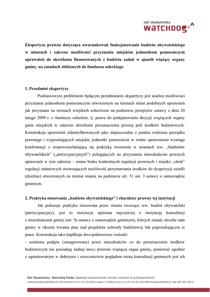Ekspertyza prawna dotycząca uwarunkowań funkcjonowania budżetu obywatelskiego w miastach i zakresu możliwości przyznania miejskim jednostkom pomocniczym uprawnień do określania finansowanych z budżetu zadań w sposób wiążący organy gminy, na zasadach zbliżonych do funduszu sołeckiego 1. Przedmiot ekspertyzy Podstawowym problemem będącym przedmiotem ekspertyzy jest analiza możliwości przyznania jednostkom pomocniczym utworzonym na terenach miast podobnych uprawnień jak przyznane na terenach wiejskich sołectwom na podstawie przepisów ustawy z dnia 20 lutego 2009 r. o funduszu sołeckim, tj. prawa do podejmowania decyzji wiążących organy gmin miejskich w zakresie określenia przeznaczenia pewnej puli środków budżetowych. Konstrukcja uprawnień zidentyfikowanych jako dopuszczalne z punktu widzenia porządku prawnego i wyposażających miejskie jednostki pomocnicze w realne uprawnienia wymaga konfrontacji z rozpowszechniającą się praktyką tworzenia w miastach tzw. „budżetów obywatelskich” („partycypacyjnych”) polegających na przyznaniu mieszkańcom pewnych uprawnień w tym zakresie – mimo braku konkretnych regulacji prawnych i niejako „obok” regulacji statutowych stwarzających możliwość przyznawania środków do dyspozycji osiedli (dzielnic) utworzonych na terenie miasta na podstawie art. 51 ust. 3 ustawy o samorządzie gminnym. 2. Praktyka stosowania „budżetu obywatelskiego” i charakter prawny tej instytucji Jak pokazuje praktyka stosowana przez miasta tworzące tzw. budżet obywatelski (partycypacyjny), jest to instytucja opierana najczęściej o instytucję konsultacji z mieszkańcami gminy (art. 5a ustawy o samorządzie gminnym), których zasady określa rada gminy w okresie trwania prac nad projektem uchwały budżetowej lub poprzedzającym te prace. Konstrukcja taka implikuje dwa podstawowe wnioski: - ustalenia podjęte (zasugerowane) przez mieszkańców co do przeznaczenia środków budżetowych nie posiadają żadnej mocy prawnie wiążącej organ gminy, ponieważ zgodnie z ugruntowanym w doktrynie i orzecznictwie poglądem istotą konsultacji gminnych jest ich niewiążący charakter. Za cel konsultacji przyjmuje się uzyskanie opinii społeczności na dany temat, w związku z czym nie przyznaje się im charakteru wiążącego, - uzasadnione wątpliwości wzbudza zagadnienie decydowania przez radę gminy – bez wyraźnego upoważnienia ustawowego – o rozpoczęciu konsultacji w sprawie określenia przez mieszkańców proponowanego kształtu części projektowanego budżetu. Wyłączna inicjatywa w sprawie sporządzenia projektu uchwały budżetowej należy do organu wykonawczego gminy (art. 233 pkt 1 ustawy o finansach publicznych). O ile sam tryb konsultacji nie ma cech wiążących organ wykonawczy, o tyle wątpliwości wzbudza wskazywanie w uchwałach w sprawie konsultacji (lub stanowiących załącznik do nich tzw. „regulaminach” czy „harmonogramach” budżetu obywatelskiego) o obowiązku uwzględnienia w projekcie budżetu przez burmistrza (prezydenta miasta) tych projektów zgłoszonych przez mieszkańców, które uzyskają największą liczbę głosów. Tego typu rozwiązania budzą nadal wątpliwości, mimo ewolucji przepisu określającego wyłączne kompetencje organu wykonawczego gminy na etapie opracowywania pierwszej wersji projektu budżetu. Przepisu ten zawarty obecnie w art. 233 pkt 1 u.f.p. wskazuje, że organowi wykonawczemu przysługuje wyłączne prawo „inicjatywy w sprawie sporządzenia projektu uchwały budżetowej”, zaś poprzedzający go art. 179 u.f.p. z 2005 r. stanowił, że do wyłącznej kompetencji zarządu j.s.t. należy „przygotowanie projektu uchwały budżetowej”. Wynika stąd, że nadal rada gminy nie ma uprawnień do wszczęcia prac nad projektem. Rozpoczęcie prac może rozpocząć się wyłącznie z inicjatywy organu wykonawczego. Również ostateczne jego sporządzenie należy do tego organu, a nie np. do rady gminy. Niejasny jest zatem cel przedstawionej zmiany, gdyż ustawodawca nie wypowiedział się na ten temat w uzasadnieniu. Jego obecne brzmienie nie wyklucza oczywiście, a nawet wskazuje na większą możliwość udziału innych podmiotów w procesie opracowywania pierwszej wersji projektu uchwały budżetowej. Udział ten nie może jednakże polegać na wykonaniu czynności zastrzeżonych ustawą dla organu wykonawczego. Nie ma wyraźnych przeszkód prawnych, aby uczestnictwo to polegało na merytorycznym wpływie na kształt postanowień projektu w sposób niewiążący organu sporządzającego projekt, a w ograniczonym – lecz ściśle określonym prawem – zakresie było ono także instrumentem współdecydowania o kształcie przyjętych postanowień. Niezbędne wydaje się zatem stworzenie ustawowego upoważnienia (jak w przypadku funduszu sołeckiego), na mocy którego podejmowane byłyby działania ograniczające w jakikolwiek sposób swobodę decydowania organu wykonawczego o kształcie projektu. Stosowne rozwiązanie wprowadzone w formie przepisu ustawy byłoby zarówno prawną gwarancją dla mieszkańców (miejskich jednostek pomocniczych) uwzględnienia ich decyzji w projekcie, jak i prawną podstawą do uczestnictwa innych podmiotów w procesie określania postanowień pierwotnej wersji projektu uchwały budżetowej. Żaden z tych elementów nie znajduje dostatecznego umocowania przy zastosowaniu trybu konsultacji z mieszkańcami, o których mowa w art. 5a u.s.g. O ile brak regulacji prawnych nadających charakter wiążący organy gminy decyzjom mieszkańców miast w sprawie określenia zadań do realizacji uniemożliwia bezwzględnie nadanie tym decyzjom takiej cechy na podstawie aktów wydawanych przez organy gminy, o tyle dla zorganizowania „budżetu obywatelskiego” można znaleźć rozwiązanie niebudzące wątpliwości z punktu widzenia problemu ingerencji rady gminy w prace nad projektem uchwały budżetowej. Ingerencji takiej można bowiem