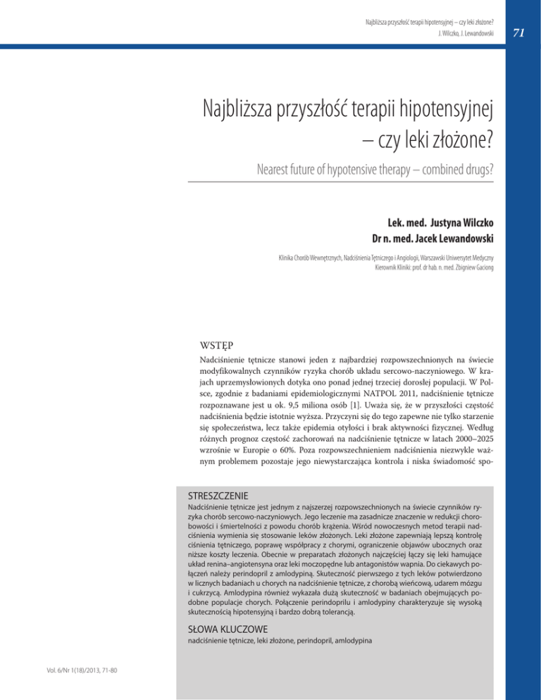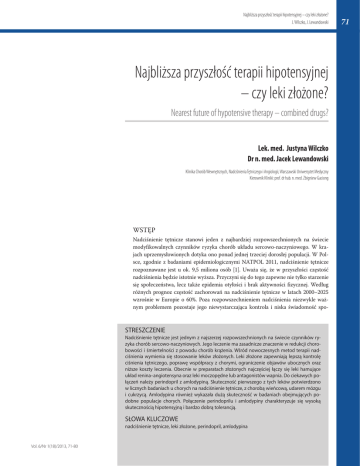 Najbliższa przyszłość terapii hipotensyjnej – czy leki złożone? J. Wilczko, J. Lewandowski Najbliższa przyszłość terapii hipotensyjnej – czy leki złożone? Nearest future of hypotensive therapy – combined drugs? Lek. med. Justyna Wilczko Dr n. med. Jacek Lewandowski Klinika Chorób Wewnętrznych, Nadciśnienia Tętniczego i Angiologii, Warszawski Uniwersytet Medyczny Kierownik Kliniki: prof. dr hab. n. med. Zbigniew Gaciong WSTĘP Nadciśnienie tętnicze stanowi jeden z najbardziej rozpowszechnionych na świecie modyfikowalnych czynników ryzyka chorób układu sercowo-naczyniowego. W krajach uprzemysłowionych dotyka ono ponad jednej trzeciej dorosłej populacji. W Polsce, zgodnie z badaniami epidemiologicznymi NATPOL 2011, nadciśnienie tętnicze rozpoznawane jest u ok. 9,5 miliona osób [1]. Uważa się, że w przyszłości częstość nadciśnienia będzie istotnie wyższa. Przyczyni się do tego zapewne nie tylko starzenie się społeczeństwa, lecz także epidemia otyłości i brak aktywności fizycznej. Według różnych prognoz częstość zachorowań na nadciśnienie tętnicze w latach 2000–2025 wzrośnie w Europie o 60%. Poza rozpowszechnieniem nadciśnienia niezwykle ważnym problemem pozostaje jego niewystarczająca kontrola i niska świadomość spo- STRESZCZENIE Nadciśnienie tętnicze jest jednym z najszerzej rozpowszechnionych na świecie czynników ryzyka chorób sercowo-naczyniowych. Jego leczenie ma zasadnicze znaczenie w redukcji chorobowości i śmiertelności z powodu chorób krążenia. Wśród nowoczesnych metod terapii nadciśnienia wymienia się stosowanie leków złożonych. Leki złożone zapewniają lepszą kontrolę ciśnienia tętniczego, poprawę współpracy z chorymi, ograniczenie objawów ubocznych oraz niższe koszty leczenia. Obecnie w preparatach złożonych najczęściej łączy się leki hamujące układ renina–angiotensyna oraz leki moczopędne lub antagonistów wapnia. Do ciekawych połączeń należy perindopril z amlodypiną. Skuteczność pierwszego z tych leków potwierdzono w licznych badaniach u chorych na nadciśnienie tętnicze, z chorobą wieńcową, udarem mózgu i cukrzycą. Amlodypina również wykazała dużą skuteczność w badaniach obejmujących podobne populacje chorych. Połączenie perindoprilu i amlodypiny charakteryzuje się wysoką skutecznością hipotensyjną i bardzo dobrą tolerancją. SŁOWA KLUCZOWE nadciśnienie tętnicze, leki złożone, perindopril, amlodypina Vol. 6/Nr 1(18)/2013, 71-80 71 72 Najbliższa przyszłość terapii hipotensyjnej – czy leki złożone? J. Wilczko, J. Lewandowski łeczna związanych z nim powikłań. W badaniu NATPOL 2011 wykazano, że aż 30% Polaków z nadciśnieniem tętniczym nie wie o swojej chorobie, kolejne 9% mimo świadomości choroby nie leczy się, natomiast spośród otrzymujących terapię aż 36% jest leczonych nieskutecznie i zaledwie 26% osiąga sukces terapeutyczny. Na tle innych krajów wskaźniki te są wciąż niskie [2]. Lepsze wyniki osiąga się m.in. w USA i Kanadzie, gdzie odsetek pacjentów skutecznie leczonych z powodu nadciśnienia tętniczego wynosi odpowiednio 53% i 36% [2]. PRZYCZYNY NIEDOSTATECZNEJ KONTROLI CIŚNIENIA TĘTNICZEGO Tradycyjnie wymienia się trzy główne rodzaje przyczyn niepowodzenia terapii hipotensyjnej: 1. zależne od postępowania lekarskiego, 2. zależne od chorych i 3. związane z niedoskonałością reżimów terapeutycznych. W pierwszej grupie podkreśla się niewykonywanie pomiarów ciśnienia tętniczego w gabinecie lekarskim. Chociaż pomiar ten stanowi nieodłączną część badania lekarskiego, u wielu chorych jest on pomijany. Brak diagnozy skutkuje niepodjęciem działań leczniczych. Niekiedy podczas leczenia hipotensyjnego mówi się również o tzw. inercji terapeutycznej. Pomimo złej kontroli ciśnienia tętniczego wielu lekarzy nie podejmuje działań skutkujących poprawą efektywności terapii. W głównej mierze u chorych nie są modyfikowane dawki leków ani ich liczba. Dodatkowo chorzy nie są informowani o konieczności podjęcia leczenia niefarmakologicznego ani nie egzekwuje się od nich modyfikacji stylu życia. W tej grupie za ważny problem należy również uznać wciąż niską świadomość społeczną konsekwencji nieleczonego nadciśnienia. Dotyczy to niestety również świadczeniodawcy zdrowotnego. Pomimo coraz dokładniejszego liczenia kosztów ochrony zdrowia w Polsce wciąż brak oceny rzeczywistych kosztów powikłań choroby i kosztowej efektywności refundacji leków hipotensyjnych. W drugiej grupie przyczyn złej kontroli ciśnienia wymienia się te zależne od chorych. W wielu przypadkach pacjenci mimo zaleceń nie podejmują działań ograniczających czynniki ryzyka. Inni chorzy nie przyjmują regularnie leków lub zaprzestają leczenia zaraz po osiągnięciu docelowych wartości ciśnienia. Odrębny problem stanowi zła kontrola ciśnienia zależna od szeroko pojętego schematu terapeutycznego. W tym zakresie mieści się trudność z dostępem zarówno do lekarza, jak i do badań specjalistycznych, a także problemy dotyczące samych leków hipotensyjnych. Warto w tym miejscu zwrócić uwagę, że wielu chorych mimo rozpoznania nadciśnienia żyje w poczuciu zdrowia, a jednocześnie wymaga się od nich systematyczne- ABSTRACT Arterial hypertension is one of the most prevalent cardiovascular risk factors all over the world. Its therapy has a fundamental importance in reduction of cardiovascular morbidity and mortality. Among modern forms of hypotensive therapy the use of combined drugs is listed. Combined drugs provide better control of blood pressure than drugs use as separate preparations, improve compliance, reduce side effects and offer lower costs of therapy. Currently inhibitors of renin–angiotensin system and diuretics or calcium antagonists are most often combined together. An interesting combination is that of combining perindopril and amlodipine. Efficacy of