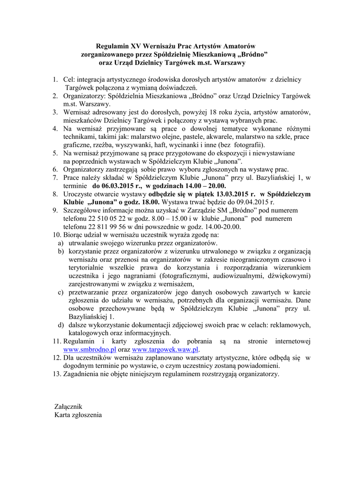 Regulamin XV Wernisażu Prac Artystów Amatorów zorganizowanego przez Spółdzielnię Mieszkaniową „Bródno” oraz Urząd Dzielnicy Targówek m.st. Warszawy 1. Cel: integracja artystycznego środowiska dorosłych artystów amatorów z dzielnicy Targówek połączona z wymianą doświadczeń. 2. Organizatorzy: Spółdzielnia Mieszkaniowa „Bródno” oraz Urząd Dzielnicy Targówek m.st. Warszawy. 3. Wernisaż adresowany jest do dorosłych, powyżej 18 roku życia, artystów amatorów, mieszkańców Dzielnicy Targówek i połączony z wystawą wybranych prac. 4. Na wernisaż przyjmowane są prace o dowolnej tematyce wykonane różnymi technikami, takimi jak: malarstwo olejne, pastele, akwarele, malarstwo na szkle, prace graficzne, rzeźba, wyszywanki, haft, wycinanki i inne (bez fotografii). 5. Na wernisaż przyjmowane są prace przygotowane do ekspozycji i niewystawiane na poprzednich wystawach w Spółdzielczym Klubie „Junona”. 6. Organizatorzy zastrzegają sobie prawo wyboru zgłoszonych na wystawę prac. 7. Prace należy składać w Spółdzielczym Klubie „Junona” przy ul. Bazyliańskiej 1, w terminie do 06.03.2015 r., w godzinach 14.00 – 20.00. 8. Uroczyste otwarcie wystawy odbędzie się w piątek 13.03.2015 r. w Spółdzielczym Klubie „Junona” o godz. 18.00. Wystawa trwać będzie do 09.04.2015 r. 9. Szczegółowe informacje można uzyskać w Zarządzie SM „Bródno” pod numerem telefonu 22 510 05 22 w godz. 8.00 – 15.00 i w klubie „Junona” pod numerem telefonu 22 811 99 56 w dni powszednie w godz. 14.00-20.00. 10. Biorąc udział w wernisażu uczestnik wyraża zgodę na: a) utrwalanie swojego wizerunku przez organizatorów. b) korzystanie przez organizatorów z wizerunku utrwalonego w związku z organizacją wernisażu oraz przenosi na organizatorów w zakresie nieograniczonym czasowo i terytorialnie wszelkie prawa do korzystania i rozporządzania wizerunkiem uczestnika i jego nagraniami (fotograficznymi, audiowizualnymi, dźwiękowymi) zarejestrowanymi w związku z wernisażem, c) przetwarzanie przez organizatorów jego danych osobowych zawartych w karcie zgłoszenia do udziału w wernisażu, potrzebnych dla organizacji wernisażu. Dane osobowe przechowywane będą w Spółdzielczym Klubie „Junona” przy ul. Bazyliańskiej 1. d) dalsze wykorzystanie dokumentacji zdjęciowej swoich prac w celach: reklamowych, katalogowych oraz informacyjnych. 11. Regulamin i karty zgłoszenia do pobrania są na stronie internetowej www.smbrodno.pl oraz www.targowek.waw.pl. 12. Dla uczestników wernisażu zaplanowano warsztaty artystyczne, które odbędą się w dogodnym terminie po wystawie, o czym uczestnicy zostaną powiadomieni. 13. Zagadnienia nie objęte niniejszym regulaminem rozstrzygają organizatorzy. Załącznik Karta zgłoszenia Załącznik KARTA ZGŁOSZENIA DO UDZIAŁU W XV WERNISAŻU PRAC ARTYSTÓW – AMATORÓW ORGANIZOWANYM PRZEZ SPÓŁDZIELNIĘ MIESZKANIOWĄ ”BRÓDNO” I URZĄD DZIELNICY TARGÓWEK m. st. WARSZAWY 1. Imię i nazwisko ............................................................................................................................................. 2. Adres z telefonem ................................................................................................................... ................................................................................................................................................. 3. Charakterystyka złożonych prac (liczba sztuk, technika, wymiary)........................................ ............................................................................................................................................... ................................................................................................................................................ 4. Krótka informacja o autorze (wykonywany zawód, od kiedy zajmuje się sztuką, czy uczestniczył już w wystawach) ........................................................................................ ............................................................................................................................................. ............................................................................................................................................. 5. Wyrażam zgodę na: a) utrwalanie swojego wizerunku przez organizatorów. b) korzystanie przez organizatorów z wizerunku utrwalonego w związku z organizacją wernisażu oraz przenosi na organizatorów w zakresie nieograniczonym czasowo i terytorialnie wszelkie prawa do korzystania i rozporządzania wizerunkiem Uczestnika i jego nagraniami (fotograficznymi, audiowizualnymi, dźwiękowymi) zarejestrowanymi w związku z wernisażem, c) przetwarzanie przez organizatorów jego danych osobowych zawartych w karcie zgłoszenia do udziału w wernisażu, potrzebnych dla organizacji XV Wernisażu Prac Artystów Amatorów. Dane osobowe przechowywane będą w Osiedlowym Klubie „Junona”, przy ul. Bazyliańskiej 1. d) dalsze wykorzystanie dokumentacji zdjęciowej swoich prac w celach: reklamowych, katalogowych oraz informacyjnych. 6. Oświadczam, że zapoznałem/łam się z regulaminem XV Wernisażu Prac Artystów Amatorów. 7. Zgłaszam chęć uczestnictwa w warsztatach artystycznych: TAK, NIE* (*niepotrzebne skreślić) Warszawa, dnia ……………………….. ……………………………………………………………..... własnoręczny podpis pokwitowanie przyjęcia prac na wystawę ……………………………………………………….. data, imię i nazwisko przyjmującego