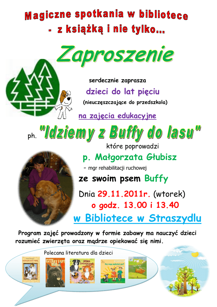 serdecznie zaprasza dzieci do lat pięciu (nieuczęszczające do przedszkola) na zajęcia edukacyjne ph. które poprowadzi p. Małgorzata Głubisz - mgr rehabilitacji ruchowej ze swoim psem Buffy Dnia 29.11.2011r. (wtorek) o godz. 13.00 i 13.40 w Bibliotece w Straszydlu Program zajęć prowadzony w formie zabawy ma nauczyć dzieci rozumieć zwierzęta oraz mądrze opiekować się nimi. Polecana literatura dla dzieci