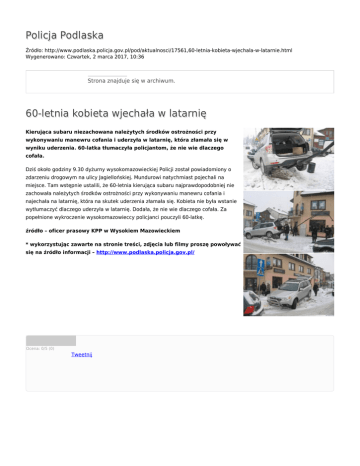 Policja Podlaska Źródło: http://www.podlaska.policja.gov.pl/pod/aktualnosci/17561,60-letnia-kobieta-wjechala-w-latarnie.html Wygenerowano: Czwartek, 2 marca 2017, 10:36 Strona znajduje się w archiwum. 60-letnia kobieta wjechała w latarnię Kierująca subaru niezachowana należytych środków ostrożności przy wykonywaniu manewru cofania i uderzyła w latarnię, która złamała się w wyniku uderzenia. 60-latka tłumaczyła policjantom, że nie wie dlaczego cofała. Dziś około godziny 9.30 dyżurny wysokomazowieckiej Policji został powiadomiony o zdarzeniu drogowym na ulicy Jagiellońskiej. Mundurowi natychmiast pojechali na miejsce. Tam wstępnie ustalili, że 60-letnia kierująca subaru najprawdopodobniej nie zachowała należytych środków ostrożności przy wykonywaniu manewru cofania i najechała na latarnię, która na skutek uderzenia złamała się. Kobieta nie była wstanie wytłumaczyć dlaczego uderzyła w latarnię. Dodała, że nie wie dlaczego cofała. Za popełnione wykroczenie wysokomazowieccy policjanci pouczyli 60-latkę. źródło – oficer prasowy KPP w Wysokiem Mazowieckiem * wykorzystując zawarte na stronie treści, zdjęcia lub filmy proszę powoływać się na źródło informacji – http://www.podlaska.policja.gov.pl/ Ocena: 0/5 (0) Tweetnij
