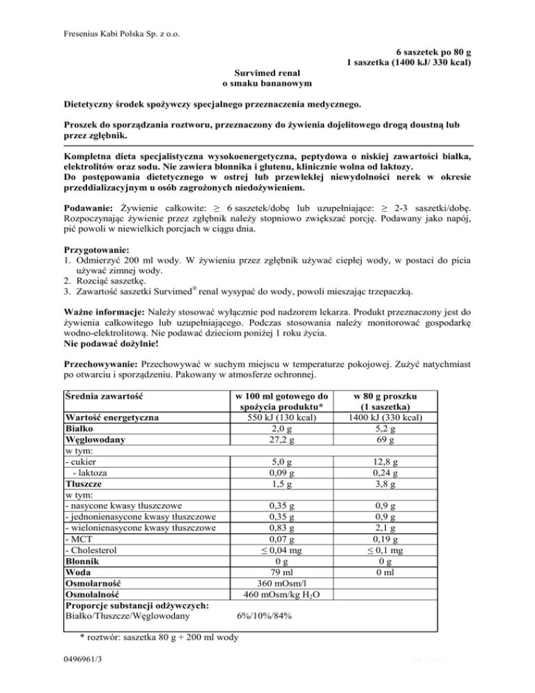 Fresenius Kabi Polska Sp. z o.o. 6 saszetek po 80 g 1 saszetka (1400 kJ/ 330 kcal) Survimed renal o smaku bananowym Dietetyczny środek spożywczy specjalnego przeznaczenia medycznego. Proszek do sporządzania roztworu, przeznaczony do żywienia dojelitowego drogą doustną lub przez zgłębnik. Kompletna dieta specjalistyczna wysokoenergetyczna, peptydowa o niskiej zawartości białka, elektrolitów oraz sodu. Nie zawiera błonnika i glutenu, klinicznie wolna od laktozy. Do postępowania dietetycznego w ostrej lub przewlekłej niewydolności nerek w okresie przeddializacyjnym u osób zagrożonych niedożywieniem. Podawanie: Żywienie całkowite: ≥ 6 saszetek/dobę lub uzupełniające: ≥ 2-3 saszetki/dobę. Rozpoczynając żywienie przez zgłębnik należy stopniowo zwiększać porcję. Podawany jako napój, pić powoli w niewielkich porcjach w ciągu dnia. Przygotowanie: 1. Odmierzyć 200 ml wody. W żywieniu przez zgłębnik używać ciepłej wody, w postaci do picia używać zimnej wody. 2. Rozciąć saszetkę. 3. Zawartość saszetki Survimed® renal wysypać do wody, powoli mieszając trzepaczką. Ważne informacje: Należy stosować wyłącznie pod nadzorem lekarza. Produkt przeznaczony jest do żywienia całkowitego lub uzupełniającego. Podczas stosowania należy monitorować gospodarkę wodno-elektrolitową. Nie podawać dzieciom poniżej 1 roku życia. Nie podawać dożylnie! Przechowywanie: Przechowywać w suchym miejscu w temperaturze pokojowej. Zużyć natychmiast po otwarciu i sporządzeniu. Pakowany w atmosferze ochronnej. Średnia zawartość Wartość energetyczna Białko Węglowodany w tym: - cukier - laktoza Tłuszcze w tym: - nasycone kwasy tłuszczowe - jednonienasycone kwasy tłuszczowe - wielonienasycone kwasy tłuszczowe - MCT - Cholesterol Błonnik Woda Osmolarność Osmolalność Proporcje substancji odżywczych: Białko/Tłuszcze/Węglowodany w 100 ml gotowego do spożycia produktu* 550 kJ (130 kcal) 2,0 g 27,2 g w 80 g proszku (1 saszetka) 1400 kJ (330 kcal) 5,2 g 69 g 5,0 g 0,09 g 1,5 g 12,8 g 0,24 g 3,8 g 0,35 g 0,35 g 0,83 g 0,07 g ≤ 0,04 mg 0g 79 ml 360 mOsm/l 460 mOsm/kg H2O 0,9 g 0,9 g 2,1 g 0,19 g ≤ 0,1 mg 0g 0 ml 6%/10%/84% * roztwór: saszetka 80 g + 200 ml wody 0496961/3 08.12.2011 Fresenius Kabi Polska Sp. z o.o. Średnia zawartość substancji w 100 ml gotowego do mineralnych spożycia produktu* i pierwiastków śladowych: Sód 20 mg Potas 24 mg Chlorki 2,4 mg Wapń 52 mg Magnez 10 mg Fosfor 19 mg Żelazo 1,2 mg Cynk 1 mg Miedź 132 µg Mangan 0,2 mg Jod 13,1 µg Fluorki 0,02 mg Chrom 3,5 µg Molibden 4,6 µg Selen 3,3 µg * roztwór: saszetka 80 g + 200 ml wody Średnia zawartość witamin: w 100 ml gotowego do spożycia produktu* Wit. A 31,5 µg Wit. D3 0,66 µg Wit. E 1,3 mg Wit. K1 6,6 µg Wit. B1 0,15 mg Wit. B2 0,17 mg Niacyna 1,2 mg Wit. B6 0,16 mg Wit. B12 0,39 µg Kwas pantotenowy 0,79 mg Biotyna 9,2 µg Kwas foliowy 26,4 µg Wit. C 6,6 mg Mioinozytol 15,8 mg * roztwór: saszetka 80 g + 200 ml wody w 80 g proszku (1 saszetka) 52 mg 60 mg 6 mg 133 mg 25 mg 48 mg 3 mg 2,5 mg 336 µg 0,5 mg 33,3 µg 0,04 mg 8,8 µg 11,7 µg 8,3 µg w 80 g proszku (1 saszetka) 80 µg 1,68 µg 3,36 mg 16,64 µg 0,37 mg 0,43 mg 3,0 mg 0,4 mg 1,0 µg 2,0 mg 23,3 µg 67 µg 16,64 mg 40 mg Skład: maltodekstryna, sacharoza, tłuszcz roślinny w proszku [olej słonecznikowy, syrop glukozowy, białko mleka, trójglicerydy o średniej długości łańcucha, emulgatory (E 471, lecytyna sojowa), regulatory kwasowości (E 339, E 340, E 330), przeciwutleniacze (E 304, E 307), z soją i olejem sojowym], hydrolizat żelatyny, hydrolizat białka serwatki, hydrolizat laktoalbuminy, białko sojowe, substancje smakowe (z pszenicy), węglan wapnia, cytrynian magnezu, mioinozytol, kwas jabłkowy, wit. C, siarczan żelaza, siarczan cynku, wit. E, niacyna, kwas pantotenowy, chlorek manganu, siarczan miedzi, wit. B2, wit. B6, wit. B1, wit. A, kwas foliowy, fluorek sodu, jodek potasu, wit. K1, biotyna, selenin sodu, sodu molibdenian, wit. D3, wit. B12. Najlepiej spożyć przed końcem/Numer partii: data i numer partii na opakowaniu. [logo Fresenius Kabi] Producent: Fresenius Kabi Deutschland GmbH D-61346 Bad Homburg, Niemcy 0496961/3 08.12.2011 Fresenius Kabi Polska Sp. z o.o. www.fresenius-kabi.com Dystrybutor: Fresenius Kabi Polska Sp. z o.o. ul. Hrubieszowska 2 01-209 Warszawa 0496961/3 0496961/3 08.12.2011