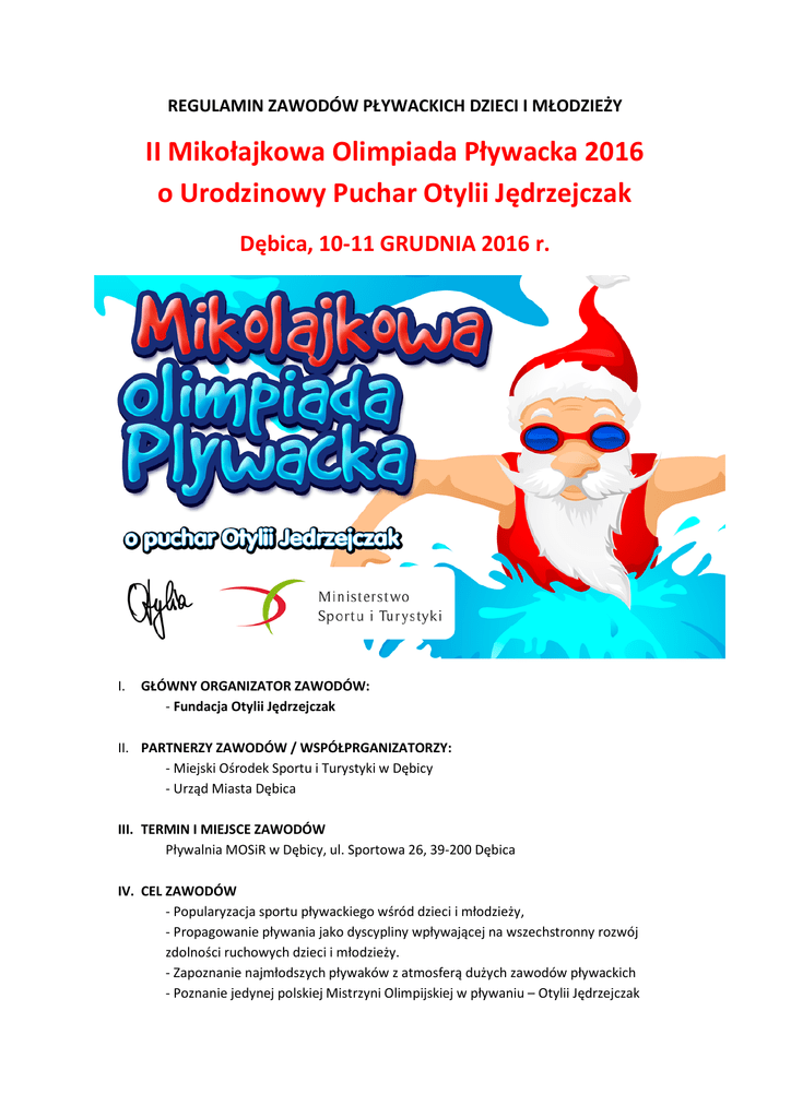 REGULAMIN ZAWODÓW PŁYWACKICH DZIECI I MŁODZIEŻY II Mikołajkowa Olimpiada Pływacka 2016 o Urodzinowy Puchar Otylii Jędrzejczak Dębica, 10-11 GRUDNIA 2016 r. I. GŁÓWNY ORGANIZATOR ZAWODÓW: - Fundacja Otylii Jędrzejczak II. PARTNERZY ZAWODÓW / WSPÓŁPRGANIZATORZY: - Miejski Ośrodek Sportu i Turystyki w Dębicy - Urząd Miasta Dębica III. TERMIN I MIEJSCE ZAWODÓW Pływalnia MOSiR w Dębicy, ul. Sportowa 26, 39-200 Dębica IV. CEL ZAWODÓW - Popularyzacja sportu pływackiego wśród dzieci i młodzieży, - Propagowanie pływania jako dyscypliny wpływającej na wszechstronny rozwój zdolności ruchowych dzieci i młodzieży. - Zapoznanie najmłodszych pływaków z atmosferą dużych zawodów pływackich - Poznanie jedynej polskiej Mistrzyni Olimpijskiej w pływaniu – Otylii Jędrzejczak V. DANE TECHNICZNE PŁYWALNI Zawody zostaną rozegrane na pływalni 50 metrowej, posiadającej 8 torów, temperatura wody wynosi 27,5 stopnia Celsjusza, pomiar czasu elektroniczny - COLORADO. VI. UCZESTNICTWO W ZAWODACH Prawo startu w zawodach mają zawodnicy zgłoszeni przez kluby zrzeszone w PZP. Zawody będą rozgrywane w sześciu kategoriach wiekowych: 2008,2007, 2006, 2005, 2004, 2003,2002. Każdy uczestnik może startować w zawodach w dowolnej ilości konkurencji indywidualnych oraz w wyścigach sztafetowych. VII. NAGRODY Medale okolicznościowe za miejsca I-III w każdej konkurencji i kategorii wiekowej w konkurencjach indywidualnych; Puchar dla najlepszej zawodniczki i zawodnika zawodów wg punktacji wielobojowej za 3 najlepsze wyniki (oddzielnie dla każdej kategorii wiekowej) w przypadku identycznej ilości pkt. Decyduje najlepszy wynik; Nagrody rzeczowe dla trzech najlepszych zawodników zawodów w każdej kategorii wiekowej w punktacji wielobojowej za 3 najlepsze wyniki; Nagrody specjalne w wyścigach premiowanych (aż 100 wyścigów premiowanych); Nagrody specjalne rozlosowane podczas zawodów wśród wszystkich uczestników imprezy (m.in. 2 wyjazdy na OTYLIA SWIM CAMP LATO 2017); Nagrody specjalne za ustanowienie nowych rekordów Polski; Organizator ma prawo do przyznania nagród dodatkowych; Za wyścigi sztafetowe trzy pierwsze zespoły zostaną nagrodzone słodkimi upominkami, zwycięskie zespoły otrzymają sprzęt sportowy dla klubu VIII. ZGŁOSZENIA DO ZAWODÓW Zgłoszenia do zawodów należy przesłać w formie elektronicznej w formacie .lxf (Splash Entry Editor) na adres [email protected], w nieprzekraczalnym terminie do dnia 4 grudnia 2016 roku, do godziny 20:00. Zaproszenie jest dostępne na stronie internetowej www.megatiming.pl . Na tej samej stronie będzie opublikowana lista zgłoszonych zawodników, lista startowa, wyniki live oraz będą zamieszczane także ważne informacje organizacyjne. IX. PROGRAM ZAWODÓW 10.12.2016 – dzień pierwszy 8:00 - ROZGRZEWKA PRZED PIERWSZYM BLOKIEM KONKURENCJI 8:45 - ROZPOCZĘCIE KONKURENCJI PIERWSZEGO BLOKU ZAWODÓW 1. 50 m stylem motylkowym dziewcząt 2008 - 2002 2. 200 m stylem motylkowym chłopców 2004 - 2002 3. 200 m stylem grzbietowym dziewcząt 2006 - 2002 4. 50 m stylem grzbietowym chłopców 2008 - 2002 5. 50 m stylem klasycznym dziewcząt 2008 - 2002 6. 200 m stylem klasycznym chłopców 2005 - 2002 7. 200 m stylem dowolnym dziewcząt 2006 - 2002 8. 50 m stylem dowolnym chłopców 2008 - 2002 9. 200 m stylem zmiennym chłopców 2005 - 2002 60 min przerwa techniczna(pływalnia dostępna w celach rozgrzewkowych) 10. 50 m stylem motylkowym chłopców 2008 - 2002 11. 200 m stylem motylkowym dziewcząt 2004 - 2002 12. 200 m stylem grzbietowym chłopców 2006 - 2002 13. 50 m stylem grzbietowym dziewcząt 2008 - 2002 14. 50 m stylem klasycznym chłopców 2008 - 2002 15. 200 m stylem klasycznym dziewcząt 2005 - 2002 16. 200 m stylem dowolnym chłopców 2006 - 2002 17. 50 m stylem dowolnym dziewcząt 2008 - 2002 18. 200 m stylem zmiennym dziewcząt 2005 - 2002 19. 6 x 50 m stylem dowolnym mix* 2008 - 2006 oraz OPEN 11.12.2016 – dzień drugi 8:45 - ROZGRZEWKA PRZED PIERWSZYM BLOKIEM KONKURENCJI 9:30 - ROZPOCZĘCIE KONKURENCJI PIERWSZEGO BLOKU ZAWODÓW 20. 100 m stylem dowolnym dziewcząt 2008 - 2002 21. 100 m stylem dowolnym chłopców 2008 - 2002 22. 100 m stylem klasycznym dziewcząt 2008 - 2002 23. 100 m stylem klasycznym chłopców 2008 - 2002 24. 100 m stylem grzbietowym dziewcząt 2008 - 2002 25. 100 m stylem grzbietowym chłopców 2008 - 2002 26. 100 m stylem motylkowym dziewcząt 2005 - 2002 27. 100 m stylem motylkowym chłopców 2005 – 2002 28. 400 m stylem dowolnym dziewcząt 2004 – 2002 (max. 4 wyścigi) 29. 400 m stylem dowolnym chłopców 2004 – 2002 (max. 4 wyścigi) 30. 4 x 50 m stylem zmiennym OPEN mix (2 dziewczynki + 2 chłopców) *) w drużynie startuje po dwóch zawodników z każdego rocznika - dziewczynka oraz chłopiec X. ZASADY FINANSOWANIA koszty zawodów pokrywają organizatorzy, koszty uczestnictwa pokrywają kluby biorące udział w zawodach, opłata startowa - 10 zł od każdego ZGŁOSZONEGO startu +30 zł opłata klubowa; wszystkie świadczenia płatne gotówką przed zawodami w Biurze Zawodów bądź w hotelach na podstawie skierowania z biura zawodów; XI. POSTANOWIENIA KOŃCOWE Podstawą dopuszczenia do startu są aktualne badania lekarskie i aktualna licencja PZP ; W zawodach obowiązują aktualne przepisy FINA i PZP; W sprawach nie ujętych w niniejszym regulaminie decyduje Naczelnik Zawodów w porozumieniu z Sędzią Głównym; Naczelnikiem Zawodów jest Jarosław Błażek (tel. 785-331-511); Prawo interpretacji niniejszego regulaminu przysługuje organizatorowi; Zgłoszenie drużyny jest równoznaczne z akceptacją regulaminu zawodów. Oferta hotelowa oraz cateringowa dostępna jest w oddzielnym pliku. W sobotę 10 grudnia w godzinach 20:00 – 23:00 przewidziana jest dyskoteka dla zawodników, która odbędzie się w hotelu GOLD w Dębicy Biuro zawodów będzie czynne w piątek 9 grudnia od godziny 14:00 do 21:00 i zlokalizowane będzie w holu głównym hotelu Gold (ok. 200 m od p
