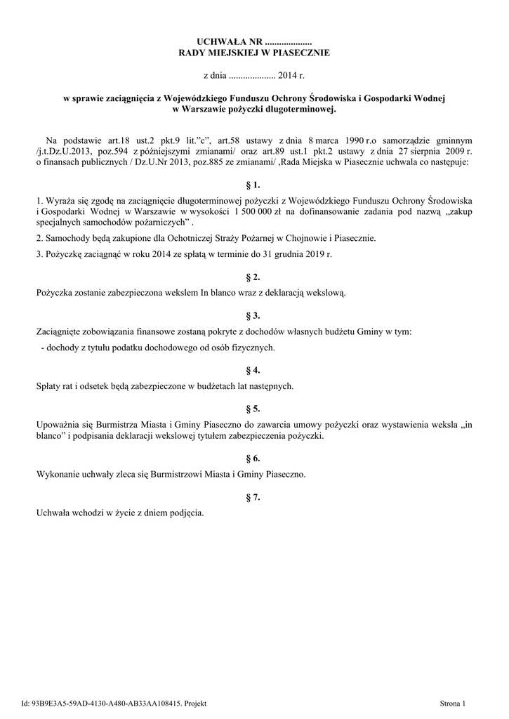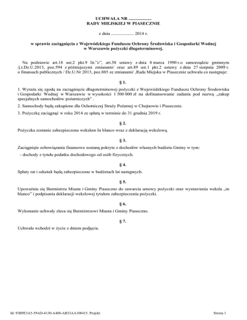 UCHWAŁA NR .................... RADY MIEJSKIEJ W PIASECZNIE z dnia .................... 2014 r. w sprawie zaciągnięcia z Wojewódzkiego Funduszu Ochrony Środowiska i Gospodarki Wodnej w Warszawie pożyczki długoterminowej. Na podstawie art.18 ust.2 pkt.9 lit.”c”, art.58 ustawy z dnia 8 marca 1990 r.o samorządzie gminnym /j.t.Dz.U.2013, poz.594 z późniejszymi zmianami/ oraz art.89 ust.1 pkt.2 ustawy z dnia 27 sierpnia 2009 r. o finansach publicznych / Dz.U.Nr 2013, poz.885 ze zmianami/ ,Rada Miejska w Piasecznie uchwala co następuje: § 1. 1. Wyraża się zgodę na zaciągnięcie długoterminowej pożyczki z Wojewódzkiego Funduszu Ochrony Środowiska i Gospodarki Wodnej w Warszawie w wysokości 1 500 000 zł na dofinansowanie zadania pod nazwą „zakup specjalnych samochodów pożarniczych” . 2. Samochody będą zakupione dla Ochotniczej Straży Pożarnej w Chojnowie i Piasecznie. 3. Pożyczkę zaciągnąć w roku 2014 ze spłatą w terminie do 31 grudnia 2019 r. § 2. Pożyczka zostanie zabezpieczona wekslem In blanco wraz z deklaracją wekslową. § 3. Zaciągnięte zobowiązania finansowe zostaną pokryte z dochodów własnych budżetu Gminy w tym: - dochody z tytułu podatku dochodowego od osób fizycznych. § 4. Spłaty rat i odsetek będą zabezpieczone w budżetach lat następnych. § 5. Upoważnia się Burmistrza Miasta i Gminy Piaseczno do zawarcia umowy pożyczki oraz wystawienia weksla „in blanco” i podpisania deklaracji wekslowej tytułem zabezpieczenia pożyczki. § 6. Wykonanie uchwały zleca się Burmistrzowi Miasta i Gminy Piaseczno. § 7. Uchwała wchodzi w życie z dniem podjęcia. Id: 93B9E3A5-59AD-4130-A480-AB33AA108415. Projekt Strona 1 Uzasadnienie W związku z możliwością uzyskania niskooprocentowanej pożyczki z Wojewódzkiego Funduszu Ochrony Środowiska i Gospodarki Wodnej na zakup samochodów pożarniczych dla jednostek Ochotniczych Straży Pożarnych Gmina Piaseczno ubiega się o udzielenie takiej pożyczki na w/w zadanie inwestycyjne. Celem prawidłowego sporządzenia wniosku o udzielenie pożyczki z WFOŚiGW w Warszawie z programu „Zapobieganie Zagrożeniom Środowiska i Poważnym Awariom oraz Usuwania ich Skutków” dla zadania „zakup specjalnych samochodów pożarniczych”niezbędna jest uchwała Rady Miejskiej w Piasecznie. Z udzielonej pożyczki sfinansowane zostałby zakupy samochodów pożarniczych dla OSP Piaseczno i OSP Chojnów. Na terenie Gminy Piaseczna funkcjonuje 7 jednostek Ochotniczych Straży Pożarnych typu „S”, w tym 4 włączone do Krajowego Systemu Ratowniczo-Gaśniczego. Jednostki te wykorzystują 11 pojazdów pożarniczych. Stan wyposażenia w pojazdy pożarnicze jednostek OSP w gminie Piaseczno jest zróżnicowany odnośnie wieku i stanu technicznego. Ponad 40% samochodów pożarniczych będących w dyspozycji OSP Gminy Piaseczno jest wyprodukowanych przed rokiem 1990. Szacując, że przy 11 posiadanych pojazdach, aby utrzymać wiek samochodów pożarniczych rzędu 20-22 lata należałoby sukcesywnie, co 2 lata dokonywać wymiany przynajmniej jednego pojazdu, zachowując dzięki temu odpowiednią gotowość operacyjną jednostek i odpowiedni poziom sprawności technicznej pojazdów. W latach 2011-2013 Ochotnicze Straże Pożarne Gminy Piaseczno uczestniczyły w 1740 interwencjach. Szczególnie obciążonymi jednostkami w działaniach ratowniczych były jednostki OSP Piaseczno i OSP Chojnów. W latach 2011-2013 OSP Piaseczno uczestniczyło w 470 interwencjach a OSP Chojnów w 372. Jednostki te posiadają jedne z najstarszych samochodów pożarniczych wykorzystywanych przez Ochotnicze Straże Pożarne Gminy Piaseczno. Samochód planowany do wymiany w OSP Piaseczno pochodzi z roku1986 , a OSP Chojnów z 1987 roku Jednostka OSP Piaseczno oraz OSP Chojnów, dla których planowane jest zrealizowanie przedmiotowego doposażenia sprzętowego, należą do KSRG od 1995 r. i są jednymi z najlepszych jednostek z terenu Gminy Piaseczno, ale także z terenu powiatu. Wymiana wysłużonych już pojazdów na nowe, podniesie stopień gotowości bojowej jednostek oraz zredukuje koszty remontów i napraw.. W latach 2011-2013 remonty i naprawy samochodów pożarniczych OSP Chojnów i Piaseczno kosztowało budżet gminy około 76000 zł. Id: 93B9E3A5-59AD-4130-A480-AB33AA108415. Projekt Strona 2