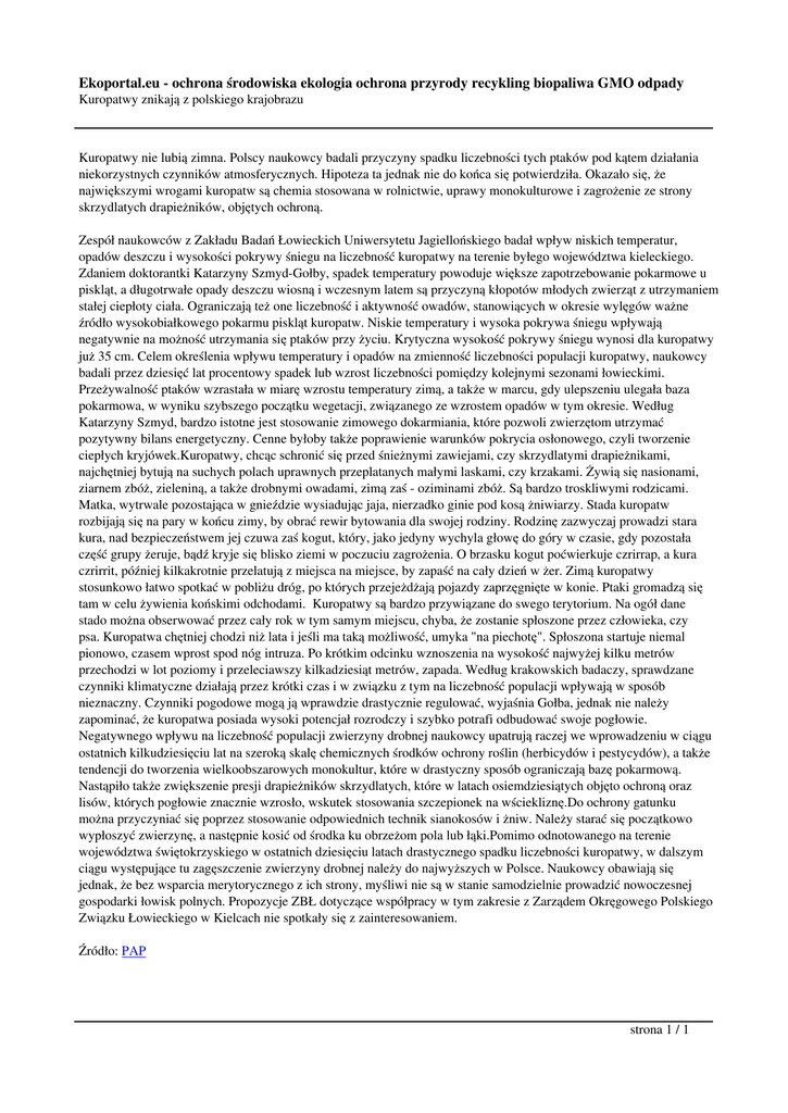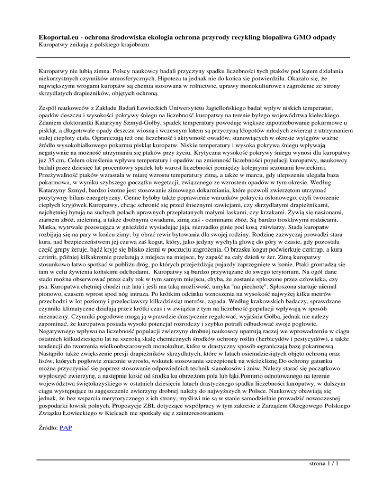 Ekoportal.eu - ochrona środowiska ekologia ochrona przyrody recykling biopaliwa GMO odpady Kuropatwy znikają z polskiego krajobrazu Kuropatwy nie lubią zimna. Polscy naukowcy badali przyczyny spadku liczebności tych ptaków pod kątem działania niekorzystnych czynników atmosferycznych. Hipoteza ta jednak nie do końca się potwierdziła. Okazało się, że największymi wrogami kuropatw są chemia stosowana w rolnictwie, uprawy monokulturowe i zagrożenie ze strony skrzydlatych drapieżników, objętych ochroną. Zespół naukowców z Zakładu Badań Łowieckich Uniwersytetu Jagiellońskiego badał wpływ niskich temperatur, opadów deszczu i wysokości pokrywy śniegu na liczebność kuropatwy na terenie byłego województwa kieleckiego. Zdaniem doktorantki Katarzyny Szmyd-Gołby, spadek temperatury powoduje większe zapotrzebowanie pokarmowe u piskląt, a długotrwałe opady deszczu wiosną i wczesnym latem są przyczyną kłopotów młodych zwierząt z utrzymaniem stałej ciepłoty ciała. Ograniczają też one liczebność i aktywność owadów, stanowiących w okresie wylęgów ważne źródło wysokobiałkowego pokarmu piskląt kuropatw. Niskie temperatury i wysoka pokrywa śniegu wpływają negatywnie na możność utrzymania się ptaków przy życiu. Krytyczna wysokość pokrywy śniegu wynosi dla kuropatwy już 35 cm. Celem określenia wpływu temperatury i opadów na zmienność liczebności populacji kuropatwy, naukowcy badali przez dziesięć lat procentowy spadek lub wzrost liczebności pomiędzy kolejnymi sezonami łowieckimi. Przeżywalność ptaków wzrastała w miarę wzrostu temperatury zimą, a także w marcu, gdy ulepszeniu ulegała baza pokarmowa, w wyniku szybszego początku wegetacji, związanego ze wzrostem opadów w tym okresie. Według Katarzyny Szmyd, bardzo istotne jest stosowanie zimowego dokarmiania, które pozwoli zwierzętom utrzymać pozytywny bilans energetyczny. Cenne byłoby także poprawienie warunków pokrycia osłonowego, czyli tworzenie ciepłych kryjówek.Kuropatwy, chcąc schronić się przed śnieżnymi zawiejami, czy skrzydlatymi drapieżnikami, najchętniej bytują na suchych polach uprawnych przeplatanych małymi laskami, czy krzakami. Żywią się nasionami, ziarnem zbóż, zieleniną, a także drobnymi owadami, zimą zaś - oziminami zbóż. Są bardzo troskliwymi rodzicami. Matka, wytrwale pozostająca w gnieździe wysiadując jaja, nierzadko ginie pod kosą żniwiarzy. Stada kuropatw rozbijają się na pary w końcu zimy, by obrać rewir bytowania dla swojej rodziny. Rodzinę zazwyczaj prowadzi stara kura, nad bezpieczeństwem jej czuwa zaś kogut, który, jako jedyny wychyla głowę do góry w czasie, gdy pozostała część grupy żeruje, bądź kryje się blisko ziemi w poczuciu zagrożenia. O brzasku kogut poćwierkuje czrirrap, a kura czrirrit, później kilkakrotnie przelatują z miejsca na miejsce, by zapaść na cały dzień w żer. Zimą kuropatwy stosunkowo łatwo spotkać w pobliżu dróg, po których przejeżdżają pojazdy zaprzęgnięte w konie. Ptaki gromadzą się tam w celu żywienia końskimi odchodami. Kuropatwy są bardzo przywiązane do swego terytorium. Na ogół dane stado można obserwować przez cały rok w tym samym miejscu, chyba, że zostanie spłoszone przez człowieka, czy psa. Kuropatwa chętniej chodzi niż lata i jeśli ma taką możliwość, umyka "na piechotę". Spłoszona startuje niemal pionowo, czasem wprost spod nóg intruza. Po krótkim odcinku wznoszenia na wysokość najwyżej kilku metrów przechodzi w lot poziomy i przeleciawszy kilkadziesiąt metrów, zapada. Według krakowskich badaczy, sprawdzane czynniki klimatyczne działają przez krótki czas i w związku z tym na liczebność populacji wpływają w sposób nieznaczny. Czynniki pogodowe mogą ją wprawdzie drastycznie regulować, wyjaśnia Gołba, jednak nie należy zapominać, że kuropatwa posiada wysoki potencjał rozrodczy i szybko potrafi odbudować swoje pogłowie. Negatywnego wpływu na liczebność populacji zwierzyny drobnej naukowcy upatrują raczej we wprowadzeniu w ciągu ostatnich kilkudziesięciu lat na szeroką skalę chemicznych środków ochrony roślin (herbicydów i pestycydów), a także tendencji do tworzenia wielkoobszarowych monokultur, które w drastyczny sposób ograniczają bazę pokarmową. Nastąpiło także zwiększenie presji drapieżników skrzydlatych, które w latach osiemdziesiątych objęto ochroną oraz lisów, których pogłowie znacznie wzrosło, wskutek stosowania szczepionek na wściekliznę.Do ochrony gatunku można przyczyniać się poprzez stosowanie odpowiednich technik sianokosów i żniw. Należy starać się początkowo wypłoszyć zwierzynę, a następnie kosić od środka ku obrzeżom pola lub łąki.Pomimo odnotowanego na terenie województwa świętokrzyskiego w ostatnich dziesięciu latach drastycznego spadku liczebności kuropatwy, w dalszym ciągu występujące tu zagęszczenie zwierzyny drobnej należy do najwyższych w Polsce. Naukowcy obawiają się jednak, że bez wsparcia merytorycznego z ich strony, myśliwi nie są w stanie samodzielnie prowadzić nowoczesnej gospodarki łowisk polnych. Propozycje ZBŁ dotyczące współpracy w tym zakresie z Zarządem Okręgowego Polskiego Związku Łowieckiego w Kielcach nie spotkały się z zainteresowaniem. Źródło: PAP strona 1 / 1