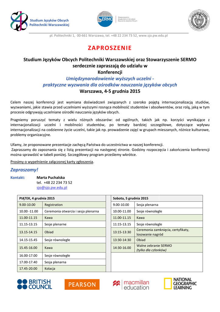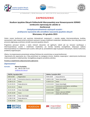 Studium Języków Obcych Politechniki Warszawskiej pl. Politechniki 1, 00-661 00 Warszawa, tel. +48 22 234 73 52,, www.sjo.pw.edu.pl ZAPROSZENIE Studium Języków Obcych Politechniki Warszawskiej oraz Stowarzyszenie SERMO serdecznie zapraszają zaprasza do udziału w Konferencji Umiędzynarodowienie wyższych uczelni praktyczne raktyczne wyzwania dla ośrodków nauczania języków obcych Warszawa, 4-5 grudnia 2015 Celem naszej konferencji jest wymiana doświadczeń związanych z szeroko pojętą internacjonalizacją studiów, wyzwaniami, jakie stawia przed uczelniami wyższymi rosnąca mobilność bilność studentów i absolwentów absolwentów, oraz rolą, jaką w tym procesie odgrywają uczelniane ośrodki nauczania języków obcych. ob Pragniemy poruszyć tematy z wielu różnych obszarów: od ogólnych, ogólnych takich jak np. korzyści wynikające z internacjonalizacji uczelni i mobilności studentów, studen , po tematy bardziej szczegó szczegółowe, dotyczące wpływu internacjonalizacji na codzienne życie uczelni, uczeln takie jak np. prowadzenie zajęć w grupach mieszanych, różnice kulturowe, problemy organizacyjne. Ufamy, że proponowane prezentacje zachęcą zachę Państwa do uczestnictwa w naszej konferencji. Zapraszamy do zapoznania się z listą prezentacji na następnej stronie. Godziny rozpoczęcia i zakończenia konferencji można sprawdzić w tabeli poniżej. Szczegółowy program prześlemy wkrótce. Prosimy o wypełnienie załączonej karty zgłoszenia. zgłoszenia Zapraszamy! Kontakt: Marta Puchalska tel. +48 22 234 73 52 [email protected] PIĄTEK, 4 grudnia 2015 Sobota, 5 grudnia 2015 9.00-10.00 Registration 9.00-10.00 Sesja plenarna 10.00 -11.00 Ceremonia otwarcia i sesja plenarna 10.00-11.00 Sesje równoległe 11.00-11.15 Kawa 11.00-11.15 Kawa 11.15-13.15 Sesje plenarne 11:15-13.15 Sesje równoległe 13.15-14.15 Obiad 13:15-13:30 Ceremonia zamknięcia, certyfikaty, losowanie nagród 14.15-15.45 Sesje równoległe 13:30-14:30 Obiad 15.45-16.00 Kawa 14:30-16.00 Walne zebranie SERMO (tylko dla członków) 16.00-17.00 Sesje równoległe 17.00-17.40 Sesja plenarna 17.45-20.00 Kolacja PREZENTACJE (wszystkie prezentacje są w języku angielskim, chyba że zaznaczono inaczej) Jesteśmy niezmiernie dumni gościć wielu uznanych prezenterów m.in profesora John’a de Jong’a, który spróbuje odpowiedzieć na bardzo intrygujące pytanie: Why doesn’t CEFR always work? Przedstawimy również wiele różnych aspektów internacjonalizacji na Politechnice Warszawskiej i będzie to odzwierciedlone w następujących prezentacjach: Internationalisation of Warsaw University of Technology. International students – challenge accepted! WUT Foundation Year for International Students. Uczestnicy konferencji będą mieli możliwość poznania sposobów, jakie wypracowały inne uczelnie, zarówno z Polski jak i innych krajów europejskich, w radzeniu sobie z problemami związanymi z internacjonalizacją uczelni: Enhancing the international student experience: the benefits of an effective induction and integration programme – British experience Quo vadis, language centre? Internationalisation as a driving force; the ongoing development of the language centre of Ruhr-Universität Bochum Two examples for a successful and sustainable internationalisation - European University Viadrina Internacjonalizacja uczelni na przykładzie Uniwersytetu Ekonomicznego w Krakowie (prezentacja w jęz. polskim) The Politics of Language Policy - the experience of the RWTH Aachen University Language Centre. Równocześnie pragniemy skupić się na praktycznych aspektach i wyzwaniach związanych z uczeniem studentów pochodzących z wielu obszarów kulturowych i reprezentujących różne systemy edukacji oraz z pokonywaniem barier komunikacyjnych. Poniższe prezentacje będą zwierać doświadczenia nauczycieli-praktyków w tym obszarze: My international group: a hard nut to crack or a piece of cake? Teaching technical and professional writing to students of a technical university. Dwie prezentacje na pewno dadzą nam wiele do myślenia: What can TED speakers teach us about globalisation, soft skills and language? Analysing TED talks for better internationalised world (Piotr Bucki) Admissions criteria - Do standarized tests matter? Zajmiemy się również zagadnieniem nabywania nowych umiejętności przez kadrę nauczycielską uczelni wyższych w celu sprostania wyzwaniom związanym z rosnącą liczbą studentów międzynarodowych, zarówno w Polsce jak i zagranicą. Temat ten będzie przedstawiony przez wykładowcę Uniwersytetu Medycznego, który uczy studentów międzynarodowych na tej uczelni oraz w poniższych prezentacjach: What helps teachers teach... in English? Internationalisation and the role of English in tertiary education - providing English language support to university teaching staff. Jedna z prezentacji będzie dotyczyła korzyści dla nauczycieli języków obcych jakie płyną z internacjonalizacji uczelni wyższych. Teacher development in the context of internationalisation of higher education the example of the Foreign Language Centre, Warsaw University of Technology. Poruszymy również kwestię uczenia się lokalnych języków krajów, do których przyjeżdżają studenci międzynarodowi, ich problemów z tym związanych i rozwiązań oferowanych przez uniwersytety goszczące: Refleksje na temat nauczania języka polskiego jako języka obcego na Politechnice Poznańskiej (prezentacja w jęz. polskim) Dlaczego tak trudno nauczyć się języka polskiego? Język polski oczami cudzoziemców (prezentacja w jęz. polskim) Finnish at Aalto University: The use of the local language in a globalized university context. Specyfika nauczania języka rosyjskiego jako obcego w Katedrze Ukrainistyki UW w obliczu różnorodności kulturowej studentów. (prezentacja w jęz. polskim) Na naszej konferencji zaprezentujemy różne inicjatywy podjęte zarówno przez studentów jak i nauczycieli m