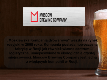 „Moskiewska Kompania Browarowa” weszła na rynek rosyjski w 2008 roku. Kompania posiada nowoczesną fabrykę w Rosji jak również własne centrum logistyczne, umiejscowione w ekologicznie czystej miejscowości. Moscow Brewing Company jest jedną z wiodących kompanii w Rosji. Żyguli barowe ekskluzywna puszka KOLEKCJONERSKA PUSZKA! Projekt znanego rosyjskiego malarza Valeria Barykina Limitowana edycja! Co 2-gi miesiąc inny obraz! Ilość sztuk ograniczona Alkohol : 4,9 % Ekstrakt : 12,0%. Pojemność: 1l puszka Wzór nr13 Żyguli barowe ekskluzywna butelka Piwo jasne typu Lager , z wyrazistym chmielowym aromatem oraz lekkim posmakiem goryczki. Alkohol : 4,9 % Ekstrakt : 12,0%. Pojemność: 0,75l Piwo Triochgornoje ( Trzy Góry) Piwo dolnej fermentacji w niemieckim stylu Hell,produkowane według oryginalnej receptury z(od) 1875 roku. Charakteryzuje się słodkawym , słodowym smakiem ,oraz delikatną goryczką. Posiada wyrazisty aromat chmielu odmiany Polaris z nutami owoców cytrusowych ,euqaliptusa, oraz mięty. Składniki: woda żródlana, słód jęczmienny jasny, chmiel. 1L Alkohol: 4,9 % Ekstrakt: 12%. Pojemność: 500, 1000ml butelka Piwo Triochgornoje ( Trzy Góry) Bezalkoholowe Piwo fermentuje się przy temperaturze bliskiej zera stopni, co pozwala zachować wszystkie witaminy i składniki odżywcze. Charakterystyczny chmielowy aromat i delikatna goryczka czeskiego chmielu „Zatecky Polorany Cervenak” Alkohol: 0,5 % Ekstrakt: 12%. Pojemność: 500ml. Piwo Triochgornoje ( Trzy Góry) Letnie Białe LIMITOWANA EDYCJA Z SERII SEZONOWEJ Autorski przepis Michaiła Jershova, głównego Piwowara Moskiewskiej Kompanii Browarowej Piwo jasne, pszeniczne z słodkim smakiem melona i jabłek, przyjemna i bardzo delikatna goryczka z mocno wyczuwalnym aromatem owoców. Chmielony technologią na zimno, gdzie chmiel dodaje się na ostatnim etapie warzenia piwa. Ten proces warzenia nadaje piwu niepowtarzalny smak i aromat. Jedyna w swoim rodzaju 1,5 litrowa szklana butelka, która została specjalnie zaprojektowana dla tej serii piw. Alkohol: 4,1 % Ekstrakt: 10%. Pojemność: 1500 ml. butelka Trzmiel Biały ALE (piwo pszeniczne) Orzeźwiające piwo w stylu Witbier z mieszanką niesłodowanych zbóż pszenicy i słodu jęczmiennego z dodatkiem skórki pomarańczowej i kolendry. Piwo niefiltrowane, ze względu na dodatek niesłodowanej pszenicy może być bardzo mętny. Pasteryzowane. Alkohol: 4,6 % Ekstrakt: 11 %. Pojemność: 1000 ml. butelka Chamowniki Wiedeńskie Ekskluzywna puszka Marka piwa jest znana i lubiana przez prawie 150 lat i pochodzi od historycznej nazwy dzielnicy w Moskwie („Cham” dawna nazwa płótna z lnu). Chamowniki Wiedeńskie” - warzone przy użyciu specjalnych słodów tradycyjnego dla typu Wiedeński lager, lekkiego słodu, Wiedeńskiego, słodu „Karared” (czerwony) oraz karmelowego. Przy produkcji używa się tylko szlachetnych rodzajów niemieckiego chmielu: „Sapphire” i „Tettnanger”, która daje piwu delikatny kwiatowy aromat i łagodną gorycz. Alkohol : 4,5 % Ekstrakt :11,0%. Pojemność :1000 ml KOLEKCJONERSKA PUSZKA! Limitowana edycja! Co 3-ći miesiąc inny obraz! Chamowniki Wiedeńskie Marka piwa jest znana i lubiana przez prawie 150 lat i pochodzi od historycznej nazwy dzielnicy w Moskwie („Cham” dawna nazwa płótna z lnu). Chamowniki Wiedeńskie” - warzone przy użyciu specjalnych słodów tradycyjnego dla typu Wiedeński lager, lekkiego słodu, Wiedeńskiego, słodu „Karared” (czerwony) oraz karmelowego. Przy produkcji używa się tylko szlachetnych rodzajów niemieckiego chmielu: „Sapphire” i „Tettnanger”, która daje piwu delikatny kwiatowy aromat i łagodną gorycz. Unikatowa, oryginalna butelka. Korek wykonany z wykorzystaniem nowoczesnych technologii Ring-pull. Alkohol : 4,5 % Ekstrakt :11,0%. Pojemność :500 ml Chamowniki Pilzneńskie Marka piwa jest znana i lubiana przez prawie 150 lat i pochodzi od historycznej nazwy dzielnicy w Moskwie („Cham” dawna nazwa płótna z lnu). Chamowniki pilzneńskie” to tradycyjny niemiecki Pils. Charakteryzuję się przejrzystością, a zarazem orzeźwieniem i delikatną goryczą. Unikatowa, oryginalna butelka. Korek wykonany z wykorzystaniem nowoczesnych technologii Ring-pull. Gold medal 2014 „Monde Selection” Alkohol : 4,8 % Ekstrakt :12,0% Pojemność :500 ml Chamowniki Pszeniczne Marka piwa jest znana i lubiana przez prawie 150 lat i pochodzi od historycznej nazwy dzielnicy w Moskwie („Cham” dawna nazwa płótna z lnu). Chamowniki Pszeniczne” półciemne niefiltrowane. Posiada delikatny owocowy aromat z nutą goździków i karmelu. Unikatowa, oryginalna butelka. Korek wykonany z wykorzystaniem nowoczesnych technologii Ring-pull. Gold medal 2014 „Monde Selection” Piwo pszeniczne, niefiltrowane, pasteryzowane. Alkohol : 4,8 % obj. Ekstrakt :12,0%. Pojemność :500 ml Chamowniki Monachium Marka piwa jest znana i lubiana przez prawie 150 lat i pochodzi od historycznej nazwy dzielnicy w Moskwie („Cham” dawna nazwa płótna z lnu). Ważone zgodnie z Bawarskim Prawem Czystości 1516r. Bogaty nasycony aromat chmielu i jęczmieniu. Unikatowa, oryginalna butelka. Korek wykonany z wykorzystaniem nowoczesnych technologii Ring-pull. Piwo jasne, pasteryzowane, filtrowane. Alkohol : 5,5 % obj. Ekstrakt :13,0%. Pojemność :500 ml Chamowniki Angielski Ale Marka „Chamowniki” pochodzi od historycznej nazwy dzielnicy w Moskwie („Cham” dawna nazwa płótna z lnu). Półciemny ALE ważony przy użyciu specjalnego słodu "Karared" (karmelowy-czerwony) Z chmielu - Hersbrukkerski, który rośnie wyłącznie na obszarach położonych na północy od Norymbergii Przy granice z francuskimi Alpami. Alkohol : 6,2 % obj. Ekstrakt :16%. Pojemność :500 ml Chamowniki Irlandzki Stout Marka „Chamowniki” pochodzi od historycznej nazwy dzielnicy w Moskwie („Cham” dawna nazwa płótna z lnu). Nasycone ciemne piwo ważone metodą górnej fermentacji. Kremowa piana z aroma