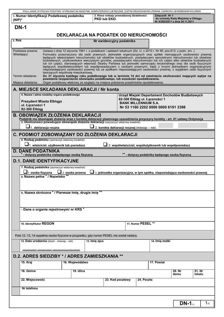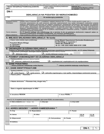 POLA JASNE WYPEŁNIA PODATNIK. WYPEŁNIAĆ NA MASZYNIE, KOMPUTEROWO LUB RĘCZNIE, DUŻYMI DRUKOWANYMI LITERAMI, CZARNYM LUB NIEBIESKIM KOLOREM. 1. Numer 2. Klasa rodzaju prowadzonej działalności PKD lub EKD: Identyfikacji Podatkowej podatnika (NIP)* Załącznik Nr 1 do uchwały Rady Miejskiej w Elblągu Nr X/265/2011 z dnia 24.11.2011 DN-1 DEKLARACJA NA PODATEK OD NIERUCHOMOŚCI 3. Rok Nr ewidencyjny podatnika ÀÄÄÄÄÁÄÄÄÄÁÄÄÄÄÁÄÄÄÄÙ Podstawa prawna: Składający: Termin składania: Miejsce składania: ............................................. Ustawa z dnia 12 stycznia 1991 r. o podatkach i opłatach lokalnych (Dz. U. z 2010 r. Nr 95, poz.613, z poźn. zm. ). Formularz przeznaczony dla osób prawnych, jednostek organizacyjnych oraz spółek niemających osobowości prawnej będących właścicielami nieruchomości lub obiektów budowlanych, posiadaczami samoistnymi nieruchomości lub obiektów budowlanych, użytkownikami wieczystymi gruntów, posiadaczami nieruchomości lub ich części albo obiektów budowlanych lub ich części, stanowiących własność Skarbu Państwa lub jednostki samorządu terytorialnego oraz dla osób fizycznych będących współwłaścicielami lub współposiadaczami z osobami prawnymi, bądź z innymi jednostkami organizacyjnymi nieposiadającymi osobowości prawnej lub ze spółkami nieposiadającymi osobowości prawnej, z wyjątkiem osób fizycznych tworzących wspólnotę mieszkaniową. Do 31 stycznia każdego roku podatkowego lub w terminie 14 dni od zaistnienia okoliczności mających wpływ na powstanie (wygaśnięcie) obowiązku podatkowego, lub wysokość opodatkowania. Organ podatkowy właściwy ze względu na miejsce położenia przedmiotów opodatkowania. A. MIEJSCE SKŁADANIA DEKLARACJI / Nr konta Urząd Miejski Departament Dochodów Budżetowych 82-300 Elbląg ul. Łączności 1 BANK MILLENNIUM S.A. 4. Nazwa i adres siedziby organu podatkowego Prezydent Miasta Elbląga ul. Łączności 1 82-300 Elbląg Nr 53 1160 2202 0000 0000 6191 3398 B. OBOWIĄZEK ZŁOŻENIA DEKLARACJI Podatnik ma obowiązek złożenia wraz z korektą deklaracji pisemnego uzasadnienia przyczyny korekty - art. 81 ustawy Ordynacja podatkowa ppppppoppopodatkowa. 5. Okoliczności powodujące obowiązek złożenia deklaracji (zaznaczyć właściwy kwadrat): 1. deklaracja roczna 2. korekta deklaracji rocznej (miesiąc – rok) C. PODMIOT ZOBOWIĄZANY DO ZŁOŻENIA DEKLARACJI 6. Rodzaj podmiotu (zaznaczyć właściwy kwadrat): 1. właściciel, użytkownik lub posiadacz 2. współwłaściciel, współużytkownik lub współposiadacz D. DANE PODATNIKA ● ●● - dotyczy podatnika niebędącego osobą fizyczną - dotyczy podatnika będącego osobą fizyczną D.1. DANE IDENTYFIKACYJNE 7. Rodzaj podatnika (zaznaczyć właściwy kwadrat): 1. osoba fizyczna 2. osoba prawna 3. jednostka organizacyjna, w tym spółka, nieposiadająca osobowości prawnej ● ●● 8. Nazwa 9. pełna / Nazwisko ● Nazwa skrócona / Pierwsze Imię, drugie imię - Dane o organie rejestrowym/ nr KRS ●● ● 10. Identyfikator REGON 11. Numer PESEL ** Pola 12, 13, 14 wypełnia osoba fizyczna w przypadku, gdy numer PESEL nie został nadany. 12. Data urodzenia (dzień - miesiąc - rok) 13. Imię ojca 14. Imię matki ÀÄÄÄÄÁÄÄÄÄÙ-ÀÄÄÄÄÁÄÄÄÄÙ-ÀÄÄÄÄÁÄÄÄÄÁÄÄÄÄÁÄÄÄÄÙ D.2. ADRES SIEDZIBY * / ADRES ZAMIESZKANIA ** 15. Kraj 18. Gmina 22. Miejscowość 16. Województwo 17. Powiat 19. Ulica 20. Nr domu 23. Kod pocztowy 21. Nr lokalu 24. Poczta Nr telefonu DN-1 (1) 1/3 POLA JASNE WYPEŁNIA PODATNIK. WYPEŁNIAĆ NA MASZYNIE, KOMPUTEROWO LUB RĘCZNIE, DUŻYMI DRUKOWANYMI LITERAMI, CZARNYM LUB NIEBIESKIM KOLOREM. E. DANE DOTYCZĄCE PRZEDMIOTÓW OPODATKOWANIA NIEPODLEGAJĄCYCH ZWOLNIENIU Stawka podatku Podstawa opodatkowania w m2(ha) z dokładnością do 1 m2 Kwota podatku zł, gr zł, gr E.1. POWIERZCHNIA GRUNTÓW: 25. 1. Związane z prowadzeniem działalności gospodarczej, bez względu na sposób zakwalifikowania w ewidencji gruntów i budynków 26. 27. 29. 30. 32. 33. m2 2. Pod jeziorami, zajęte na zbiorniki wodne retencyjne lub elektrowni 1) wodnych 28. 3. Pozostałe grunty, w tym zajęte na prowadzenie odpłatnej statutowej działalności pożytku publicznego przez organizacje pożytku publicznego 31. , , , ha , m2 E.2. POWIERZCHNIA BUDYNKÓW LUB ICH CZĘŚCI: Podstawa opodatkowania w m2 34. Stawka podatku Kwota podatku zł, 35. zł, gr 36. 1. Budynki mieszkalne - ogółem , m2 w tym kondygnacji o wysokości: - od 1,40 do 2,20 m (zaliczyć 50% powierzchni) 37. - powyżej 2,20 m 38. - od 1,40 do 2,20 m (zaliczyć 50% powierzchni) w tym kondygnacji - powyżej 2,20 m o wysokości: 3. Zajęte na prowadzenie działalności gospodarczej w zakresie obrotu kwalifikowanym materiałem siewnym – ogółem: - od 1,40 do 2,20 m (zaliczyć 50% powierzchni) w tym kondygnacji - powyżej 2,20 m o wysokości: 4. Związane z udzielaniem świadczeń zdrowotnych w rozumieniu przepisów o działalności leczniczej, zajęte przez podmioty udzielające tych świadczeń-ogółem: 39. 41. , 42. m2 43. m2 45. 44. 46. m2 , , 47. m2 48. m2 49. 50. 51. m2 52. - powyżej 2,20 m 53. , m2 m2 - od 1,40 do 2,20 m (zaliczyć 50% powierzchni) 54. 55. 56. m2 , 57. w tym 1) 40. m2 - od 1,40 do 2,20 m (zaliczyć 50% powierzchni) 5. Pozostałe, w tym zajęte na prowadzenie odpłatnej statutowej działalności pożytku publicznego przez organizacje pożytku publicznego – ogółem: kondygnacji o wysokości: 22 m2 2. Związane z prowadzeniem działalności gospodarczej oraz części budynków mieszkalnych zajęte na prowadzenie działalności gospodarczej - ogółem: w tym kondygnacji o wysokości: m2 m2 - powyżej 2,20 m 58. m2 Powierzchnię wyrażoną w hektarach należy podać z dokładnością do czterech miejsc po przecinku. DN-1 (1) 2/3 gr POLA JASNE WYPEŁNIA PODATNIK. WYPEŁNIAĆ NA MASZYNIE, KOMPUTEROWO LUB RĘCZNIE, DUŻYMI DRUKOWANYMI LITERAMI, CZARNYM LUB NIEBIESKIM KOLOREM. E.3. W