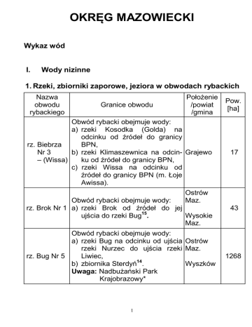 OKRĘG MAZOWIECKI Wykaz wód I. Wody nizinne 1. Rzeki, zbiorniki zaporowe, jeziora w obwodach rybackich Nazwa obwodu rybackiego Granice obwodu Położenie /powiat /gmina Obwód rybacki obejmuje wody: a) rzeki Kosodka (Golda) na odcinku od źródeł do granicy rz. Biebrza BPN, Nr 3 b) rzeki Klimaszewnica na odcin- Grajewo – (Wissa) ku od źródeł do granicy BPN, c) rzeki Wissa na odcinku od źródeł do granicy BPN (m. Łoje Awissa). Pow. [ha] 17 Ostrów Maz. Obwód rybacki obejmuje wody: rz. Brok Nr 1 a) rzeki Brok od źródeł do jej ujścia do rzeki Bug15. Wysokie Maz. Obwód rybacki obejmuje wody: a) rzeki Bug na odcinku od ujścia Ostrów rzeki Nurzec do ujścia rzeki Maz. rz. Bug Nr 5 Liwiec, b) zbiornika Sterdyń14. Wyszków Uwaga: Nadbużański Park Krajobrazowy* 1 43 1268 Nazwa obwodu rybackiego Granice obwodu Położenie /powiat /gmina Obwód rybacki obejmuje wody: a) rzeki Ełk na odcinku od jazu piętrzącego elektrowni w m. Nowa Wieś Ełcka do granicy Biebrzańskiego Parku Narodowego, Ełk, rz. Ełk Nr 45 b) Kanału Kuwasy na odcinku od osi podłużnej mostu w Grajewo m. Czarna Wieś do rzeki Ełk, c) Kanału Rudzkiego na odcinku od rzeki Ełk do granicy Biebrzańskiego Parku Narodowego. rz. Jegrznia Nr 11 rz. Jeziorka Nr 1 rz. Narew Nr 6 Obwód rybacki obejmuje wody: a) rzeki Jegrznia na odcinku od ujścia cieku Zgniłka do granicy Grajewo Biebrzańskiego Parku Narodowego. Obwód rybacki obejmuje wody: a) rzeki Jeziorka od zbiornika w Głuchowie do jej ujścia do Grójec, rzeki Wisła, b) zbiornika Głuchów14, Piaseczno c) zbiornika Osieczek14, d) rzeki Kraska od jej źródeł do jej ujścia do rzeki Jeziorka. Obwód rybacki obejmuje wody: a) rzeki Narew na odcinku od ujścia rzeki Szkwa do ujścia rzeki Orzyc, b) jeziora Sieluńskie, c) starorzecza Zimna Woda. 2 Pow. [ha] 103 6 120 Maków Maz., Ostrołęka, 1025 Pułtusk, Wyszków Nazwa obwodu rybackiego Zbiornik Zegrzyński na rzece Narew Nr 7 rz. Narew Nr 8 rz. Nurzec Nr 1 Granice obwodu Obwód rybacki obejmuje wody: a) rzeki Narew na odcinku od ujścia rzeki Orzyc do czoła zapory zbiornika Zegrzyńskiego w Dębem, b) rzeki Bug na odcinku od ujścia rzeki Liwiec do jej ujścia do zbiornika Zegrzyńskiego, c) Kanału Żerańskiego, d) jeziora Stawinoga (Buchta Stawinoga), e) rzeki Prut, f) rzeki Długa, Uwaga: Nadbużański Park Krajobrazowy* Obwód rybacki obejmuje wody: a) rzeki Narew na odcinku od czoła zapory zbiornika Zegrzyńskiego do jej ujścia do rzeki Wisła, b) jeziora Góra11. Położenie /powiat /gmina Legionowo, Pułtusk, 3852 Wołomin, Wyszków Legionowo, 487 Nowy Dwór Maz. Bielsk Obwód rybacki obejmuje wody: Podlaski, a) rzeki Nurzec na odcinku od źródeł do jej ujścia do rzeki CiechanoBug, wiec, b) zbiornika Repczyce14, c) zbiornika Ciechanowiec** Hajnówka 3 Pow. [ha] 153 Nazwa obwodu rybackiego rz. Omulew Nr 1 rz. Orz Nr 1 rz. Orzyc Nr 1 rz. Rozoga Nr 1 Położenie /powiat /gmina Pow. [ha] Obwód rybacki obejmuje wody: a) rzeki Omulew od przepławki poniżej wypływu z jeziora Omulew do jej ujścia do rzeki Narew, b) rzeki Sawica na odcinku od osi Ostrołęka, podłużnej mostu na drodze Sasek Wielki – Sasek Mały, Szczytno c) rzeki Czarka, d) rzeki Wałpusza od jazu piętrzącego w m. Młyńsko, e) rzeki Lejkowska Struga (Wielki Rów). 188 Obwód rybacki obejmuje wody: Ostrołęka, a) rzeki Orz od jej źródeł do jej ujścia do rzeki Narew, Ostrów 14 b) zbiornika Grodzisk . Maz. 23 Maków Obwód rybacki obejmuje wody: Maz., a) rzeki Orzyc od jej źródeł do jej ujścia do rzeki Narew, Mława, b) zbiornika Łoje14, c) zbiornika Karwacz14. Przasnysz 208 Obwód rybacki obejmuje wody: a) rzeki Rozoga na odcinku od wypływu z jeziora Marksoby do Ostrołęka, jej ujścia do rzeki Narew, b) Kanału Wach na odcinku Szczytno długości 13,0 km, c) zbiornika Wykrot k/Myszyńca** 42 Granice obwodu 4 Nazwa obwodu rybackiego rz. Rządza Nr 1 rz. Szkwa Nr 1 rz. Świder Nr 1 Granice obwodu Położenie /powiat /gmina Pow. [ha] Obwód rybacki obejmuje wody: a) zbiorników w m. Witkowizna Mińsk i m. Rządza, Maz., b) rzeki Rządza od mostu kolejowego na trasie Mińsk Maz. – Wołomin Tłuszcz do jej ujścia do zbiornika Zegrzyńskiego. 42 Obwód rybacki obejmuje wody: a) rzeki Rozoga (Szkwa) od wypływu z jeziora Świętajno do Ostrołęka, mostu w m. Rozogi, b) rzeki Szkwa od mostu w m. Szczytno Rozogi do jej ujścia do rzeki Narew. 33 Obwód rybacki obejmuje wody: a) rzeki Świder od jej źródeł do mostu w m. Dłużew, b) rzeki Świder od mostu w m. Świdry Wielkie do jej ujścia do rzeki Wisły, c) rzeki Mienia od źródeł do m. Wiązowna oraz staw Łazienki na rz. Srebrna w m. Mińsk Mazowiecki. Uwaga: Rezerwat przyrody „Świder” – zakaz połowu ryb na rzece Świder od m. Dłużew do mostu w Świdrach Wielkich oraz rzeki Mienia od m. Wiązowna do jej ujścia. 86 5 Łuków, Mińsk Maz., Otwock Nazwa obwodu rybackiego rz. Utrata Nr 1 rz. Wisła Nr 3 rz. Wisła Nr 4 Granice obwodu Położenie Pow. /powiat [ha] /gmina Pruszków, Obwód rybacki obejmuje wody: a) rzeki Utrata od jej źródeł do jej Sochaujścia do rzeki Bzura, czew, b) rzeki Rokitnica od jej źródeł do jej ujścia do rzeki Utrata. Warszawa Zachód Obwód rybacki obejmuje wody: a) rzeki Wisła na odcinku od ujścia rzeki Pilica do ujścia rzeki Narew, b) jezioro Czerskie, c) jezioro Gocławskie14, d) jezioro Kamionkowskie14, e) jeziora Rokola14 , f) jeziora Wilanowskie, g) stawy Skaryszewskie14. 46 Nowy Dwór Maz., Otwock, 4744 Piaseczno, Warszawa Nowy Dwór Maz., Obwód rybacki obejmuje wody: a) rzeki Wisła na odcinku od ujścia rzeki Narew do ujścia Płock, rzeki Mołtawa. 3240 Płońsk j.Białobrzegi na cieku bez nazwy Nr 1 Obwód rybacki obejmuje wody: Płock a) jeziora Białobrzegi wraz z naturalnymi dopływami gm. i odpływem do rzeki Wisła (do Bodzanów przepompowni w Wykowie). 6 9,69 Nazwa obwodu rybackiego j. Borowiec (Wildno) na cieku Struga Wilenica Granice obwodu Położenie /powiat /gmina Obwód rybacki obejmuj