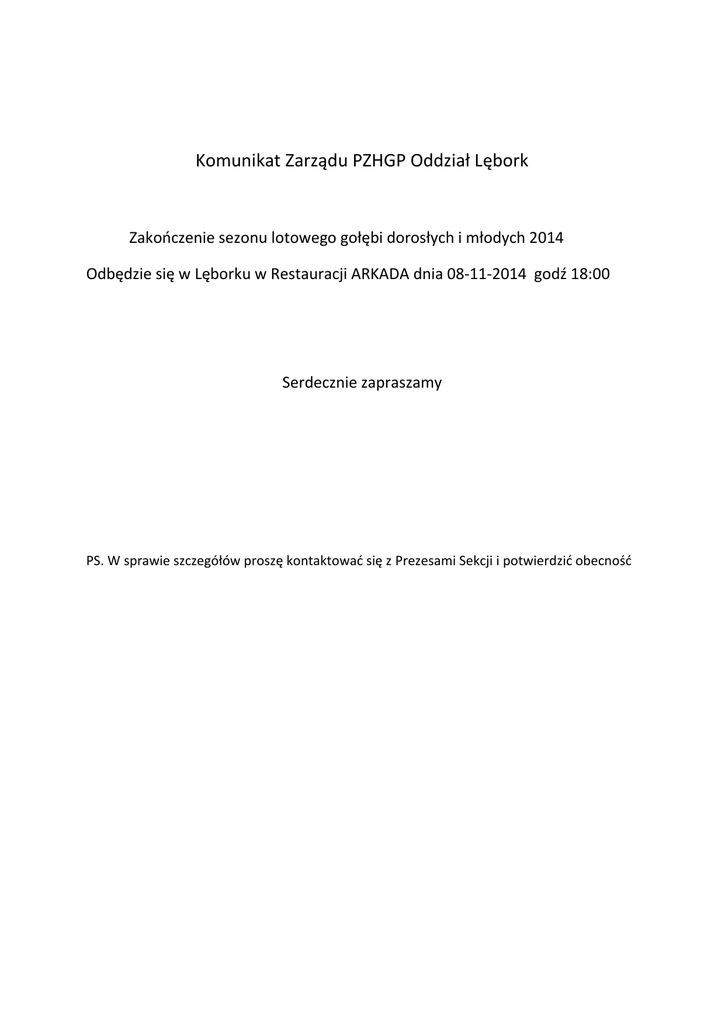 Komunikat Zarządu PZHGP Oddział Lębork Zakończenie sezonu lotowego gołębi dorosłych i młodych 2014 Odbędzie się w Lęborku w Restauracji ARKADA dnia 08-11-2014 godź 18:00 Serdecznie zapraszamy PS. W sprawie szczegółów proszę kontaktować się z Prezesami Sekcji i potwierdzić obecność