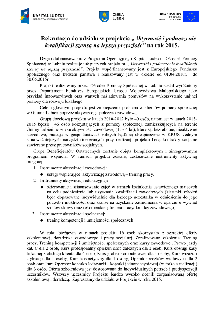 Rekrutacja do udziału w projekcie „Aktywność i podnoszenie kwalifikacji szansą na lepszą przyszłość” na rok 2015. Dzięki dofinansowaniu z Programu Operacyjnego Kapitał Ludzki Ośrodek Pomocy Społecznej w Lubniu realizuje już piąty rok projekt pt. „Aktywność i podnoszenie kwalifikacji szansą na lepszą przyszłość”. Projekt współfinansowany jest z Europejskiego Funduszu Społecznego oraz budżetu państwa i realizowany jest w okresie od 01.04.2010r. do 30.06.2015r. Projekt realizowany przez Ośrodek Pomocy Społecznej w Lubniu został wyróżniony przez Departament Funduszy Europejskich Urzędu Województwa Małopolskiego jako przykład innowacyjnych oraz wartych naśladowania pomysłów na wykorzystanie unijnej pomocy dla rozwoju lokalnego. Celem głównym projektu jest zmniejszenie problemów klientów pomocy społecznej w Gminie Lubień poprzez aktywizację społeczno-zawodową. Grupą docelową projektu w latach 2010-2012 było 40 osób, natomiast w latach 20132015 będzie 46 osób korzystających z pomocy społecznej, zamieszkujących na terenie Gminy Lubień w wieku aktywności zawodowej (15-64 lat), które są: bezrobotne, nieaktywne zawodowo, pracują w gospodarstwach rolnych bądź są ubezpieczone w KRUS. Jednym z najważniejszych narzędzi stosowanych przy realizacji projektu będą kontrakty socjalne zawierane przez pracowników socjalnych. Grupa Beneficjentów Ostatecznych zostanie objęta kompleksowym i zintegrowanym programem wsparcia. W ramach projektu zostaną zastosowane instrumenty aktywnej integracji: 1. Instrumenty aktywizacji zawodowej: usługi wspierające aktywizację zawodową – trening pracy. 2. Instrumenty aktywizacji edukacyjnej: skierowanie i sfinansowanie zajęć w ramach kształcenia ustawicznego mających na celu podniesienie lub uzyskanie kwalifikacji zawodowych (kierunki szkoleń będą dopasowane indywidualnie dla każdego uczestnika w odniesieniu do jego potrzeb i możliwości oraz szanse na uzyskanie zatrudnienia w oparciu o wywiad środowiskowy oraz rekomendację trenera pracy/doradcy zawodowego). 3. Instrumenty aktywizacji społecznej: trening kompetencji i umiejętności społecznych W roku bieżącym w ramach projektu 16 osób skorzystało z szerokiej oferty szkoleniowej, doradztwa zawodowego i pracy socjalnej. Zrealizowano szkolenia: Trening pracy, Trening kompetencji i umiejętności społecznych oraz kursy zawodowe:, Prawo jazdy kat. C dla 2 osób, Kurs profesjonalny opiekun osób zależnych dla 2 osób, Kurs obsługi kasy fiskalnej z obsługą klienta dla 4 osób, Kurs grafiki komputerowej dla 1 osoby, Kurs wizażu i stylizacji dla 1 osoby, Kurs kosmetyczny dla 1 osoby, Operator wózków widłowych dla 2 osób oraz kurs Operator koparko ładowarki i koparki jednonaczyniowej (w trakcie realizacji) dla 3 osób. Oferta szkoleniowa jest dostosowana do indywidualnych potrzeb i predyspozycji uczestników. Wszyscy uczestnicy Projektu bardzo wysoko ocenili zorganizowaną ofertę szkoleniową i doradczą. Zapraszamy do udziału w Projekcie w roku 2015. Uczestnictwo w projekcie jest bezpłatne. Osoby zainteresowane udziałem w Projekcie w okresie styczeń-czerwiec 2015 proszone są o zapoznanie się z dokumentacją rekrutacyjną oraz kontakt z Biurem Projektu mieszczącym się w Ośrodku Pomocy Społecznym w Lubniu pokój nr 23. Grupę docelową stanowić będzie w 2015 roku 14 osób. Biuro czynne jest w poniedziałek od godziny 8:00-16:00, wtorek – piątek w godzinach od 7:45-15:45. Kontakt telefoniczny pod numerem: (18) 26 82 123, 724914697, e-mail: ops@lubień.pl Dokumenty rekrutacyjne można składać do 31.12.2014r. Dokumenty do pobrania: Ankieta rekrutacyjna Regulamin uczestnictwa w projekcie