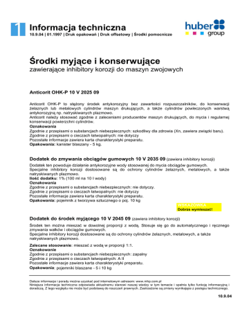 Informacja techniczna 10.9.04 | 01.1997 | Druk opakowa | Druk offsetowy | rodki pomocnicze rodki myjce i konserwujce zawierajce inhibitory korozji do maszyn zwojowych Anticorit OHK-P 10 V 2025 09 Anticorit OHK-P to stony rodek antykorozyjny bez zawartoci rozpuszczalników, do konserwacji elaznych lub metalowych cylindrów maszyn drukujcych, a take cylindrów powleczonych warstw antykorozyjn np. natryskiwanych plazmowo. Anticorit naley stosowa zgodnie z zaleceniami producentów maszyn drukujcych, do mycia i regularnej konserwacji powierzchni cylindrów. Oznakowania Zgodnie z przepisami o substancjach niebezpiecznych: szkodliwy dla zdrowia (Xn, zawiera zwizki baru). Zgodnie z przepisami o cieczach atwopalnych: nie dotyczy Pozostae informacje zawiera karta charakterystyki preparatu. Opakowania: kanister blaszany - 5 kg. Dodatek do zmywania obcigów gumowych 10 V 2035 09 (zawiera inhibitory korozji) Dodatek ten powoduje dziaanie antykorozyjne wody stosowanej do mycia obcigów gumowych. Specjalne inhibitory korozji dostosowane s do ochrony cylindrów elaznych, metalowych, a take natryskiwanych plazmowo. Ilo dodatku: 1% (100 ml na 10 I wody) Oznakowania Zgodnie z przepisami o substancjach niebezpiecznych: nie dotyczy. Zgodnie z przepisami o cieczach atwopalnych: nie dotyczy Pozostae informacje zawiera karta charakterystyki preparatu. WSKAZÓWKA Opakowania: pojemnik z tworzywa sztucznego o poj. 10 kg WSKAZÓWKA Dobrze wymiesza! Dodatek do rodek myjcego 10 V 2045 09 (zawiera inhibitory korozji) rodek ten mona miesza w dowolnej proporcji z wod. Stosuje si go do automatycznego i rcznego zmywania waków i obcigów gumowych. Specjalne inhibitory korozji dostosowane s do ochrony cylindrów elaznych, metalowych, a take natryskiwanych plazmowo. Zalecane stosowanie: miesza z wod w proporcji 1:1. Oznakowanie Zgodnie z przepisami o substancjach niebezpiecznych: zapalny Zgodnie z przepisami o cieczach atwopalnych: A II Pozostae informacje zawiera karta charakterystyki preparatu. Opakowania: pojemniki blaszane - 5 i 10 kg Dalsze informacje i porady mona uzyska pod internetowym adresem: www.mhp.com.pl Niniejsza informacja techniczna odpowiada aktualnemu stanowi naszej wiedzy w tym temacie i spenia tylko funkcj informacyjn i doradcz. Z tego wzgldu nie moe by podstaw do roszcze prawnych. Zastrzeone s zmiany wynikajce z postpu technicznego. 10.9.04