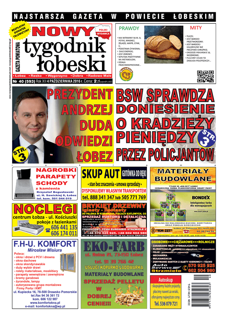 www.nowytygodniklobeski.ple-mail: [email protected] NAJSTARSZA GAZETA W POWIECIE ŁOBESKIM Nr 40 (593) Rok XII 4 PAŹDZIERNIKA 2016 r. Cena: 2 zł(wtym8% VAT) r e k l a m a Str.2 RÓżNE www.nowytygodniklobeski.pl www.nowytygodniklobeski.pl 4 PAŹDZIERNIKA 2016 r. „STOP ABORCJI” VS „RATUJMY KOBIETY”, CZYLI KILKA SŁÓW NA DRAŻLIWY TEMAT nia płodu ludzkiego’. I że to gwałt na wolności ludzkiej. Po jaką więc cholerę wysyłamy mediatorów do samobójców - przecież to gwałt na wolności ludzkiej. Dlaczego wysyłamy policję, kiedy zagrożone jest życie ludzkie – pozwólmy konsekwentnie na to by zabijać zagrożonych. W ogóle znów absolutyzujemy wolność. Wolność, tak jak życie nie jest najwyższą wartością. Jest nią miłość. Gdyby była nią wolność, nie wolno byłoby wsadzać ludzi do więzienia i pozbawiać ich wolności. Cieszy mnie to, że obronę życia ludzkiego wiąże się z Kościołem, bo to znaczy, że Kościół ma głowę na karku broniąc życia. Aczkolwiek obrona życia wypływa nie z wiary, Trudno o roztropny komentarz do tego, co dzieje się wokół obywatelskiego projektu ustawy „Stop aborcji”. W dyskusji tej na szali postawione jest bowiem Ks. Bartek racjonalne myślenie, czyli to, co nas wyróżnia np. Rajewski od szympansa czy żaby. Są dwa systemy. Jeden system mówi, że życie jest wartością zawsze i wszędzie i każdy człowiek ma taką samą godność. Dlatego chronimy dziecko, czy chore czy zdrowe, czy z gwałtu, czy w patologicznej rodzinie. Drugi system mówi, że wartość życia zależy od jego przydatności. Człowiek jest w jakimś sensie towarem i towar wybrakowany jest nieprzydatny. Zdecydowanie wybieram pierwszy sposób. Abstrahując od kwestii politycznych (tutaj mam wrażenie - podkreślam: wrażenie – że niektórym nie chodzi tyle o ochronę życia, co udowodnienie swojej racji, przeforsowanie wizji, pokazanie wyższości – obym się mylił – może się to na nas zemścić szybciej niż się spodziewamy), ochrona życia była, jest i zawsze będzie priorytetem dla Kościoła. Kościół wielokrotnie zajmował i wciąż zajmuje stanowisko w sprawie prawnej ochrony życia, ale nie wypowiada się – wbrew temu, co usiłuje się nam wmówić – w kwestii penalizacji, czyli uznania danego czynu (w tym przypadku zabicia dziecka) za karalny. Tyle mojego komentarza. Dalej chciałbym zacytować o. Grzegorza Kramera SJ, z którym się zgadzam, a który doskonale ubrał w słowa i wyraził to, co myślę i czuję. Napisał: „Mówią mi, że państwo chce się wtrącić do możliwości zabijania, przepraszam do możliwości ‚usuwa- a z humanizmu. BTW nie mogę być za obroną jednych dzieci (stop biciu), a zarazem za pozwoleniem zabijania innych dzieci. To jest nielogiczne”. I znów wracamy do punktu wyjścia – w dyskusji o aborcji na szali postawiona jest logika i racjonalne myślenie. A już najbardziej irytują mnie nielogiczne i irracjonalne argumenty typu: mój brzuch, moje ciało, moja macica. Ktoś kiedyś napisał, chyba ks. Wojciech Węgrzyniak, że z decydowaniem o własnej macicy jest trochę tak, jak z tym góralem, który się spowiadał, że zrzucił kożuch z dachu. Zapomniał jeno dodać, że w kożuch zawinięta była teściowa. KOLIZJA NA K-20 (GMINA WĘGORZYNO) W sobotę 1 października około godziny 12:40 na drodze krajowej K-20 doszło do kolizji drogowej. Jak udało POD PEGAZEM CHMURY I CZEREŚNIE p Panie, a po co tak patrzeć do góry Przecież tam nic nie ma, tam są tylko chmury Lepiej mocno stąpać, bo się różnie zdarza Lepiej zejść na ziemię i lepiej uważać r o g nam się ustalić, na łuku drogi kierujący samochodem osobowym Opel Astra, Adrian W. z Węgorzyna, stracił panowanie nad pojazdem, następnie n o z a zjechał do przydrożnego rowu, gdzie uderzył pojazdem w ogrodzenie posesji. W wyniku tego zdarzeniu p o zniszczeniu uległ samochód i ogrodzenie. Kierujący był trzeźwy i podróżował sam. (sc, foto: czytelnik) g o d y Czereśnie ze straganu w mig się rozsypały Jak bezradne dziecko przed kramarką stałeś Pełen zatroskania i pełen zdziwienia Próżno wypatrując w oczach przebaczenia Zniknęły pretensje i wszystkie ataki Gdy czereśnie w dzioby pozbierały szpaki Zniknęła kramarka razem z grosikami A ty poleciałeś wzrokiem za ptakami I nikt cię nie widział, gdy znów z głową w chmurach Patrzyłeś na ptasie, delikatne pióra Tylko ja widziałam, tylko mnie wzruszyło A może po prostu to się tylko śniło… roma rappe źródło: www.instytutmeteo.pl Tłum się zebrał spory i kiwał głowami Gdy pani z uporem rzucała słowami Chciałeś wytłumaczyć, lecz mowa przedwcześnie Kiedy dookoła leżały czereśnie SONDA: Podczas imprezy “Pożegnanie Lata” w SP2 w Łobzie zapytaliśmy uczniów o zaobserwowane pierwsze oznaki jesieni. Hania Kacper Nadia z Łobza z Łobza z Łobza Zaobserwowałam, że liście na drzewach zmieniają kolory na żółte, czerwone, pomarańczowe. Rano jak idę do szkoły jest chłodno i czasami widać mgłę. Ptaki zaczęły już odlatywać do ciepłych krajów. Zauważyłem, że drzewa robią się kolorowe i gubią liście. Rano jak idę do szkoły muszę ubrać kurtkę bo jest zimno. W klasie trochę osób już się przeziębiło. Pierwszą oznaką jesieni jest to, że liście zaczęły już spadać z drzew i zmieniać kolor. Na drzewach dojrzewa jarzębina. W parku trzeba uważać na głowę, bo spadają kasztany. reklama w gazecie, tel./fax: 91 39 70 990, kom. 607 721 607, e-mail: [email protected] Str.3 RÓŻNE www.nowytygodniklobeski.pl www.nowytygodniklobeski.pl 4 PAŹDZIERNIKA 2016 r. Sygnały czytelników BSW SPRAWDZA DONIESIENIE O KRADZIEŻY PIENIĘDZY PRZEZ POLICJANTÓW (ŁOBEZ) W minionym tygodniu do naszej redakcji dotarły sygnały, że w Komendzie Powiatowej Policji w Łobzie pojawili się funkcjonariusze Biura Spraw Wewnętrznych KWP Szczecin (takiej policji w policji – dop. red.). Czytelnicy