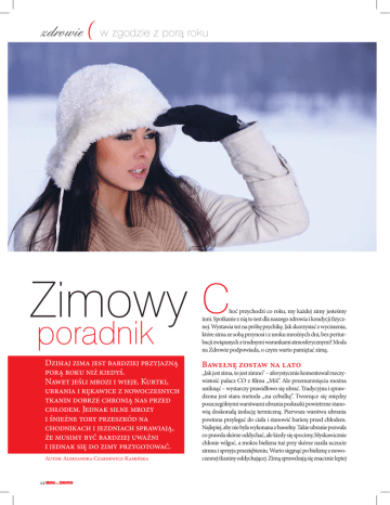 zdrowie ( w zgodzie z porą roku Zimowy C poradnik Dzisiaj zima jest bardziej przyjazną porą roku niż kiedyś. Nawet jeśli mrozi i wieje. Kurtki, ubrania i rękawice z nowoczesnych tkanin dobrze chronią nas przed chłodem. Jednak silne mrozy i śnieżne tory przeszkód na chodnikach i jezdniach sprawiają, że musimy być bardziej uważni i jednak się do zimy przygotować. Autor: Aleksandra Czarnewicz-Kamińska 44 hoć przychodzi co roku, my każdej zimy jesteśmy inni. Spotkanie z nią to test dla naszego zdrowia i kondycji fizycznej. Wystawia też na próbę psychikę. Jak skorzystać z wyciszenia, które zima ze sobą przynosi i z uroku mroźnych dni, bez perturbacji związanych z trudnymi warunkami atmosferycznymi? Moda na Zdrowie podpowiada, o czym warto pamiętać zimą. Bawełnę zostaw na lato „Jak jest zima, to jest zimno” – aforystycznie komentował rzeczywistość palacz CO z filmu „Miś”. Ale przemarznięcia można uniknąć – wystarczy prawidłowo się ubrać. Tradycyjna i sprawdzona jest stara metoda „na cebulkę”. Tworzące się między poszczególnymi warstwami ubrania poduszki powietrzne stanowią doskonałą izolację termiczną. Pierwsza warstwa ubrania powinna przylegać do ciała i stanowić barierę przed chłodem. Najlepiej, aby nie była wykonana z bawełny. Takie ubranie pozwala co prawda skórze oddychać, ale kiedy się spocimy, błyskawicznie chłonie wilgoć, a mokra bielizna tuż przy skórze nasila uczucie zimna i sprzyja przeziębieniu. Warto sięgnąć po bieliznę z nowoczesnej tkaniny oddychającej. Zimą sprawdzają się znacznie lepiej niż tak lubiana przez nas bawełna. T-shirty zostawmy jednak na lato, kiedy nasz organizm potrzebuje chłodzenia. Zimą łapmy i zatrzymujmy ciepło na wszelkie sposoby. Koszulki jak termos Taka trzymająca ciepło odzież jest wykonana ze specjalnych włókien termoaktywnych. Można ją kupić w sklepach z akcesoriami sportowymi oraz niektórych sklepach bieliźniarskich (Gatta, Schiesser). Sprawdzają się nie tylko na stoku, ale też na spacerze w zimowy mroźny dzień. Bieliznę z tkanin termoaktywnych trzeba dobierać stosownie do tego, co mamy zamiar w niej robić – leniwie spacerować po parku czy uprawiać nordic walking. Warto czytać opis na etykietach koszulek, sięgnąć po ulotki informacyjne i poprosić o radę personel sklepu. Niektóre firmy pokazują w Internecie specjalne wykresy, na których rodzaje bielizny są przypisane określonym temperaturom i intensywności aktywności. Na takim wykresie łatwo znajdziemy symbol bielizny, jaką powinniśmy kupić. Bieliznę termoaktywną z symbolem „ciepła (warm)” zakładamy, jeśli należymy do osób, które ciągle marzną i szczytem naszej aktywności jest marsz. Ci, którzy wybierają się na narty biegowe, łyżwy czy też maszerują z kijkami do nordic walking, lepiej niech wybiorą bieliznę z oznaczeniem „średnia (medium)”. Trzeba pamiętać nie tylko o koszulkach. Świetnie sprawdzają się termoaktywne majtki oraz bardzo modne legginsy. Uwaga! Odzież termoaktywną pierzemy w temperaturze najwyżej 40 st. C i nie używamy do niej proszków z wybielaczem optycznym, bo go wchłania. Najlepiej wybrać delikatny płyn lub żel. Do płukania nie stosujemy płynu zmiękczającego. Inteligentne kurtki Futra, wełnę i puchowe okrycia możemy dziś zastąpić zimowymi strojami ze specjalnie zbudowanych, nowoczesnych materiałów. Nieprzewiewne ciepłe kurtki są cienkie i bardzo wygodne. Składają się z warstwy chroniącej przed wiatrem, membrany izolującej i warstwy polaru lub fleece'u, czyli bardzo miękkiej odmiany polaru. Często ostatnia warstwa jest podpinką, którą można odpiąć, gdy robi się zbyt ciepło. Tkaniny wyposażone bywają we wbudowane poduszeczki powietrzne, które zapobiegają utracie ciepła i wnikaniu zimna. Opuszczając dom w zimowy dzień, nie można zapomnieć o czapce (przez głowę tracimy 30 proc. ciepła), szaliku i rękawiczkach, aby jeszcze bardziej zminimalizować straty ciepła. Na szczęście modne są ciepłe czapki-pilotki. FOTO: SHUTTERSTOCK Ochrona dłoni i stóp Zimą bardzo łatwo o odmrożenia. Gdy temperatura spada poniżej zera, gruczoły łojowe działają wolniej niż zwykle, ochronna warstwa lipidowa skóry staje się cieńsza, a więc jej naturalny system zabezpieczający słabnie. Szybciej traci wilgoć i jest gorzej odżywiona, bo naczynia krwionośne dostarczające tlen i składniki odżywcze się kurczą. Dlatego staje się mniej odporna na chłód i odmrożenia. Dochodzi do nich zwłaszcza u ludzi, którzy zwykle mają zimne dłonie i stopy. Te najdalej położone części ciała są u nich jeszcze słabiej zasilane przez niezbyt mocny układ krążenia. Wystarczy chwila nieuwagi, wilgotne dłonie i delikatna skóra już jest uszkodzona. Jak chronić się przed odmrożeniami? Przede wszystkim odpowiednimi rękawiczkami i skarpetami. Najlepiej przed chłodem zabezpieczają rękawiczki i skarpety z powłoką gore-tex oraz te wykonane z materiałów termoaktywnych. Nie tylko chronią przed utratą ciepła, ale też zabezpieczają przed wtargnięciem chłodu do środka. Jednocześnie przeciwdziałają poceniu się. Rękawice i skarpety powinny być długie i zaopatrzone w szerokie ściągacze, aby chronić mało ukrwione stawy. Przed zimnem pomogą chronić się także kosmetyki, które wspomagają lub wręcz zastępują warstwę lipidową. Skóra dłoni będzie odporniejsza, jeśli przed wyjściem na mróz posmarujemy ją kremem ochronnym do rąk, mającym w składzie oleje i tłuszcze. Łagodne przejścia Każdego dnia wychodzimy z pomieszczeń ogrzewanych, w których panuje temperatura około plus 20 st. C, prosto na dwór, gdzie nierzadko atmosfera jest zmrożona do minus 15 st. C. Gwałtowna zmiana temperatury nie jest obojętna dla organizmu. W momencie REKLAMA >> zdrowie (w zgodzie z porą roku z lodowatym powietrzem naczynia krwionośne, chcąc >> styku zapobiec