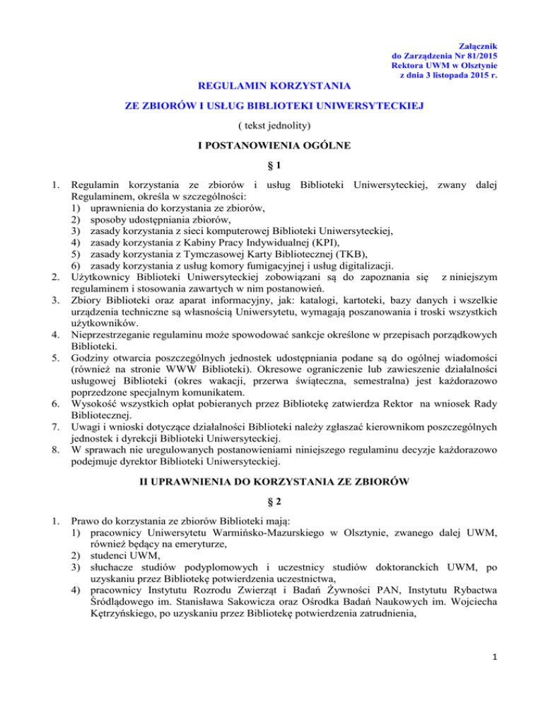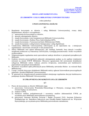 Załącznik do Zarządzenia Nr 81/2015 Rektora UWM w Olsztynie z dnia 3 listopada 2015 r. REGULAMIN KORZYSTANIA ZE ZBIORÓW I USŁUG BIBLIOTEKI UNIWERSYTECKIEJ ( tekst jednolity) I POSTANOWIENIA OGÓLNE §1 1. 2. 3. 4. 5. 6. 7. 8. Regulamin korzystania ze zbiorów i usług Biblioteki Uniwersyteckiej, zwany dalej Regulaminem, określa w szczególności: 1) uprawnienia do korzystania ze zbiorów, 2) sposoby udostępniania zbiorów, 3) zasady korzystania z sieci komputerowej Biblioteki Uniwersyteckiej, 4) zasady korzystania z Kabiny Pracy Indywidualnej (KPI), 5) zasady korzystania z Tymczasowej Karty Bibliotecznej (TKB), 6) zasady korzystania z usług komory fumigacyjnej i usług digitalizacji. Użytkownicy Biblioteki Uniwersyteckiej zobowiązani są do zapoznania się z niniejszym regulaminem i stosowania zawartych w nim postanowień. Zbiory Biblioteki oraz aparat informacyjny, jak: katalogi, kartoteki, bazy danych i wszelkie urządzenia techniczne są własnością Uniwersytetu, wymagają poszanowania i troski wszystkich użytkowników. Nieprzestrzeganie regulaminu może spowodować sankcje określone w przepisach porządkowych Biblioteki. Godziny otwarcia poszczególnych jednostek udostępniania podane są do ogólnej wiadomości (również na stronie WWW Biblioteki). Okresowe ograniczenie lub zawieszenie działalności usługowej Biblioteki (okres wakacji, przerwa świąteczna, semestralna) jest każdorazowo poprzedzone specjalnym komunikatem. Wysokość wszystkich opłat pobieranych przez Bibliotekę zatwierdza Rektor na wniosek Rady Bibliotecznej. Uwagi i wnioski dotyczące działalności Biblioteki należy zgłaszać kierownikom poszczególnych jednostek i dyrekcji Biblioteki Uniwersyteckiej. W sprawach nie uregulowanych postanowieniami niniejszego regulaminu decyzje każdorazowo podejmuje dyrektor Biblioteki Uniwersyteckiej. II UPRAWNIENIA DO KORZYSTANIA ZE ZBIORÓW §2 1. Prawo do korzystania ze zbiorów Biblioteki mają: 1) pracownicy Uniwersytetu Warmińsko-Mazurskiego w Olsztynie, zwanego dalej UWM, również będący na emeryturze, 2) studenci UWM, 3) słuchacze studiów podyplomowych i uczestnicy studiów doktoranckich UWM, po uzyskaniu przez Bibliotekę potwierdzenia uczestnictwa, 4) pracownicy Instytutu Rozrodu Zwierząt i Badań Żywności PAN, Instytutu Rybactwa Śródlądowego im. Stanisława Sakowicza oraz Ośrodka Badań Naukowych im. Wojciecha Kętrzyńskiego, po uzyskaniu przez Bibliotekę potwierdzenia zatrudnienia, 1 2. 3. 4. 5. 6. 7. 5) osoby z otwartym przewodem doktorskim na UWM i osoby przygotowujące rozprawę doktorską pod kierunkiem samodzielnego pracownika naukowo-dydaktycznego UWM, po poręczeniu promotora, 6) doktoranci Instytutu Rozrodu Zwierząt i Badań Żywności PAN, Instytutu Rybactwa Śródlądowego i Ośrodka Badań Naukowych, po poręczeniu promotora, 7) pracownicy instytucji współpracujących z UWM, po wpłaceniu kaucji zgodnie z § 10 Regulaminu; 8) na miejscu – wszystkie osoby posiadające tymczasową kartę biblioteczną wydaną przez Bibliotekę Uniwersytecką na podstawie ważnego dowodu tożsamości. Dokumentami uprawniającymi do korzystania ze zbiorów Biblioteki Uniwersyteckiej i bibliotek wydziałowych są: 1) karta biblioteczna lub elektroniczna legitymacja studencka, doktorancka i pracownicza, 2) tymczasowa karta biblioteczna – do korzystania na miejscu. Dokumenty, o których mowa w ust. 2, mają charakter dokumentów identyfikujących użytkownika, który jest odpowiedzialny za każde ich użycie i nie mogą być udostępniane osobom trzecim. Utratę karty lub legitymacji należy niezwłocznie zgłosić w celu zapobieżenia nieprawnego jej wykorzystania przez osoby postronne. Właściciel karty jest zobowiązany zawiadomić Bibliotekę o zmianach danych osobowych podanych przy rejestracji. Studenci I roku studiów stacjonarnych mają obowiązek zaliczenia zajęć z przedmiotu „Przysposobienie biblioteczne”. Biblioteka Uniwersytecka udostępnia sprzęt i oprogramowanie przystosowane do potrzeb osób niepełnosprawnych, których stan zdrowia nie pozwala na samodzielne czytanie zwykłego druku lub przetwarzanie informacji odbieranej wzrokowo, osób z dysfunkcjami słuchu oraz osób niesprawnych ruchowo. Dodatkowe uprawnienia do korzystania ze sprzętu i oprogramowania nadawane są na wniosek zainteresowanego po przedstawieniu w Wypożyczalni Głównej orzeczenia o niepełnosprawności. III SPOSOBY UDOSTĘPNIANIA ZBIORÓW §3 Korzystanie ze zbiorów 1. 2. 3. Biblioteka Uniwersytecka udostępnia swoje zbiory: 1) na miejscu, 2) poza Bibliotekę – przez wypożyczenia indywidualne, 3) przez wypożyczenia międzybiblioteczne innym bibliotekom i instytucjom. Biblioteki systemu biblioteczno-informacyjnego udostępniają swoje zbiory na podstawie wewnętrznych regulaminów opartych na regulaminie Biblioteki Uniwersyteckiej i uzgodnionych z kierownikami jednostek. Z udostępnionymi zbiorami należy obchodzić się właściwie, a wszelkie zauważone uszkodzenia lub braki należy zgłaszać dyżurnemu bibliotekarzowi. §4 Udostępnianie zbiorów na miejscu 1. Wyłącznie na miejscu korzysta się z: 1) książek oznaczonych w katalogu komputerowym statusem „wolny dostęp - *” oraz „* – na miejscu”; 2) czasopism polskich i zagranicznych; 3) zbiorów specjalnych, dzieł rzadkich i szczególnie chronionych; 4) zbiorów wydanych do roku 1945; 2 2. 3. 4. 5. 6. 7. 8. 5) prac doktorskich; 6) materiałów sprowadzonych na indywidualne zamówienie (przez wypożyczalnię międzybiblioteczną). Nieopublikowane prace doktorskie udostępniane są na prawach rękopisu w Oddziale Zbiorów Specjalnych. Zgodnie z zasadami prawa autorskiego, podstawą do udostępniania jest dołączona do pracy pisemna zgoda autora, poświadczona podpisem. Praca doktorska zaopatrzona jest w tzw. metryczkę, którą wypełnia czytelnik. W metryczce należy podać swoje imię i nazwisko oraz cel korzystania z pracy. W agendach bibliotecznych udostępniających zb