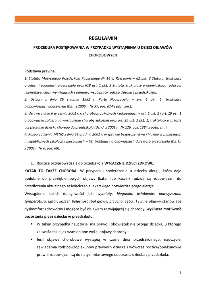 REGULAMIN PROCEDURA POSTĘPOWANIA W PRZYPADKU WYSTĄPIENIA U DZIECI OBJAWÓW CHOROBOWYCH Podstawa prawna: 1. Statutu Muzycznego Przedszkola Publicznego Nr 14 w Rzeszowie – §2 pkt. 3 Statutu, traktujący o celach i zadaniach przedszkola oraz §18 ust. 1 pkt. 3 Statutu, traktujący o obowiązkach rodziców i konsekwencjach wynikających z odmowy współpracy rodzica dziecka z przedszkolem. 2. Ustawy z dnia 26 stycznia 1982 r. Karta Nauczyciela – art. 6 pkt. 1, traktujący o obowiązkach nauczyciela (Dz. . z 2006 r. Nr 97, poz. 674 z późn.zm.), 3. Ustawa z dnia 6 września 2001 r. o chorobach zakaźnych i zakażeniach – art. 5 ust. 2 i art. 19 ust. 1 o obowiązku zgłaszania wystąpienia choroby zakaźnej oraz art. 25 ust. 2 pkt. 1, traktujący o zakazie uczęszczania dziecka chorego do przedszkola (Dz. U. z 2001 r., Nr 126, poz. 1384 z późn. zm.), 4. Rozporządzenia MENiS z dnia 31 grudnia 2002 r. w sprawie bezpieczeństwa i higieny w publicznych i niepublicznych szkołach i placówkach – §2, traktujący o obowiązkach dyrektora przedszkola (Dz. U. z 2003 r. Nr 6, poz. 69). 1. Rodzice przyprowadzają do przedszkola WYŁACZNIE DZIECI ZDROWE. KATAR TO TAKŻE CHOROBA. W przypadku stwierdzenia u dziecka alergii, która daje podobne do przeziębieniowych objawy (katar lub kaszel) rodzice są zobowiązani do przedłożenia aktualnego zaświadczenia lekarskiego potwierdzającego alergię. Wystąpienie takich dolegliwości jak: wymioty, biegunka, osłabienie, podwyższona temperatura, katar, kaszel, bolesność (ból głowy, brzucha, zęba…) i inne objawy stanowiące dyskomfort zdrowotny i mogące być objawem rozwijającej się choroby, wyklucza możliwość pozostania przez dziecko w przedszkolu. W takim przypadku nauczyciel ma prawo i obowiązek nie przyjąć dziecka, u którego zauważa takie jak wymienione wyżej objawy choroby. Jeśli objawy chorobowe wystąpią w czasie dnia przedszkolnego, nauczyciel zawiadamia rodziców/opiekunów prawnych dziecka i wówczas rodzice/opiekunowie prawni zobowiązani są do natychmiastowego odebrania dziecka z przedszkola. 1 Wyklucza się jakąkolwiek dyskusję sugerującą różne interpretacje zauważonych objawów, a prowadzącą do przekonania nauczyciela, że objawy nie są groźne i dziecko może pozostać w przedszkolu. Ani nauczyciel ani rodzic nie jest uprawniony do rozstrzygania o stanie zdrowia dziecka prezentującego wymienione wyżej objawy. Rodzic powinien udać się z dzieckiem do lekarza. 2. W stanach nagłych takich jak: utrata przez dziecko przytomności, zasłabnięcie, zemdlenie, złamanie, krwotok, zwichnięcie, urazy, ciało obce w nosie, gardle, oku, uchu, ukąszenie i użądlenie, oparzenie i odmrożenie, zatrucie i inne, gdy stan zdrowia dziecka wymaga natychmiastowej interwencji lekarskiej, nauczyciel podejmuje działania w zakresie pomocy przedmedycznej w zakresie posiadanych umiejętności i wzywa pogotowie ratunkowe. Jednocześnie o zaistniałej sytuacji nauczyciel/dyrektor przedszkola powiadamia rodziców lub opiekunów prawnych dziecka. Do czasu przybycia pogotowia ratunkowego/przybycia rodziców dziecko pozostaje pod opieką nauczyciela/dyrektora lub innej osoby z personelu przedszkola. Lekarz pogotowia decyduje o sposobie dalszego udzielenia pomocy dziecku /ewentualnego przewiezienia dziecka do szpitala/ – zostaje spisana odpowiednia notatka. W przypadku nie przybycia na czas rodziców/prawnych opiekunów dziecka, nauczyciel/opiekun zajmujący się dzieckiem jedzie z nim do szpitala i tam oczekuje na przybycie rodziców. 3. Również wystąpienie u dziecka choroby zakaźnej takiej jak: ospa, odra, świnka, różyczka, szkarlatyna, czerwonka, salmonella i inne; choroby pasożytniczej takiej jak: świerzb, wszawica, owsiki i inne; urazu np. złamanie, zranienie, oparzenie i inne; wreszcie rekonwalescencji po przebytym zabiegu chirurgicznym, wykluczają uczęszczanie dziecka do przedszkolu do czasu całkowitego wyleczenia. W celu potwierdzenia, że dziecko jest po zakończeniu leczenia, nie jest chore i nie jest potencjalnym źródłem zarażenia dla innych wychowanków przedszkola, rodzice/prawni opiekunowie zobowiązani są do dostarczenia aktualnego zaświadczenia od lekarza rodzinnego. 2 Regulamin nie wyklucza odwołania się przedszkola od opinii lekarza, jeśli objawy choroby wskazują na jej trwanie np. katar, podwyższona temperatura, obecność jaj pasożytów na włosach dziecka lub innych. W przypadku zaobserwowania choroby zakaźnej lub pasożytniczej rodzic jest zobowiązany do poinformowania o tym fakcie dyrektora przedszkola (niezależnie od obowiązków w tym względzie nałożonych na lekarza rodzinnego oraz Inspektora Służb Sanitarnych odrębnymi przepisami prawa). W celu zapobieżenia rozprzestrzenieniu się choroby w środowisku dzieci, dyrektor ma prawo poinformowania rodziców wszystkich uczęszczających do przedszkola dzieci o zaistniałej sytuacji i zobowiązania ich do wnikliwszego niż zwykle obserwowania zachowania swoich dzieci, sprawdzania czystości skóry i włosów itp. 4. W przedszkolu nie podaje się dzieciom żadnych leków doustnych, wziewnych, czy w postaci maści i żelu. Istnieją okoliczności, w których nauczyciel może podać dziecku lek (zgodnie ze stanowiskiem Ministra Zdrowia z dnia 29 listopada 2010 roku w sprawie podawania leków dzieciom przez nauczycieli w placówkach oświatowych). Jest to możliwe tylko w odniesieniu do dziecka z chorobą przewlekłą, kiedy występuje konieczność stałego podawania mu leków. Rodzice dziecka przed przyjęciem do placówki zobowiązani są do przedłożenia informacji:, na jaką przewlekłą chorobę dziecko choruje, jakie leki na zlecenie lekarza przyjmuje – nazwa leku, sposób dawkowania. Nauczyciel może wyrazić zgodę na to, że będzie podawać dziecku leki ( zał. 2), jednak konieczne jest dołączenie do wniosku rodzica o udzielenie dziecku pomocy w tym względzie, zlecenia lekarskiego oraz pisemnego imiennego u