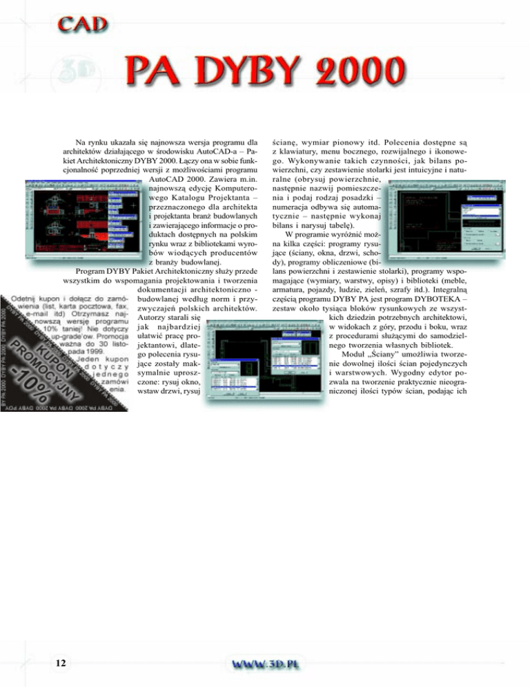 Na rynku ukaza³a siê najnowsza wersja programu dla architektów dzia³aj¹cego w rodowisku AutoCAD-a Pakiet Architektoniczny DYBY 2000. £¹czy ona w sobie funkcjonalnoæ poprzedniej wersji z mo¿liwociami programu AutoCAD 2000. Zawiera m.in. najnowsz¹ edycjê Komputerowego Katalogu Projektanta przeznaczonego dla architekta i projektanta bran¿ budowlanych i zawieraj¹cego informacje o produktach dostêpnych na polskim rynku wraz z bibliotekami wyrobów wiod¹cych producentów z bran¿y budowlanej. Program DYBY Pakiet Architektoniczny s³u¿y przede wszystkim do wspomagania projektowania i tworzenia dokumentacji architektoniczno budowlanej wed³ug norm i przyzwyczajeñ polskich architektów. Autorzy starali siê jak najbardziej u³atwiæ pracê projektantowi, dlatego polecenia rysuj¹ce zosta³y maksymalnie uproszczone: rysuj okno, wstaw drzwi, rysuj 12 cianê, wymiar pionowy itd. Polecenia dostêpne s¹ z klawiatury, menu bocznego, rozwijalnego i ikonowego. Wykonywanie takich czynnoci, jak bilans powierzchni, czy zestawienie stolarki jest intuicyjne i naturalne (obrysuj powierzchnie, nastêpnie nazwij pomieszczenia i podaj rodzaj posadzki numeracja odbywa siê automatycznie nastêpnie wykonaj bilans i narysuj tabelê). W programie wyró¿niæ mo¿na kilka czêci: programy rysuj¹ce (ciany, okna, drzwi, schody), programy obliczeniowe (bilans powierzchni i zestawienie stolarki), programy wspomagaj¹ce (wymiary, warstwy, opisy) i biblioteki (meble, armatura, pojazdy, ludzie, zieleñ, szrafy itd.). Integraln¹ czêci¹ programu DYBY PA jest program DYBOTEKA zestaw oko³o tysi¹ca bloków rysunkowych ze wszystkich dziedzin potrzebnych architektowi, w widokach z góry, przodu i boku, wraz z procedurami s³u¿¹cymi do samodzielnego tworzenia w³asnych bibliotek. Modu³ ciany umo¿liwia tworzenie dowolnej iloci cian pojedynczych i warstwowych. Wygodny edytor pozwala na tworzenie praktycznie nieograniczonej iloci typów cian, podaj¹c ich nazwy i ³¹czn¹ gruboæ. Nowe polecenia umo¿liwiaj¹ opisywanie cian na rzucie lub przekroju, a tak¿e wygodne rysowanie modularnych osi konstrukcyjnych. Osie mog¹ byæ rysowane w dowolnym (zaznaczonym) obszarze, z dowolnymi (literowo - cyfrowymi) opisami automatycznymi. Modu³ ciany umo¿liwia rysowanie zarówno cian na rzucie, jak i przekroju. Pozwala równie¿ na rysowanie cian fundamentowych i rzutu fundamentów. Modu³ Schody umo¿liwia dynamiczne rysowanie dowolnego typu schodów na rzucie, przekroju i elewacji zmiany wszelkich parametrów widoczne s¹ natychmiast w oknie dialogowym. W sposób parametryczny ustawiane s¹ wszelkie wartoci charakterystyczne, jak wysokoæ kondygnacji, wysokoæ, szerokoæ i d³ugoæ biegu, liczba stopni. Wbudowany kalkulator automatycznie przelicza parametry wed³ug zadanego wzoru ustawiaj¹c wartoci graniczne otrzymuje siê listê projektowanych schodów. Opisywanie na rzucie i przekroju odbywa siê poprzez wskazanie narysowanego obiektu, tak samo zmiana (przeprojektowanie) istniej¹cych ju¿ biegów. DYBOTEKA jest programem s³u¿¹cym do zarz¹dzania du¿¹ iloci¹ bloków w programie AutoCAD. Program przeznaczony jest dla u¿ytkowników, którzy w swej pracy wykorzystuj¹ du¿e iloci gotowych fragmentów rysunków. Ka¿dy blok w DYBOTECE (rysunek lub jego fragment) widoczny jest w oknie dialogowym z podpisem, u¿ytkownik nie musi wiêc pamiêtaæ nazw plików czêsto bardzo tajemniczych. Dodawanie nowych bloków do bibliotek jest w pe³ni automatyczne tworzy siê menu rozwijalne z bibliotekami i grupami. G³ówn¹ ide¹ Komputerowego Katalogu Projektanta jest danie architektom i projektantom bran¿ budowlanych ju¿ na etapie projektowania informacji o stosowanej technologii. Program pomaga wybraæ odpowiedni materia³ i automatycznie umieciæ go w dokumentacji technicznej, daje mo¿liwoæ wykorzystywania w projektach konkretnych wyrobów znajduj¹cych siê aktualnie na rynku budowlanym. KKP to biblioteki produktów dostêpnych na polskim rynku (materia³y i urz¹dzenia budowlane, elementy wyposa¿enia wnêtrz, meble, stolarka i inne) dostêpne bezporednio z poziomu edytora graficznego AutoCAD-a (rysunki techniczne, wykonane w formacie DWG i DXF, ca³ego lub czêci asortymentu danego producenta). Dziêki temu u¿ytkownicy systemów CAD mog¹ zaoszczêdziæ wiele godzin ¿mudnej pracy przy projektowaniu obiektów budowlanych i w prosty sposób wstawiaæ elementy z bibliotek KKP do projektu. Trójwymiarowe bry³y, np. mebli, umo¿liwiaj¹ przestrzenne modelowanie, w oparciu o konkretne, dostêpne na rynku produkty. Ich opis i specyfikacja techniczna zostaj¹ automatycznie do³¹czone do pliku projektu, umo¿liwiaj¹c wygenerowanie tabeli zestawienia architektoniczno-budowlanego, zawieraj¹cej wykaz u¿ytych w projekcie produktów wraz z niezbêdn¹ informacj¹ o parametrach technicznych. Jest to rozwi¹zanie korzystne równie¿ dla odbiorcy projektu, gdy¿ zyskuje on wraz z projektem aktualn¹ informacjê o dedykowanych produktach i ich producentach, u³atwiaj¹c¹ planowanie inwestycji oraz dokonywanie zakupów. Dodatkowo program pozwala wydrukowaæ typowe zamówienie lub zapytanie ofertowe do producenta. Cykl edycji KKP zapewnia pe³n¹ aktualnoæ oferty producentów, a kolejne wydania Katalogu s¹ rozsy³ane do wszystkich u¿ytkowników bezp³atnie. Cena: 2250,00 z³ + VAT. Wymagania programowe: program AutoCAD w wersji 14. lub 2000. Wymagania sprzêtowe: analogiczne jak dla programu AutoCAD. 13