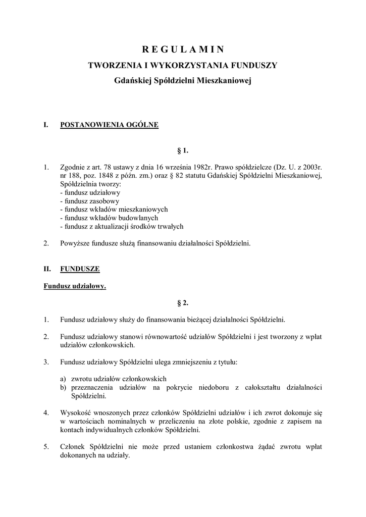 REGULAMIN TWORZENIA I WYKORZYSTANIA FUNDUSZY Gdańskiej Spółdzielni Mieszkaniowej I. POSTANOWIENIA OGÓLNE § 1. 1. Zgodnie z art. 78 ustawy z dnia 16 września 1982r. Prawo spółdzielcze (Dz. U. z 2003r. nr 188, poz. 1848 z późn. zm.) oraz § 82 statutu Gdańskiej Spółdzielni Mieszkaniowej, Spółdzielnia tworzy: - fundusz udziałowy - fundusz zasobowy - fundusz wkładów mieszkaniowych - fundusz wkładów budowlanych - fundusz z aktualizacji środków trwałych 2. Powyższe fundusze służą finansowaniu działalności Spółdzielni. II. FUNDUSZE Fundusz udziałowy. § 2. 1. Fundusz udziałowy służy do finansowania bieżącej działalności Spółdzielni. 2. Fundusz udziałowy stanowi równowartość udziałów Spółdzielni i jest tworzony z wpłat udziałów członkowskich. 3. Fundusz udziałowy Spółdzielni ulega zmniejszeniu z tytułu: a) zwrotu udziałów członkowskich b) przeznaczenia udziałów na pokrycie niedoboru z całokształtu działalności Spółdzielni. 4. Wysokość wnoszonych przez członków Spółdzielni udziałów i ich zwrot dokonuje się w wartościach nominalnych w przeliczeniu na złote polskie, zgodnie z zapisem na kontach indywidualnych członków Spółdzielni. 5. Członek Spółdzielni nie może przed ustaniem członkostwa żądać zwrotu wpłat dokonanych na udziały. -26. Członek może w deklaracji lub w odrębnym pisemnym oświadczeniu złożonym Spółdzielni wskazać osobę, której Spółdzielnia obowiązana jest po jego śmierci wypłacić udziały. Prawo z tego tytułu nie należy do spadku. Fundusz zasobowy. § 3. 1. Fundusz zasobowy finansuje majątek Spółdzielni oraz jej bieżącą działalność. 2. Fundusz zasobowy powstaje z: a) wpłat wpisowego wnoszonych przez członków b) równowartości przejętych do eksploatacji środków trwałych, wartości niematerialnych i prawnych sfinansowanych ze środków własnych Spółdzielni, c) nieodpłatnego przyjęcia środków trwałych i wartości niematerialnych i prawnych, d) spłaconych kredytów zaciągniętych przez Spółdzielnię na budowę lokali na potrzeby własne Spółdzielni oraz lokali na wynajem, e) przeniesienia skutków rewaluacji środków trwałych sprzedanych przez Spółdzielnię, f) umorzenia kredytu, g) dotacji, subwencji, dofinansowania oraz dopłat do prowadzonej przez Spółdzielnię działalności statutowej, h) uznania skutków rewaluacji środków trwałych i wartości niematerialnych i prawnych, i) pozostałych przychodów zwiększających wartość środków trwałych, j) innych przychodów, k) przychodów uzyskanych z przetargów na ustanowienie i przeniesienie odrębnej własności lokalu, stanowiących różnicę między wartością rynkową lokalu, a ceną nabycia uzyskaną w wyniku przetargu. 3. Fundusz zasobowy ulega zmniejszeniu o: a) równowartość środków trwałych przekazanych nieodpłatnie przez Spółdzielnię, b) równowartość przekazanego przez Spółdzielnię Skarbowi Państwa umorzenia kredytu w kwocie nominalnej, c) pokrycie niedoboru z całokształtu działalności Spółdzielni, d) równowartość umorzenia środków trwałych niepodlegających amortyzacji, jeżeli umorzenie to nie obciąża wkładów mieszkaniowych lub budowlanych, e) uznanie skutków deprecjacji środków trwałych i wartości niematerialnych i prawnych, f) opłaty związane z eksploatacją i utrzymaniem lokali wystawionych do przetargu do czasu ich sprzedaży, g) inne zmniejszenia. Fundusz wkładów mieszkaniowych § 4. 1. Fundusz wkładów mieszkaniowych służy do finansowania procesu inwestycyjnego prowadzonego przez Spółdzielnię w celu uzyskania mieszkań o statusie lokatorskim. 2. Fundusz wkładów mieszkaniowych tworzy się z: -3- a) wpłaconych do Spółdzielni wkładów mieszkaniowych b) uznania skutków rewaluacji zasobów mieszkaniowych finansowanych wkładami mieszkaniowymi c) należnych, lecz nie wniesionych przez członków wkładów mieszkaniowych z tytułu spłat rat kredytu zaciągniętego w celu wybudowania mieszkań lokatorskich d) dotacji, subwencji, dofinansowania oraz dopłat z tytułu prowadzonego procesu ulepszania, modernizacji itp. budynków mieszkalnych e) pozostałych przychodów zwiększających wartość środków trwałych zaliczonych do zasobów mieszkaniowych f) (skreślony) g) środków wpłaconych przez członków na wykup gruntów. 3. Fundusz wkładów mieszkaniowych zmniejszany jest z tytułu: a) zwrotu uprzednio przyjętych wkładów mieszkaniowych lub zaliczenia ich na zadłużenie, b) przeniesienia wkładu z tytułu przekształcenia prawa do lokalu, c) urzędowego zmniejszenia wartości środków trwałych, d) umorzenia. Fundusz wkładów budowlanych. § 5. 1. Fundusz wkładów budowlanych służy do finansowania procesu inwestycyjnego prowadzonego przez Spółdzielnię w celu uzyskania mieszkań o statusie własnościowym lub prawa odrębnej własności lokalu. 2. Fundusz tworzy się z: a) wpłaconych do Spółdzielni wkładów budowlanych, b) uznania skutków rewaluacji zasobów mieszkaniowych finansowanych wkładami budowlanymi c) uznania pracy własnej członka, posiadającej dla Spółdzielni wartość dającą się przeliczyć na złote polskie, w celu uzyskania mieszkania lub lokalu użytkowego o statusie własnościowym, d) wniesionych do Spółdzielni rzeczowych składników majątkowych, posiadających dla Spółdzielni wartość dającą się przeliczyć na złote polskie, której celem jest powstanie mieszkania lub lokalu użytkowego o statusie własnościowym, e) należnych, lecz nie wniesionych przez członków wkładów budowlanych z tytułu spłat rat kredytu zaciągniętego w celu wybudowania lokali własnościowych, f) przeniesienia wkładów mieszkaniowych z funduszu wkładów mieszkaniowych, g) dotacji, subwencji, dofinansowania oraz dopłat z tytułu prowadzonego procesu ulepszenia, modernizacji itp. budynków mieszkalnych, h) (skreślony) -4i) pozostałych przychodów zwiększających wartość środkó