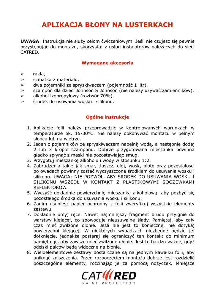 APLIKACJA BŁONY NA LUSTERKACH UWAGA: Instrukcja nie służy celom ćwiczeniowym. Jeśli nie czujesz się pewnie przystępując do montażu, skorzystaj z usług instalatorów należących do sieci CATRED. Wymagane akcesoria ➢ ➢ ➢ ➢ ➢ ➢ rakla, szmatka z materiału, dwa pojemniki ze spryskiwaczem (pojemność 1 litr), szampon dla dzieci Johnson & Johnson (nie należy używać zamienników), alkohol izopropylowy (roztwór 70%), środek do usuwania wosku i silikonu. Ogólne instrukcje 1. Aplikację folii należy przeprowadzić w kontrolowanych warunkach w temperaturze ok. 15-30°C. Nie należy dokonywać montażu w pełnym słońcu lub na wietrze. 2. Jeden z pojemników ze spryskiwaczem napełnij wodą, a następnie dodaj 2 lub 3 krople szamponu. Dobrze przygotowana mieszanka powinna gładko spłynąć z maski nie pozostawiając smug. 3. Przygotuj mieszankę alkoholu i wody w stosunku 1:2. 4. Zabrudzenia takie jak smar, tłuszcz, olej, wosk, błoto oraz pozostałości po owadach powinny zostać wyczyszczone środkiem do usuwania wosku i silikonu. UWAGA: NIE POZWÓL, ABY ŚRODEK DO USUWANIA WOSKU I SILIKONU WSZEDŁ W KONTAKT Z PLASTIKOWYMI SOCZEWKAMI REFLEKTORÓW. 5. Wyczyść dokładnie powierzchnię mieszanką alkoholową, aby pozbyć się pozostałego środka do usuwania wosku i silikonu. 6. Zanim usuniesz papier ochronny z folii zweryfikuj wszystkie elementy zestawu. 7. Dokładnie umyj ręce. Nawet najmniejszy fragment brudu przylgnie do warstwy klejącej, co spowoduje nieusuwalne ślady. Pamiętaj, aby cały czas mieć zwilżone dłonie. Jeśli nie jest to konieczne, nie dotykaj powierzchni klejącej. W niektórych wypadkach niezbędne będzie jej dotknięcie, jednakże postaraj się ograniczyć ten kontakt do minimum pamiętając, aby zawsze mieć zwilżone dłonie. Jest to bardzo ważne, gdyż odciski palców będą widoczne na błonie. 8. Wieloelementowe zestawy dostarczane są na jednym kawałku folii, aby uniknąć zniszczenia. Przed rozpoczęciem montażu dobrze jest rozdzielić poszczególne elementy, rozcinając je za pomocą nożyczek. Mniejsze elementy odłóż na bok w bezpieczne, suche miejsce do momentu, kiedy będą potrzebne. Montaż na lusterkach 1. Zwilż powierzchnię lusterka roztworem wody z alkoholem, a następnie nałóż błonę. Upewnij się, czy błona porusza się swobodnie po powierzchni lusterka. Wyrównaj błonę do brzegów lusterka, a następnie za pomocą rakli przetrzyj wzdłuż wewnętrznych skrajów lusterka. 2. Kiedy błona jest już osadzona, nałoż pod jej powierzchnię dużą ilość roztworu wody z szamponem, a następnie wytrzyj błonę papierowym ręcznikiem. 3. Połóż suchą dłoń na błonie na zewnętrznym skraju lusterka, a następnie naciągaj ją tak długo, aż nierówności znikną. 4. Używaj rakli zdecydowanymi ruchami poruszając się od wewnętrznych do zewnętrznych brzegów lusterka. 5. Za pomocą roztworu wody z alkoholem zmyj pozostałą mieszankę wody z szamponem, a następnie przetrzyj raklą pozostałe nierówności, kierując się od środka na zewnątrz. Wykonuj zdecydowane ruchy, naciskając mocno raklą. Jeśli jest to potrzebne, owiń ją papierowym ręcznikiem i dociśnij ewentualne nierówności. Wskazówki do montażu ➢ zwróć uwagę, aby wykonywać koliste ruchy, dzięki temu unikniesz uwięzienia powietrza pod błoną ➢ pęcherzyki zwykle tworzą się przy łukach oraz w zagłębieniach, w związku z tym zwróć na te fragmenty szczególną uwagę, ➢ niewskazane jest nadmierne naciąganie materiału, jednakże delikatne nacięgnięcie jest niezbędne, aby dopasować materiał, zwłaszcza na łukach. ➢ błona może być lekko podniesiona do góry, jeśli jest to konieczne dla jej wyrównania lub usunięcia pozostałego brudu, powietrza bądź nadmiernej ilości mieszanki, ➢ w przypadku wątpliwości, przed rozpoczęciem montażu zadzwoń pod numer CATRED: 508-077-727 celu uzyskania pomocy technicznej. Instrukcje dot. pielęgnacji Po zainstalowaniu błony możesz ją myć i woskować podobnie jak pozostałe części pojazdu. Możesz spotkać się z sytuacją, że wosk pozostanie na konturach maski oraz brzegach maski. Użyj miękkiej szczotki, aby delikatnie usunąć pozostały wosk. Delikatne zadrapania można zniwelować wcierając rozcieńczony alkohol izopropylowy, a następnie pozostawiając go, aby wyparował. Warstwa wosku powinna zostać nałożona na błonę zaraz po zainstalowaniu, aby zamknąć pory. Dzięki temu do folii nie będą przyklejać się owady oraz zanieczyszczenia drogowe. Używając wysokociśnieniowych spryskiwaczy nie umieszczaj końcówki węża bezpośrednio przy skraju błony, aby zapobiec jej odklejeniu. Podnoszenie narożników błony może spowodować trwałe jej uszkodzenie. Po zakończeniu aplikacji folii, należy ją nawoskować. Dzięki temu błona będzie chroniona przed absorpcją zanieczyszczeń (poleca się stosowanie produktu XPEL PPF Sealant). Zaleca się woskowanie folii raz w miesiącu.