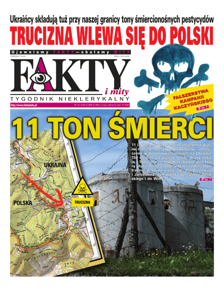 Ukraińcy składują tuż przy naszej granicy tony śmiercionośnych pestycydów TRUCIZNA WLEWA SIĘ DO POLSKI INDEKS 356441 http://www.faktyimity.pl ISSN 1509-460X Nr 26 (330) 6 LIPCA 2006 r. Cena 2,80 zł (w tym 7% VAT) Ü Str. 9 11 (a może nawet 33!) ton śmiertelnie groźnej trucizny – stężonych pestycydów – umieszczono w betonowych silosach na Ukrainie, 150 metrów od granicy Polski. Silosy pękają... Stoją one na wysokiej skarpie, pod którą płynie San – często jedyne źródło zaopatrzenia w wodę pitną, np. dla Przemyśla i Jarosławia. San wpada do Zalewu Solińskiego i do Wisły... Ü Str. 7 2 Nr 26 (330) 30 VI – 6 VII 2006 r. KSIĄDZ NAWRÓCONY KOMENTARZ NACZELNEGO FA K T Y POLSKA Sejm większością głosów (224 z koalicji rządzącej, kontra 54 z SLD, przy 101 wstrzymującego się PO) przyjął bezprecedensową uchwałę potępiającą rezolucję Parlamentu Europejskiego w sprawie rasizmu, antysemityzmu i homofobii w krajach Unii, w szczególności w Polsce. Uchwalono także, że „Sejm RP, utożsamiając się z judeochrześcijańskim dziedzictwem moralnym Europy, nie może aprobować wprowadzania do dokumentów Unii pojęć w rodzaju „homofobia”. Cuda ogłaszają! Skończy się na tym, że Polacy wyrzucą z Unii pozostałe 24 kraje, gdy uznają, że ich korzenie i działania nie są dość judeochrześcijańskie. Z podejrzeniem o współpracę z SB odeszła z rządu Zyta Gilowska, nadzieja KUL, PO, a ostatnio także PiS i Leppera. Niezatapialna Zyta wróci w rządzie Olejniczaka. Albo Rydzyka. Wydało się, że wiceszef TVP, Rafał Farfał, nie tylko wydawał faszystowskie czasopismo „Front”, ale na dodatek był publicystą „Szczerbca”, skrajnie nacjonalistycznego miesięcznika faszyzującego Narodowego Odrodzenia Polski. NOP znany jest m.in. z agresywnych („Zakaz pedałowania”) akcji antygejowskich. LPR szuka już wśród swoich orłów kandydata na miejsce Farfały. Był już kibol, neofaszysta, nie było jeszcze złodzieja samochodów. Prawdopodobnie firma Via Menagement należąca do Jana Łuczaka, kolegi Kazia Marcinkiewicza, nielegalnie wspierała kampanię wyborczą PiS. Wyszło też na jaw, że żona Kamińskiego, szefa obu zwycięskich kampanii, dostała posadę wiceszefowej w Polskiej Agencji Informacji i Inwestycji Zagranicznych. Proszę Państwa, spokojnie, to są co prawda kolesie, ale za to prawi i sprawiedliwi! Ryszard Murat, warszawski agent ubezpieczeniowy, złożył do prokuratury doniesienie o wzięciu łapówki przez premiera Kazimierza Marcinkiewicza w czasach, gdy był on jeszcze szeregowym posłem z ramienia PiS. Według Murata, Kazio łyknął 200 tys. złotych za fikcyjne doradztwo na rzecz Polskiego Towarzystwa Ubezpieczeniowego. No to teraz Ziobro dobierze się Kaziowi do skóry... Wziął i nie podzielił się?! Jarosław Wałęsa (syn Lecha), poseł PO (zarobił w ubiegłym roku 24 tys. zł), jest posiadaczem obligacji wartości 200 tys. dolarów. Jarek tłumaczy, że pieniądze na ich zakup dostał ze słynnego miliona taty. Tata natomiast mówił kiedyś, że ów milion dał na „Solidarność”... Wszystko wskazuje na to, że rząd wycofa się z projektu uruchamiania nowych przedszkoli na wsiach i w małych miasteczkach. Wstępnie miano na ten cel przeznaczyć 62 mln z Europejskiego Funduszu Społecznego. Prace nad projektem zostały zawieszone przez Romana Giertycha, ten zaś wielokrotnie deklarował, że miejsce dzieci jest przy matkach, którym chciałby dać na kształcenie pociech trochę grosza... A kto powiedział, że także gimnazjum, liceum czy wyższych studiów nie można skończyć w domu, przy mamie! Egzaminować może proboszcz podczas kolędy. POZNAŃ Prezydent Ryszard Grobelny z PO oraz jego poprzed- nik, Wojciech Szczęsny Kaczmarek (Unia Wolności), mogą trafić do więzienia za działanie na szkodę miasta przy okazji budowy centrum handlowego Kupiec Poznański. Według prokuratury, prezydenci – Grobelny – umyślnie (grozi mu do 10 lat więzienia), a Kaczmarek – nieumyślnie (do 3 lat więzienia) – narazili budżet miasta na stratę 1,2 mln zł w wyniku zaniżenia wartości gruntu sprzedanego pod centrum handlowe. A gdzie dziesiątki milionów darowanych przez Grobelnego handlarzom w sutannach? Działacz PiS i doradca europosła Marcina Libickiego, Norbert Napieraj, powiedział przed sądem okręgowym, że „wielu działaczy środowisk homoseksualnych jest zaangażowanych w promowanie pedofilii”, a „pomiędzy homoseksualistami i pedofilami zachodzi swoista unia personalna”. Słowa te zostały wypowiedziane na procesie dwóch parlamentarzystów PiS – Jacka Tomczaka i Przemysława Aleksandrowicza, którzy dwa lata temu porównali homoseksualistów do pedofilów i nekrofilów. Ależ ten Parlament Europejski się pomylił. Żeby zniesławić polskich polityków prawicy tak niesprawiedliwą rezolucją! POLSKA/WIELKA BRYTANIA Nie doszła do skutku przygoto- wywana od dawna oficjalna wizyta prezydenta Lecha Kaczyńskiego w Wielkiej Brytanii. Niemal w ostatniej chwili rząd Blaira oznajmił, że królowa i premier Zjednoczonego Królestwa nie znajdą czasu dla Kaczyńskiego. Brytyjczycy nie przyjmują u siebie również islamskich mułłów, talibów i palestyńskich terrorystów z Hamasu.... WATYKAN Nowym sekretarzem stanu (de facto – premierem) Państwa Kościelnego został kardynał Tarsicio Bertone, wieloletni podwładny kardynała Ratzingera w Kongregacji Doktryny Wiary. Bertonego zastąpił kardynał Angelo Sodano. Bertone powinien wskazać nową drogę Kościołowi. Po godzinach udziela się w mediach jako komentator meczów piłkarskich. WŁOCHY Między innymi pod hasłami antyklerykalnymi odbyły się wielkie tegoroczne pochody gejów i lesbijek w Rzymie i Turynie. Kardynał z tego ostatniego miasta, Severino Spoletto, protestował przeciwko pochodowi, twierdząc: „Nasze miasto, tak obfitujące w świętych, nie zasłużyło sobie na takie upokorzenie”. Co najm