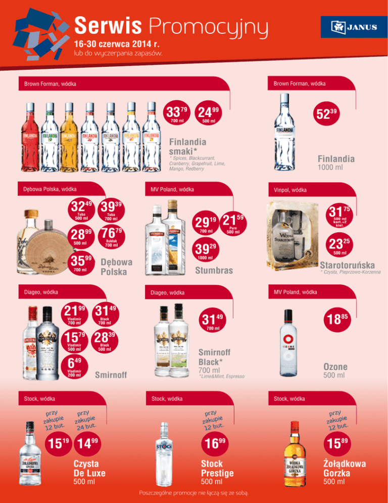 Serwis Promocyjny 16-30 czerwca 2014 r. lub do wyczerpania zapasów. Brown Forman, wódka Brown Forman, wódka 3379 2499 700 ml 5239 500 ml Finlandia smaki* Finlandia * Spices, Blackcurrant, Cranberry, Grapefruit, Lime, Mango, Redberry Dębowa Polska, wódka 1000 ml MV Poland, wódka 3249 3939 Tuba 59 700 ml 7679 28 99 700 ml Bukłak 500 ml 35 Diageo, wódka Pure 500 ml 15 79 Vladimir 6 MV Poland, wódka 700 ml 28 Black 500 ml Smirnoff Black* Ozone 700 ml Smirnoff Stock, wódka przy ie zakup t. 12 bu 1885 39 49 200 ml * Czysta, Pieprzowo-Korzenna 3149 Black 700 ml 500 ml Vladimir Starotoruńska Stumbras 2199 3149 700 ml 500 ml 1000 ml Diageo, wódka Vladimir 2325 29 Dębowa Polska 700 ml 500 ml kart.+2 kiel. 39 700 ml 99 3175 2919 21 Tuba 500 ml Vinpol, wódka 500 ml *Lime&Mint, Espresso Stock, wódka Stock, wódka przy ie zakup t. 24 bu przy ie zakup t. 12 bu przy ie zakup t. 12 bu 1519 1499 1699 1589 Czysta De Luxe 500 ml Stock Prestige 500 ml Poszczególne promocje nie łączą się ze sobą. Żołądkowa Gorzka 500 ml Express Cenowy Polmos Siedlce, wódka Pravda, wódka 1750 ml 64 75 NOWOŚĆ 115 10 700 ml Pravda z miniaturką Stanislav Espresso Pravda kart. Wyborowa, wódka NOWOŚĆ 4629 64 3559 700 ml 500 ml Chopin Rye Pravda kart. + kieliszek Espresso Diageo, whisky Akwawit, wódka 1849 1739 Pan Tadeusz Brown Forman, whisky 3099 Bell`s Original Wratislavia 500 ml Przepalany 500 ml acja inform 00ml 7 ie o cen lowca d a h u n 700 ml 75 Wyborowa, whisky 3169 700 ml Diageo, whisky 4799 4999 500 ml 1000 ml 3960 2899 700 ml Famous Grouse Ballantine’s, Diageo, whisky 9999 7999 Karton 1000 ml + 2 szkl. 700 ml 99 7099 75 700 ml J.Walker Red Label 1000ml Diageo, whisky Karton 700 ml J.Walker Black Label Diageo, whisky 44317 Blue Label 8489 Double Black Label 500 ml 4599 Irish Honey 5149 Blackbush J.Walker Bushmills 700 ml 700 ml Promocja obowiązuje w okresie 16-30 czerwca 2014 r. lub do wyczerpania zapasów. Poszczególne promocje nie łączą się ze sobą. Express Cenowy CEDC, whisky CEDC, whisky Brown Forman, whiskey 5999 2965 6086 Jack Daniel`s 500 ml 4199 4199 Ale Cask 700 ml Tullamore Dew Honey Grant`s 700 ml 700 ml CEDC, wódka CEDC, wódka CEDC, wódka 349 299 100 ml Sherry Cask 700 ml 1599 100 ml 500 ml 619 1429 200 ml 589 1369 200 ml 500 ml 500 ml Absolwent (mix*) Absolwent CEDC, wódka CEDC, wódka CEDC, wódka 379 319 100 ml 699 1649 200 ml 500 ml 100 ml 319 599 599 1349 100 ml 200 ml Soplica 200 ml Diageo, rum 3 659 3089 3999 100 ml 200 ml Żubrówka Biała Gorzka, Gorzka z miętą Diageo, rum 3999 85 (mix*) 100 ml, 200 ml, 500 ml Śliwkowa, Czarna porzeczka, Malinowa, Orzech laskowy, Pigwowa, Wiśniowa 14599 Black 700 ml Spice Gold 500 ml Spice Gold 700 ml Captain Morgan 500 ml Żytniówka Żytniówka (mix*) CEDC, wódka Soplica Cytrynówka, Grejpfrutowy, Jabłko z miętą Zacapa Centenario 23YO 700 ml Promocja obowiązuje w okresie 16-30 czerwca 2014 r. lub do wyczerpania zapasów. Poszczególne promocje nie łączą się ze sobą. Express Cenowy Bacardi Martini, rum Vinpol, likier Vinpol, gin 3129 3129 2399 2799 3129 1259 Superior Black Oakheart 350 ml Gold Canari Gin Lubuski Bacardi (mix*) 350 ml (mix*) 500 ml *Coconut Milk, Coffee, Pinacolada, Tiramisu, Toffee * Klasyczny, Lime Polmos Siedlce, likier HWS Polska, likier Diageo, likier 5149 55 28 HIT 700 ml 99 3899 38 500 ml 949 700 ml Berries 500 ml Likier Czekoladowy Wiśniowy Wild Africa Cream Sheridans Bazilio, likier 2845 700 ml Vinex, wino 500 ml MV Poland, wino 1568 1099 700 ml 1509 1288 500 ml Ciociosan Bazilio HWS Polska, wino acja inform ie o cen ca dlow u han Witosha (mix*) 750 ml * cz., b. (mix*) 750 ml * Bianco,Classico, Dry, Fragola, Grapefruit, Limone, Rosso, Sweet * Chardonnay, Pinotage, Sauvignon, Shiraz TIM, wino 9HIT 899 50 Vindicum (mix*) 750 ml *Cab.Sauv. cz.psł., Merlot cz.psł., Muscat b.psł. NOWOŚĆ Vinex, wino Tall Horse (mix*) 1000 ml Vin de Chef (mix*) 750 ml *Desserts, Fish&Seafood, Meat&Cheese, Pasta&Pizza, Salad&Chicken Promocja obowiązuje w okresie 16-30 czerwca 2014 r. lub do wyczerpania zapasów. Poszczególne promocje nie łączą się ze sobą. Express Cenowy Vinpol, wino TIM, wino Vinpol, wino musujące 9HIT30 1139 Imiglykos Egri Bikaver (mix*) 750 ml *b. psł., cz. psł., r. psł cz.wytr. 750 ml Vinpol, wino musujące Vinpol, wino 757 Henkell (mix*) 200 ml (mix*) 750 ml * Trocken, Rose, Halbtrocken * r. sł., b. sł. BWS, wino Raffaello Spumante b. sł. 750 ml Vinpol, wino musujące 415 Afrodite 655 1169 Sohnlein Brillant (mix*) 750 ml *b.płw., b.wytr., r.wytr. BWS, wino 850 999 Varna Last Harvest Kadarka Exclusive (mix*) 750 ml (mix*) 750 ml * b.płw., b.psł., cz.płw., cz.psł., r.psł.. Domain Menada, wino 1349 * cz.płw., cz.psł, r.psł CEDC, wino 599 Kadarka Old (mix*) 750 ml * cz.płw., cz.psł. 1349 Carlo Rossi (mix*) 750 ml * Red, White Moscato, Rose, White Promocja obowiązuje w okresie 16-30 czerwca 2014 r. lub do wyczerpania zapasów. Poszczególne promocje nie łączą się ze sobą. Express Cenowy Domain Menada, wino Bartex, wino Bartex, wermut 549 1099 Sophia *Blanc De Blanc, Muscat, Cabernet Sauv., Chardonnay, Melnik, Merlot, Pamid 999 1000 ml (mix*) 1000 ml Edelkirsch * Bianco, Rosso TIM, cydr Jantoń, cydr 779 15 42 Callia Cydr Polski (mix*) 750 ml 750 ml ** b. sł., b, wytr., cz. wytr. 589 Cydr Dobroński 750 ml b. psł, z Cynamonem Brown Forman, drink Jantoń, drink Bacardi Martini, drink 900 ml Istra Vermouth (mix*) 750 ml Domain Menada, wino 879 389 3479 355 250 ml 679 Finlandia Frost 500 ml Captain Tom Bacardi Coctail Mojito * Brasiliana, Guanabana, Mango Colada, Pina Colada 700 ml Brown Forman, drink Vinpol, drink 479 Jack Daniel`s (mix*) 330 ml puszka *Cola, Ginger (mix*) 250 ml puszka (mix*) *Cranberry, Lime Bacardi Martini, drink 215 zy cena pr ie zakup lek 12 bute 329 Bacardi Breezer Gin Lubuski (mix*) 275 ml * Tonic, Lime (mix*) 275 ml * Lime, Orange, Pineapple, Watermelon Promocja obowiązuje w okresie 16-30 czerwca 2014 r. lub do wyczerpania zapasó