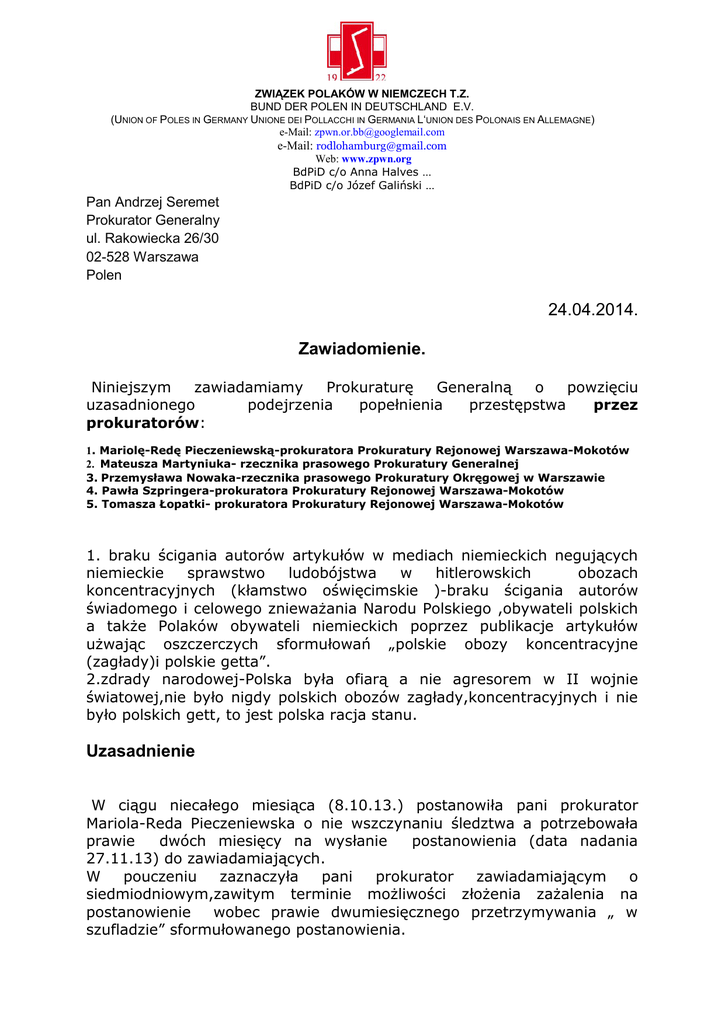 ZWIĄZEK POLAKÓW W NIEMCZECH T.Z. BUND DER POLEN IN DEUTSCHLAND E.V. (UNION OF POLES IN GERMANY UNIONE DEI POLLACCHI IN GERMANIA L‘UNION DES POLONAIS EN ALLEMAGNE) e-Mail: [email protected] e-Mail: [email protected] Web: www.zpwn.org BdPiD c/o Anna Halves … BdPiD c/o Józef Galiński … Pan Andrzej Seremet Prokurator Generalny ul. Rakowiecka 26/30 02-528 Warszawa Polen 24.04.2014. Zawiadomienie. Niniejszym zawiadamiamy Prokuraturę Generalną o powzięciu uzasadnionego podejrzenia popełnienia przestępstwa przez prokuratorów: 1. Mariolę-Redę Pieczeniewską-prokuratora Prokuratury Rejonowej Warszawa-Mokotów 2. Mateusza Martyniuka- rzecznika prasowego Prokuratury Generalnej 3. Przemysława Nowaka-rzecznika prasowego Prokuratury Okręgowej w Warszawie 4. Pawła Szpringera-prokuratora Prokuratury Rejonowej Warszawa-Mokotów 5. Tomasza Łopatki- prokuratora Prokuratury Rejonowej Warszawa-Mokotów 1. braku ścigania autorów artykułów w mediach niemieckich negujących niemieckie sprawstwo ludobójstwa w hitlerowskich obozach koncentracyjnych (kłamstwo oświęcimskie )-braku ścigania autorów świadomego i celowego znieważania Narodu Polskiego ,obywateli polskich a także Polaków obywateli niemieckich poprzez publikacje artykułów użwając oszczerczych sformułowań „polskie obozy koncentracyjne (zagłady)i polskie getta”. 2.zdrady narodowej-Polska była ofiarą a nie agresorem w II wojnie światowej,nie było nigdy polskich obozów zagłady,koncentracyjnych i nie było polskich gett, to jest polska racja stanu. Uzasadnienie W ciągu niecałego miesiąca (8.10.13.) postanowiła pani prokurator Mariola-Reda Pieczeniewska o nie wszczynaniu śledztwa a potrzebowała prawie dwóch miesięcy na wysłanie postanowienia (data nadania 27.11.13) do zawiadamiających. W pouczeniu zaznaczyła pani prokurator zawiadamiającym o siedmiodniowym,zawitym terminie możliwości złożenia zażalenia na postanowienie wobec prawie dwumiesięcznego przetrzymywania „ w szufladzie” sformułowanego postanowienia. W uzasadnieniu pani prokurator stwierdza cyt.”Nadto zauważyć należy ,iż sformułowanie”polskie obozy zagłady”choć wyjątkowo niefortunne nie miało na celu wskazania ,iż obozy takie zakładali Polacy a jedynie ,iż położone one były na ziemiach polskich”. W zawiadomieniu wskazaliśmy dwa niemieckie obozy zagłady funkcjonujące na obszarze III Rzeszy jeszcze przed zbrodniczą napaścią Niemców na Polskę. Cytat z artykułu:”…Sie kamen in das KZ Ravensbrück, wo man ihnen Kleidung, Schmuck und die gesamte Habe wegnahm und die Köpfe rasierte. Danach ging es in die Baracke 23. Auch die Schwestern galten fortan nur noch als Nummer. Janina Halina Kedziorek bekam die Nummer 40806. "Schon in der ersten Nacht ist eine Mutter, mit der ich zusammen inhaftiert wurde, gestorben", erzählte sie betroffen. Drei Monate später ging es nach Buchenwald….“. Obóz w Ravensbrück (das Konzentrationslager Ravensbrück -auch KZ Ravensbrück) był niemieckim obozem koncentracyjnym usytuowanym w wiosce Ravensbrück, niedaleko miejscowości Fürstenberg w Brandenburgii, w Niemczech. Został założony w listopadzie 1938 r., funkcjonował w latach 1939-1945. Obóz koncentracyjny w Buchenwaldzie (das Konzentrationslager Buchenwald, Konzentrationslager Buchenwald-KL Buchenwald, KZ Buchenwaldz początku był nazywany Konzentrationslager Ettersberg) był niemieckim obozem koncentracyjnym założonym w Ettersberg w pobliżu Weimaru położonym w Turyngii,Niemczech.Funkcjonował od lipca 1937 roku do końca wojny II wojny światowej . Zadaniem pani prokurator winno być dokonanie prawnokarnej oceny artykułu, ze szczególnym uwzględnieniem całokształtu okoliczności jego powstania,dlaczego został napisany. Pani prokurator winna ocenić, czy artykuł został napisany celowo, świadomie i z zamiarem znieważenia.Czy to zadanie pani prokurator wykonała???W tej konkretnej sprawie, pani prokurator wzięła w obronę autorkę artykułu zamiast ją ścigać.Jakimi przesłankami kierowała się pani prokurator Mariola-Reda Pieczeniewska i jej koledzy prokuratorzy-rzecznicy panowie Mateusz Martyniuk oraz Przemysław Nowak broniąc autorkę oszczerczego tekstu,że te obozy były „położone na ziemiach Polski” ???Skąd takie przekonanie u prokuratorów,czy posiadają dowody popierającą ich tezę???Dlaczego panowie prokuratorzy-rzecznicy jawnie i publicznie okłamywali polską opinię publiczną twierdząc,że w tej konkretnej sprawie decyzja pani prokurator była cyt:”... prawidłowa i wydana z poszanowaniem obowiązujących przepisów prawa.”Publiczne twierdzenie, że obozy w Ravensbrück i Buchenwaldzie znajdowały się ziemiach polskich jest niebotycznym kłamstwem.Takie kłamstwo mogą głosić publicznie tylko zdrajcy Narodu Polskiego!!! Sprostowanie i przeprosiny nie nastąpiły poprzez własną refleksję tak u wydawcy jak i u autorki tekstu Beate Wyglenda co sugeruje pani prokurator a były skutecznie wymuszone przez okoliczności zewnętrzne.To właśnie zewnętrzne naciski( publikacja prasowa i interwencja konsula) sprawiły ,że redakcja sprostowała oszczerczy tekst . Cyt „…Diesen Ausführungen Entschuldigung.“ schließen wir uns an und bitten um Czy wielokrotne żądanie sprostowań przez MSZ od oszczerców postawiło tamę kłamstwom o „polskich obozach zagłady”?Nie postawiło a wręcz zachęciło do dalszych publikacji oszczerstw w niemieckich mediach. Panowie prokuratorzy Paweł Szpringer i Tomasz Łopatka twierdzą,że oszczerstwa Narodu Polskiego nie były zamierzone przez redaktorów niemieckich.A jakimi to dowodami mogą pochwalić się prokuratorzy na obronę tak postawionych tez? Czy prokuratorzy posiadają zdolności przenikania do świadomości dziennikarzy niemieckich?A może też potrafią odgadnąć wolę redaktorów niemieckich mediów? A jakimi to jeszcze nadprzyrodzonymi zdolnościami mogą wykazać się panowie prokuratorzy? Dla pana proku