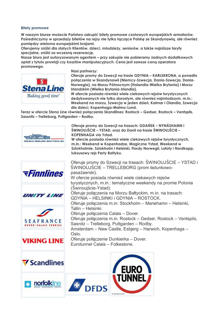 Bilety promowe W naszym biurze możecie Państwo zakupić bilety promowe czołowych europejskich armatorów. Pośredniczymy w sprzedaży biletów na rejsy nie tylko łączące Polskę ze Skandynawią, ale również pomiędzy wieloma europejskimi krajami. Oferujemy zniżki dla stałych Klientów, dzieci, młodzieży, seniorów, a także najniższe taryfy specjalne, zniżki za wczesną rezerwację. Nasze biuro jest autoryzowanym agentem – przy zakupie nie pobieramy żadnych dodatkowych opłat z tytułu prowizji czy kosztów manipulacyjnych. Cena jest zawsze ceną operatora promowego. Nasi partnerzy: Oferuje promy do Szwecji na trasie GDYNIA – KARLSKRONA, a ponadto połączenia w Skandynawii (Niemcy-Szwecja, Dania-Szwecja, DaniaNorwegia), na Morzu Północnym (Holandia-Wielka Brytania) i Morzu Irlandzkim (Wielka Brytania-Irlandia). W ofercie posiada również wiele ciekawych rejsów turystycznych dedykowanych nie tylko dorosłym, ale również najmłodszym, m.in.: Weekend na morzu, Szwecja w jeden dzień, Kalmar i Olandia, Szwecja dla dzieci, Kopenhaga-Malmo-Lund. Teraz w ofercie Stena Line również połączenia Skandlines: Rostock – Gedser, Rostock – Ventspils, Sassnitz – Trelleborg, Puttgarden – Rodby. Oferuje promy do Szwecji na trasach: GDAŃSK – NYNÄSHAMN i ŚWINOUJŚCIE – YSTAD, oraz do Danii na trasie ŚWINOUJŚCIE – KOPENHAGA via Ystad. W ofercie posiada również wiele ciekawych rejsów turystycznych, m.in.: Weekend w Kopenhadze, Magiczne Ystad, Weekend w Sztokholmie, Sztokholm i Helsinki, Fiordy Norwegii, Lofoty i Nordkapp, luksusowy rejs Perły Bałtyku. Oferuje promy do Szwecji na trasach: Ś WINOUJ ŚCIE – YSTAD i Ś WINOUJ Ś CIE – TRELLEBORG (prom ładunkowopasażaerski). W ofercie posiada równie ż wiele ciekawych rejsów turystycznych, m.in.: tematyczne weekendy na promie Polonia ( Świnouj ście-Ystad). Oferuje połączenia na Morzu Bałtyckim, m.in. na trasach: GDYNIA – HELSINKI i GDYNIA – ROSTOCK. Oferuje połączenia m.in: Stockholm – Mariehamn – Helsinki, Tallin – Helsinki. Oferuje połączenia Calais – Dover. Oferuje połączenia m.in. Rostock – Gedser, Rostock – Ventspils, Sasnitz – Trelleborg, Puttgarden – Rodby. Amsterdam – New Castle, Esbjerg – Harwich, Kopenhaga – Oslo. Oferuje połączenie Dunkierka – Dover. Eurotunnel Calais – Folkestone.
