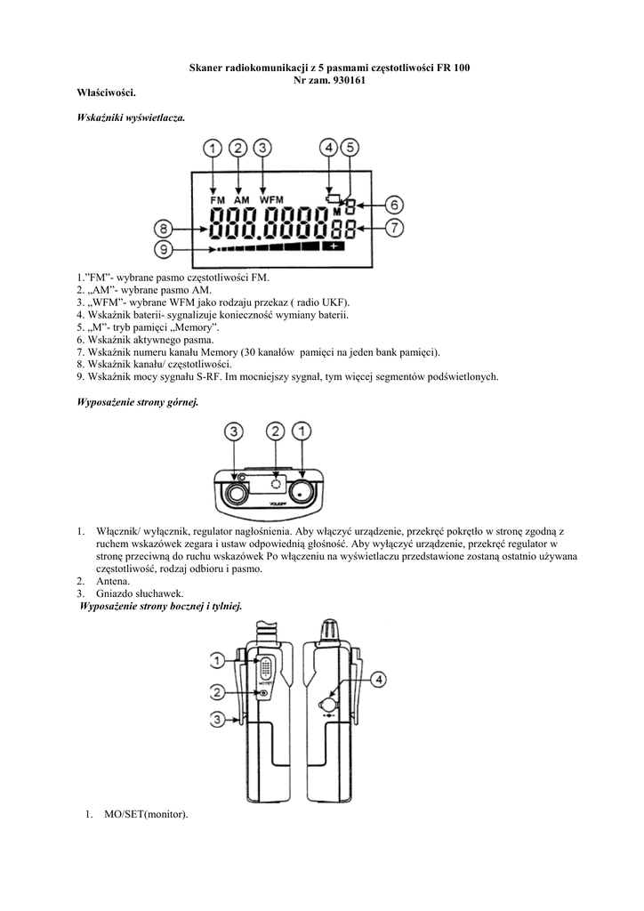 Skaner radiokomunikacji z 5 pasmami częstotliwości FR 100 Nr zam. 930161 Właściwości. Wskaźniki wyświetlacza. 1.”FM”- wybrane pasmo częstotliwości FM. 2. „AM”- wybrane pasmo AM. 3. „WFM”- wybrane WFM jako rodzaju przekaz ( radio UKF). 4. Wskaźnik baterii- sygnalizuje konieczność wymiany baterii. 5. „M”- tryb pamięci „Memory”. 6. Wskaźnik aktywnego pasma. 7. Wskaźnik numeru kanału Memory (30 kanałów pamięci na jeden bank pamięci). 8. Wskaźnik kanału/ częstotliwości. 9. Wskaźnik mocy sygnału S-RF. Im mocniejszy sygnał, tym więcej segmentów podświetlonych. Wyposażenie strony górnej. 1. Włącznik/ wyłącznik, regulator nagłośnienia. Aby włączyć urządzenie, przekręć pokrętło w stronę zgodną z ruchem wskazówek zegara i ustaw odpowiednią głośność. Aby wyłączyć urządzenie, przekręć regulator w stronę przeciwną do ruchu wskazówek Po włączeniu na wyświetlaczu przedstawione zostaną ostatnio używana częstotliwość, rodzaj odbioru i pasmo. 2. Antena. 3. Gniazdo słuchawek. Wyposażenie strony bocznej i tylniej. 1. MO/SET(monitor). MO (monitor). Naciśnij krótko przycisk MO w module odbioru, aby otworzyć Squelch (blokadę przeciwtrzaskową). Zalecane przy słabym sygnale. SET. Naciśnij, aby potwierdzić każdy wybór. 2. Lampka. Naciśnięcie przycisku powoduje uruchomienie podświetlenia na ok. 4 sekundy. Następnie wyłącza się automatycznie. Jeżeli podczas aktywnego podświetlenia naciśniesz dowolny przycisk, czas aktywacji przedłoży się o kolejne 4 sekundy. Przytrzymaj przycisk lampki dłużej niż jedną sekundę, sygnał akustyczny uruchomi się i podświetlenie wyłączy się dopiero po ponownym naciśnięciu przycisku (2). 3. Zacisk do paska. 4. Gniazdo DC. Do podłączenia oddzielnego urządzenia ładującego DC. Wyposażenie strony przedniej. 1. Przycisk wyszukiwania kanałów do przodu (▲). Naciśnij przycisk (▲), aby wybrać wyższą częstotliwość, niż wskazana na wyświetlaczu. Przytrzymaj przycisk dłużej niż 2 sekundy, aby rozpocząć proces wyszukiwania do przodu. Jeżeli sygnał zostanie odnaleziony, proces wyszukiwania zostanie przerwany na 3 sekundy, a następnie będzie dalej kontynuowany. Aby przerwać proces wyszukiwania naciśnij dowolny przycisk. Proces wyszukiwania odnosi się do jednego pasma. 2. Przycisk wyszukiwania kanałów do tyłu (▼). Naciśnij przycisk (▼), aby wybrać niższą częstotliwość, niż wskazana na wyświetlaczu. Przytrzymaj przycisk dłużej niż 2 sekundy, aby rozpocząć proces wyszukiwania do tyłu. Jeżeli sygnał zostanie odnaleziony, proces wyszukiwania zostanie przerwany na 3 sekundy, a następnie będzie dalej kontynuowany. Aby przerwać proces wyszukiwania naciśnij dowolny przycisk. Proces wyszukiwania odnosi się do jednego pasma. 3. Przycisk SEL. a). Wybór rodzaju odbioru. Dostęp możliwy jest w następujących krokach: b). Zmiana odstępów częstotliwości. FR 100 dysponuje następującymi odstępami częstotliwości: 5KHz, 8.33KHz, 10KHz, 12,5KHz, 20KHz, 25KHz, 50KHz, 100KHz, 200KHz i 1MHz. Aby zmienić odstępy częstotliwości przytrzymaj przycisk SEL przez 2 sekundy. Przyciskami UP/DOWN ustaw pożądany odstęp częstotliwości. Aby zachować ustawienie w pamięci naciśnij przycisk MO/SET. Jeżeli nie naciśniesz powyższego przycisku w przeciągu 4 sekund, aktualne wartości zostaną zapamiętane automatycznie. Uwaga: zmiany odstępów częstotliwości odnoszą się do określonego pasma. 4. Przycisk pasma. FR 100 dysponuje 5 pasmami. A pasmo: 66-88NFM (Narrow FM) B pasmo: 88-108 WFM (Wide FM –UKF) C pasmo: 108-136AM D pasmo: 136- 470NFM odstępy 25KHz odstępy 100KHz odstępy 10KHz odstępy 12,5KHz Aby wybrać pożądane pasmo naciśnij przycisk „BAND”. Wywołania pasma wykonaj w następujący sposób: Po naciśnięciu przycisku „BAND” wskazana zostanie ostatnio wywołana częstotliwość. 5. Przycisk MEM. Skaner dysponuje 30 miejscami pamięci na pasmo, na których można zaprogramować wybraną częstotliwość. a). Zapamiętanie częstotliwości. • Wybierz pożądaną częstotliwość przyciskami SEL, BAND i UP/DOWN. • Przytrzymaj przycisk MEM przez ok. 2 sekundy. • Na wyświetlaczu zostanie wskazane wolne miejsce kanału. • Wybierz pożądane miejsce w pamięci przyciskiem ▲lub ▼, przy wskazanym wskaźniku memory. • Naciśnij przycisk SET. Uwaga: Jeżeli w przeciągu 4 sekund nie naciśniesz przycisku MO/SET, aktualne wartości zostaną zapamiętane automatycznie. b). Pamięć. Dostęp do pamięci: • Naciśnij przycisk MEM. • Wybierz pożądane miejsce w pamięci przyciskiem ▲lub ▼. • Dezaktywacja: naciśnij przycisk MEM ponownie. Uwaga: jeżeli zapamiętaną częstotliwość chcesz używać w normalnym module, przytrzymaj przycisk MEM dłużej niż 2 sekundy. c). Wyszukiwanie w pomięci. • Naciśnij przycisk MEM. • Przytrzymaj przycisk ▲lub ▼ przez 2 sekundy. • Wolne miejsca w pamięci będą podczas wyszukiwania pomijane. • Aby przerwać proces wyszukiwania naciśnij dowolny przycisk d). Usunięcie zapamiętanej częstotliwości. • W module pamięci wybierz kanał, z którego chcesz usunąć częstotliwość. • Przytrzymaj przycisk MO/SET dłużej niż 2 sekundy. • Na wyświetlaczu pojawi się „ERASER”. • Naciśnij przycisk MO/SET ponownie. Sygnał akustyczny potwierdzi usunięcie częstotliwości. e). Wykasowanie wszystkich częstotliwości z kanałów pamięci. Zobacz punkt resetowanie. 6. Przycisk CUR (Cursor). Pożądaną częstotliwość możesz wprowadzić również bezpośrednio poprzez kursor w normalnym module. Przykład: Częstotliwość 145.4650MHz w paśmie VHF. • Naciskaj przycisk BAND do momentu wskazania pasma VHF FM. • Naciśnij przycisk „CUR”. Pierwsza cyfra zapali się na wyświetlaczu. • Przyciskami ▲i ▼ ustaw liczbę 1. • Naciśnij przycisk „CUR”. Druga cyfra zapali się na wyświetlaczu. • Przyciskami ▲i ▼ ustaw