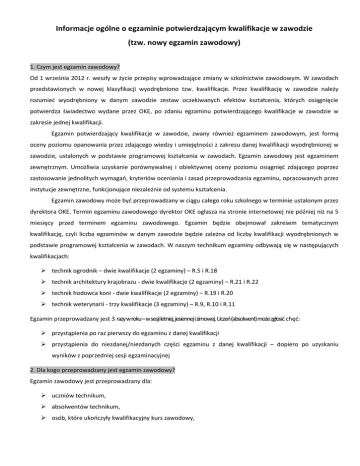 Informacje ogólne o egzaminie potwierdzającym kwalifikacje w zawodzie (tzw. nowy egzamin zawodowy) 1. Czym jest egzamin zawodowy? Od 1 września 2012 r. weszły w życie przepisy wprowadzające zmiany w szkolnictwie zawodowym. W zawodach przedstawionych w nowej klasyfikacji wyodrębniono tzw. kwalifikacje. Przez kwalifikację w zawodzie należy rozumieć wyodrębniony w danym zawodzie zestaw oczekiwanych efektów kształcenia, których osiągnięcie potwierdza świadectwo wydane przez OKE, po zdaniu egzaminu potwierdzającego kwalifikacje w zawodzie w zakresie jednej kwalifikacji. Egzamin potwierdzający kwalifikacje w zawodzie, zwany również egzaminem zawodowym, jest formą oceny poziomu opanowania przez zdającego wiedzy i umiejętności z zakresu danej kwalifikacji wyodrębnionej w zawodzie, ustalonych w podstawie programowej kształcenia w zawodach. Egzamin zawodowy jest egzaminem zewnętrznym. Umożliwia uzyskanie porównywalnej i obiektywnej oceny poziomu osiągnięć zdającego poprzez zastosowanie jednolitych wymagań, kryteriów oceniania i zasad przeprowadzania egzaminu, opracowanych przez instytucje zewnętrzne, funkcjonujące niezależnie od systemu kształcenia. Egzamin zawodowy może być przeprowadzany w ciągu całego roku szkolnego w terminie ustalonym przez dyrektora OKE. Termin egzaminu zawodowego dyrektor OKE ogłasza na stronie internetowej nie później niż na 5 miesięcy przed terminem egzaminu zawodowego. Egzamin będzie obejmował zakresem tematycznym kwalifikację, czyli liczba egzaminów w danym zawodzie będzie zależna od liczby kwalifikacji wyodrębnionych w podstawie programowej kształcenia w zawodach. W naszym technikum egzaminy odbywają się w następujących kwalifikacjach: technik ogrodnik – dwie kwalifikacje (2 egzaminy) – R.5 i R.18 technik architektury krajobrazu - dwie kwalifikacje (2 egzaminy) – R.21 i R.22 technik hodowca koni - dwie kwalifikacje (2 egzaminy) – R.19 i R.20 technik weterynarii - trzy kwalifikacje (3 egzaminy) – R.9, R.10 i R.11 Egzamin przeprowadzany jest 3 razy w roku – w sesji letniej, jesiennej i zimowej. Uczeń (absolwent) może zgłosić chęć: przystąpienia po raz pierwszy do egzaminu z danej kwalifikacji przystąpienia do niezdanej/niezdanych części egzaminu z danej kwalifikacji – dopiero po uzyskaniu wyników z poprzedniej sesji egzaminacyjnej 2. Dla kogo przeprowadzany jest egzamin zawodowy? Egzamin zawodowy jest przeprowadzany dla: uczniów technikum, absolwentów technikum, osób, które ukończyły kwalifikacyjny kurs zawodowy, 3. Wymagania, które należy spełnić, aby przystąpić do egzaminu zawodowego Jeśli jesteś uczniem, który zamierza przystąpić do egzaminu zawodowego, to powinieneś: 1) wypełnić pisemną deklarację dotyczącą przystąpienia do egzaminu zawodowego; 2) złożyć wypełnioną deklarację dyrektorowi szkoły, nie później niż na 4 miesiące przed terminem egzaminu zawodowego. Jeśli jesteś absolwentem, który zamierza przystąpić do egzaminu zawodowego, to powinieneś: 1) wypełnić pisemną deklarację dotyczącą przystąpienia do egzaminu zawodowego 2) złożyć wypełnioną deklarację dyrektorowi szkoły, nie później niż na 4 miesiące przed terminem egzaminu zawodowego; 3) dołączyć świadectwo ukończenia szkoły prowadzącej kształcenie w zawodzie z wyodrębnioną kwalifikacją, z zakresu której zamierzasz przystąpić do egzaminu zawodowego. Jeśli uczęszczasz na kwalifikacyjny kurs zawodowy, którego termin zakończenia określono nie później niż na miesiąc przed ogłoszoną przez dyrektora OKE datą rozpoczęcia egzaminu zawodowego i zamierzasz przystąpić do egzaminu zawodowego, to powinieneś: 1) wypełnić pisemną deklarację dotyczącą przystąpienia do egzaminu zawodowego 2) złożyć wypełnioną deklarację do dyrektora szkoły, nie później niż na 4 miesiące przed terminem egzaminu zawodowego; 3) dołączyć oryginał zaświadczenia o ukończeniu kwalifikacyjnego kursu zawodowego niezwłocznie po ukończeniu kursu. Jeśli ukończyłeś kwalifikacyjny kurs zawodowy i zamierzasz przystąpić do egzaminu zawodowego, to powinieneś: 1) wypełnić pisemną deklarację dotyczącą przystąpienia do egzaminu zawodowego 2) złożyć wypełnioną deklarację do dyrektora szkoły, nie później niż na 4 miesiące przed terminem egzaminu zawodowego; 3) dołączyć oryginał zaświadczenia o ukończeniu kwalifikacyjnego kursu zawodowego. 4. Miejsce przystępowania do egzaminu i czas trwania egzaminu Uczniowie/absolwenci zdają egzamin zawodowy w budynku i ogrodzie szkolnym ZSRCKU w Piasecznie. Egzamin pisemny odbywa się w sali lekcyjnej, gdzie zdający rozwiązują test wielokrotnego wyboru lub w pracowni komputerowej, gdzie rozwiązują test zamieszczony na serwerze. Egzamin praktyczny może odbywać się w naszym technikum w dwojaki sposób: 1) w formie pisemnej, jako praca z arkuszem egzaminacyjnym – efektem końcowym jest dokumentacja (d) 2) w formie wykonania zadania praktycznego w pracowni zawodowej lub na terenie ogrodu szkolnego – efektem końcowym jest wykonanie jakiejś pracy (w). Część pisemna egzaminu trwa 60 minut. Część praktyczna w zależności od formy wykonania wynosi 120-180 minut. W zawodach kształcących w naszej szkole część praktyczna odbywa się następująco: technik ogrodnik: R.5 – wykonanie zadania na terenie ogrodu lub w pracowni – 120 minut R.18 – dokumentacja pisemna w sali – 180 minut technik architektury krajobrazu: R.21 – wykonanie zadania na terenie ogrodu lub w pracowni – 120 minut R.22 – dokumentacja pisemna w sali – 180 minut technik hodowca koni: R.19 – dokumentacja pisemna w sali – 180 minut R.20 – wykonanie zadania na terenie ogrodu lub w pracowni – 180 minut technik weterynarii: R.9 – dokumentacja pisemna w sali – 120 minut R.10 – wykonanie zadania na terenie ogrodu lub w pracowni – 120 minut R.11 – wykonanie zadania na terenie ogrodu lub w pracown