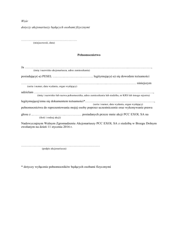 Wzór dotyczy akcjonariuszy będących osobami fizycznymi …………………………………………… (miejscowość, data) Pełnomocnictwo Ja …………………………………………………………………………………..…………………, (imię i nazwisko akcjonariusza, adres zamieszkania) posiadający(-a) PESEL ….…….…………….……….. legitymujący(-a) się dowodem tożsamości ……………………………………………………………..……..……………………… niniejszym (seria i numer, data wydania, organ wydający) udzielam ………………………………………………………………………………………………., (imię i nazwisko lub nazwa pełnomocnika, adres zamieszkania lub siedziba, nr KRS lub innego rejestru) legitymującej/emu się dokumentem tożsamości*…………….………………..………………………., (seria i numer, data wydania, organ wydający) pełnomocnictwa do reprezentowania mojej osoby poprzez uczestniczenie oraz wykonywanie prawa głosu z ..………………….……..…………… posiadanych przeze mnie akcji PCC EXOL SA na (ilość i rodzaj akcji) Nadzwyczajnym Walnym Zgromadzeniu Akcjonariuszy PCC EXOL SA z siedzibą w Brzegu Dolnym zwołanym na dzień 11 stycznia 2016 r. ……………………………………………………………… (podpis akcjonariusza) * dotyczy wyłącznie pełnomocników będących osobami fizycznymi Wzór dotyczy akcjonariuszy nie będących osobami fizycznymi …………………………………………… (miejscowość, data) Pełnomocnictwo Działając w imieniu ………………………………………………………………………………….... (nazwa akcjonariusza, jego siedziba, nr KRS lub innego rejestru) niniejszym udzielam/y ……………………………………………………….…………………………., (imię i nazwisko lub nazwa pełnomocnika adres zamieszkania lub siedziba, nr KRS lub innego rejestru) legitymującej/emu się dokumentem tożsamości* …………………………..…………………………, (seria i numer, data wydania, organ wydający) pełnomocnictwa do reprezentowania ………………………………………………………………… …………………………………………………………………………………………………………. (nazwa akcjonariusza, jego siedziba, nr KRS lub innego rejestru) poprzez uczestniczenie oraz wykonywanie prawa głosu z ……..……………………. (ilość i rodzaj akcji) posiadanych przez …………..………………………………………………………..………..… akcji (nazwa akcjonariusza) PCC EXOL SA na Nadzwyczajnym Walnym Zgromadzeniu Akcjonariuszy PCC EXOL SA z siedzibą w Brzegu Dolnym zwołanym na dzień 11 stycznia 2016 r. ……………………………….………………………………………………..…………………… (imię i nazwisko, PESEL oraz podpis/y osób uprawnionych do reprezentacji akcjonariusza) * dotyczy wyłącznie pełnomocników będących osobami fizycznymi
