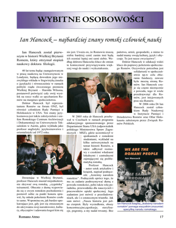 WYBITNE OSOBOWOŚCI Ian Hancock – najbardziej znany romski człowiek nauki Ian Hancock został pierwszym w historii Wielkiej Brytanii Romem, który otrzymał stopień naukowy doktora filologii. 40 lat temu będąc zaangażowanym w pracę naukową na Uniwersytecie w Londynie, będącą dowodem jego niezwykłego wkładu w lingwistykę (nauka o językach) i równocześnie w ramach polityki rządu ówczesnego premiera Wielkiej Brytanii – Harolda Wilsona, postanowił poświęcić cały swój wysiłek na rzecz walki ze spychaniem Romów na margines społeczeństwa. Doktor Hancock był reprezentantem Romów na forum ONZ, był również członkiem Rady Pamięci o Holokauście w USA. Ten znany językoznawca jest także założycielem i szefem Romskiego Centrum Archiwizacji i Dokumentacji na Uniwersytecie Teksańskim w Austin, gdzie wykłada jako profesor anglistyki, językoznawstwa i orientalistyki od 1972 roku. Dorastając w Wielkiej Brytanii, profesor Hancock musiał niejednokrotnie skrywać swą romską, ,,cygańską’’ tożsamość. Obecnie z dumą wypowiada się o swym romskim pochodzeniu i postawił sobie za punkt honoru sprawić, by młode pokolenie Romów czuło to samo. Wspomina on, jak bardzo upokarzające jest, gdy jest się zmuszanym do ukrywania swej narodowości, kultury, obyczajów i udawania kogoś kim się Romano Atmo nie jest. Uważa on, że Romowie muszą siebie bardziej cenić zanim inni będą ich oceniać lepiej oni sami siebie. Według doktora Hancocka klucz do zmian to konieczność przywiązywania większej wagi do nauki i wykształcenia. W 2005 roku dr Hancock przebywał w Czechach w ramach programu edukacyjnego sponsorowanego przez Departament Stanu USA (odpowiednik polskiego Ministerstwa Spraw Zagraniczych – MSZ), gdzie uczestniczył w spotkaniach z romskimi studentami, wykładał na kilku uniwersytetach na temat historii Romów, a także odbywał rozmowy z czeskimi władzami lokalnymi i centralnymi zajmującymi się problematyką romską. Profesor Hancock – autor setek artykułów i książek, napisał podręcznik: ,,Jesteśmy narodem romskim’’. Podręcznik oprócz tego, że ma za zadanie podtrzymywać dumę z powodu romskości, pełni także rolę poradnika, przewodnika dla nauczycieli i pracowników opieki społecznej. Jego zadaniem jest mówić o prześladowaniach, ale i o ostatecznym triumfie. Jak sam mówi: ,,Nasza historia jest pełna cierpień. Były wysiedlenia, obozy koncentracyjne,egzekucje, sterylizacje, pogromy, a my nadal trwamy. Bez państwa, armii, gospodarki, a mimo to nadal mamy swoją kulturę, język i obyczaje. To jest nasze zwycięstwo”. Doktor Hancock w edukacji widzi klucz do poprawy położenia społecznego Romów. Oczywiście potrzebna jest solidarność w społeczeństwie np.w celu zbierania funduszy, zawsze było mocną stroną Romów. Ian Hancock czuje się często niezręcznie z powodu, tego iż wiele przedsięwzięć dla Romów, jest inicjowanych prze nie-Romów. W 2006 roku Dr Ian Hancock został członkiem Rady Naukowej w Instytucie Pamięci i Dziedzictwa Romów oraz Ofiar Holokaustu założonym przez Związek Romów Polskich. . Ian Hancock książką „Jesteśmy narodem romskim” pomaga wszystkim zrozumieć specyfikę narodu romskiego. 17