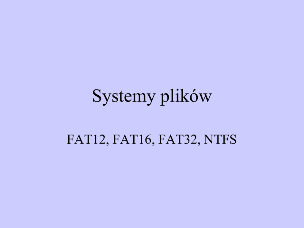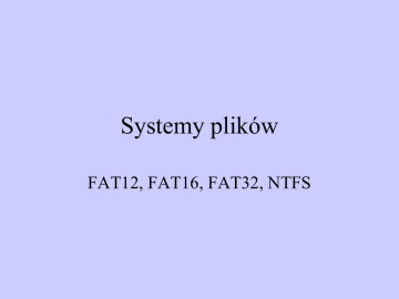 Systemy plików FAT12, FAT16, FAT32, NTFS Dysk • Podłączone do komputera urządzenie do przechowywania danych. • Obszar przechowywania informacji, który sformatowano przy użyciu systemu plików i przypisano literę dysku. Może być to dyskietka, dysk CD, dysk twardy lub dysk innego typu Precyzja odległość głowicy od dysku: 0.2 – 0.07 mm (i mniej) przekrój włosa głowica odcisk palca powierzchnia dysku szerokość ścieżki zależnie od wysokości głowicy drobinka pyłu tytoniowego Organizacja zapisu na dyskach Podstawowymi pojęciami opisującymi twarde dyski są: •Sektor •Klaster (jednostki alokacji ) Sektor – elementarna jednostka informacji – ciągły fragment powierzchni dysku pozwalający na zapisanie 571 bajtów danych (512B dostępnych dla użytkownika, pozostałe to nagłówek i stopka) Klaster – jednostka alokacji (allocation unit) ciągły zbiór sąsiadujących ze sobą sektorów danych – najmniejsza jednostka jaką można przypisać plikowi. dla klastra 4kB: plik 3kB zajmie 1 klaster (4kB) plik 5kB zajmie 2 klastry (8kB) Sektor przerwa między sektorami obszar danych 512B = 4096b przerwa między sektorami kod CRC nagłówka nagłówek kod korekcji ECC lub CRC przerwa CRC (cyclical redundancy check) ECC (error correction code) 2 bajty na końcu każdego sektora (dyskietki) dodawane po każdym zapisie i sprawdzane przy odczycie łańcuch kodów korekcji błędów na końcu każdego sektora HD Algorytm ECC znajduje i poprawia błędy System plików To pewien sposób organizacji informacji na dyskach komputera. Systemy plików wykorzystują hierarchiczną strukturę folderów do uporządkowania danych Do podstawowych systemów plików zaliczamy • FAT (FAT12, FAT16, FAT32, FAT64) stosowany systemach operacyjnych DOS i Windows, • NTFS - stosowany w systemach operacyjnych Windows NT, • EXT (EXT, EXT2,EXT3, EXT4) - stosowany w systemach operacyjnych Linux, • Reiser - (ReiserFS, Reiser4) stosowany w systemach operacyjnych Linux, • ISO 9660 – stosowany na płytach CD-ROM, • UDF – stosowany na płytach DVD. FAT12, FAT16, FAT32 Zalety • Prosty w implementacji (wdrażanie) - idealny do urządzeń przenośnych i osadzonych systemów operacyjnych • Popularny i dobrze udokumentowany • Obsługiwany przez praktycznie każdy system operacyjny Wady • • • • Podatny na awarie Podatny na fragmentacje Brak systemu uprawnień Nieefektywny przy dużej ilości plików i przy dużych partycjach • FAT12 – numery klastrów są liczbami 12 bitowymi (0..4095), kilka numerów jest zarezerwowanych, zostaje: 2..4086 • FAT16 - numery klastrów są liczbami 16 bitowymi • FAT32 - numery klastrów są liczbami 32 bitowymi (4bajtowe) FAT12: dla klaster=1 sektor pojemność dysku= 4086(4kB)x512B<2MB (dla dyskietki OK., dla dysku za mało) dla klaster = 8 sektor pojemność dysku= 4086x(8x512B)=do ok..16MB • FAT16 – wprowadzony z wersją 3 DOS do obsługi dysków większych niż 16MB. • dla klastra=4xsektor = 2kB (4x512B=2kBx65500)=pojemność dysku < 128 MB • dla większych dysków trzeba zwiększyć rozmiar klastra • FAT32 – wprowadzony wraz z systemem Windows 95 może obsługiwać klastry i 32 bitowych numerach. 4 znaczące bity są zarezerwowane – numer klastra=28bitów = 268435456 numenrów • minimalny rozmiar dysku z systemem FAT32, to 512MB • Tablica FAT32 może mięć do 1GB (klaster=sektor=512B) dysk o pojemności 2048 GB katalog główny kopia rekordu rozruchowego obszar zarezerwowany tablica rozmieszczenia plików #2 tablica rozmieszczenia plików #1 tablica rozmieszczenia plików #2 obszar zarezerwowany sektor rozruchowy tablica rozmieszczenia plików #1 rekord rozruchowy 3 sektory FAT32 FAT12 i FAT16 Struktura logiczna dysków obszar danych (pliki i katalogi) obszar zarezerwowany zwykle 32 sektory obszar danych (pliki i katalogi) Struktura logiczna dysków • Rekord rozruchowy (MBR Master Boot Record,)– pierwszy sektor na dysku (dyskietce) – odpowiedzialny za załadowanie odpowiedniego systemu operacyjnego, skojarzony z tablicą zawierającą informacje o dysku • Tablica rozmieszczenia plików – FAT System plików używany w systemie MS-DOS i innych systemach operacyjnych Windows do organizowania plików i zarządzania nimi. • Katalog główny (root directory) – w formacie FAT12 i FAT16 część obszaru systemowego dysku, – FAT32 – traktowany podobnie jak inne podkatalogi. • Zawiera wskaźniki początków plików, ich rozmiary i nazwy. • Podkatalogi – pliki zawierające dodatkowe listy plików. Informacja o ich rozmiarze znajduje się w FAT jako liczba zajmowanych klastrów • Obszar danych – obszar przeznaczony do zapisu plików i katalogów, ograniczony pojemnością dysku. Dostęp za pomocą fizycznego adresu sektora, numeru logicznego sektora i numeru klastera. System plików NTFS Przed systemem plików zaczęto stawiać nowe wymagania, którym poprzedni system plików FAT nie był w stanie sprostać. Wymagania te były na tyle skomplikowane, że nie zdecydowano się na rozszerzenie systemu FAT tylko napisanie zupełnie nowego systemu plików. Nowe cechy miały nie tylko zaspokoić oczekiwania biznesowe, ale i wspomóc zwykłych użytkowników w ich codziennej pracy NTFS – cechy ogólne • NTFS wprowadzony z systemem Windows NT • Pliki w formacie NTFS nie są odczytywane przez inne systemy (DOS, Windows 9x/ME) • Windows NT obsługuje jednocześnie FAT32 i NTFS, NTFS – podstawowe zalety • Lista kontroli dostępu ALC - pozwala zachować kontrole dostępu do plików i folderów • Obsługa dużych plików • Kompresja plików i folderów - kompresja może zmniejszyć rozmiar plików • Obsługa Unikodu - wykorzystuje 16 bitów do zapisu informacji • Kodowanie plików - pozwala zapisanie zakodowanych plików
