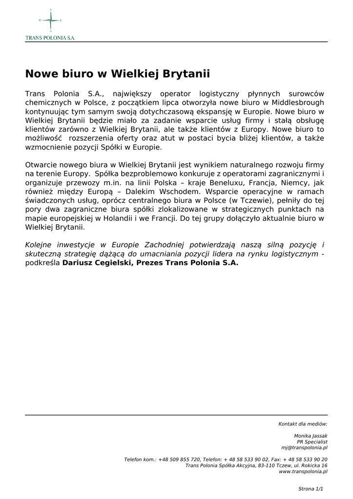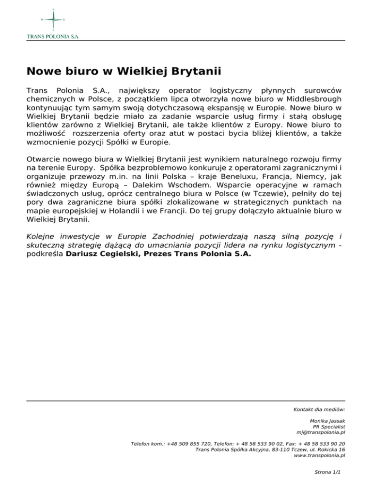 Nowe biuro w Wielkiej Brytanii Trans Polonia S.A., największy operator logistyczny płynnych surowców chemicznych w Polsce, z początkiem lipca otworzyła nowe biuro w Middlesbrough kontynuując tym samym swoją dotychczasową ekspansję w Europie. Nowe biuro w Wielkiej Brytanii będzie miało za zadanie wsparcie usług firmy i stałą obsługę klientów zarówno z Wielkiej Brytanii, ale także klientów z Europy. Nowe biuro to możliwość rozszerzenia oferty oraz atut w postaci bycia bliżej klientów, a także wzmocnienie pozycji Spółki w Europie. Otwarcie nowego biura w Wielkiej Brytanii jest wynikiem naturalnego rozwoju firmy na terenie Europy. Spółka bezproblemowo konkuruje z operatorami zagranicznymi i organizuje przewozy m.in. na linii Polska – kraje Beneluxu, Francja, Niemcy, jak również między Europą – Dalekim Wschodem. Wsparcie operacyjne w ramach świadczonych usług, oprócz centralnego biura w Polsce (w Tczewie), pełniły do tej pory dwa zagraniczne biura spółki zlokalizowane w strategicznych punktach na mapie europejskiej w Holandii i we Francji. Do tej grupy dołączyło aktualnie biuro w Wielkiej Brytanii. Kolejne inwestycje w Europie Zachodniej potwierdzają naszą silną pozycję i skuteczną strategię dążącą do umacniania pozycji lidera na rynku logistycznym podkreśla Dariusz Cegielski, Prezes Trans Polonia S.A. Kontakt dla mediów: Monika Jassak PR Specialist [email protected] Telefon kom.: +48 509 855 720, Telefon: + 48 58 533 90 02, Fax: + 48 58 533 90 20 Trans Polonia Spółka Akcyjna, 83-110 Tczew, ul. Rokicka 16 www.transpolonia.pl Strona 1/1 Powered by TCPDF (www.tcpdf.org)