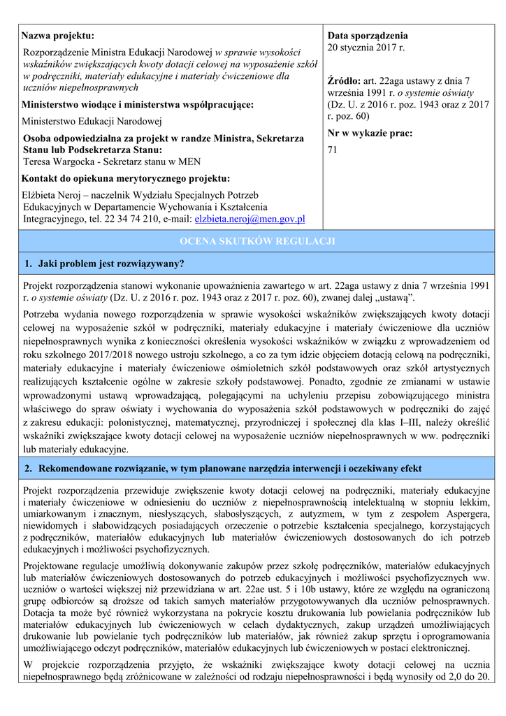 Nazwa projektu: Data sporządzenia 20 stycznia 2017 r. Rozporządzenie Ministra Edukacji Narodowej w sprawie wysokości wskaźników zwiększających kwoty dotacji celowej na wyposażenie szkół w podręczniki, materiały edukacyjne i materiały ćwiczeniowe dla Źródło: art. 22aga ustawy z dnia 7 uczniów niepełnosprawnych września 1991 r. o systemie oświaty (Dz. U. z 2016 r. poz. 1943 oraz z 2017 Ministerstwo wiodące i ministerstwa współpracujące: r. poz. 60) Ministerstwo Edukacji Narodowej Osoba odpowiedzialna za projekt w randze Ministra, Sekretarza Stanu lub Podsekretarza Stanu: Teresa Wargocka - Sekretarz stanu w MEN Nr w wykazie prac: 71 Kontakt do opiekuna merytorycznego projektu: Elżbieta Neroj – naczelnik Wydziału Specjalnych Potrzeb Edukacyjnych w Departamencie Wychowania i Kształcenia Integracyjnego, tel. 22 34 74 210, e-mail: [email protected] OCENA SKUTKÓW REGULACJI 1. Jaki problem jest rozwiązywany? Projekt rozporządzenia stanowi wykonanie upoważnienia zawartego w art. 22aga ustawy z dnia 7 września 1991 r. o systemie oświaty (Dz. U. z 2016 r. poz. 1943 oraz z 2017 r. poz. 60), zwanej dalej „ustawą”. Potrzeba wydania nowego rozporządzenia w sprawie wysokości wskaźników zwiększających kwoty dotacji celowej na wyposażenie szkół w podręczniki, materiały edukacyjne i materiały ćwiczeniowe dla uczniów niepełnosprawnych wynika z konieczności określenia wysokości wskaźników w związku z wprowadzeniem od roku szkolnego 2017/2018 nowego ustroju szkolnego, a co za tym idzie objęciem dotacją celową na podręczniki, materiały edukacyjne i materiały ćwiczeniowe ośmioletnich szkół podstawowych oraz szkół artystycznych realizujących kształcenie ogólne w zakresie szkoły podstawowej. Ponadto, zgodnie ze zmianami w ustawie wprowadzonymi ustawą wprowadzającą, polegającymi na uchyleniu przepisu zobowiązującego ministra właściwego do spraw oświaty i wychowania do wyposażenia szkół podstawowych w podręczniki do zajęć z zakresu edukacji: polonistycznej, matematycznej, przyrodniczej i społecznej dla klas I–III, należy określić wskaźniki zwiększające kwoty dotacji celowej na wyposażenie uczniów niepełnosprawnych w ww. podręczniki lub materiały edukacyjne. 2. Rekomendowane rozwiązanie, w tym planowane narzędzia interwencji i oczekiwany efekt Projekt rozporządzenia przewiduje zwiększenie kwoty dotacji celowej na podręczniki, materiały edukacyjne i materiały ćwiczeniowe w odniesieniu do uczniów z niepełnosprawnością intelektualną w stopniu lekkim, umiarkowanym i znacznym, niesłyszących, słabosłyszących, z autyzmem, w tym z zespołem Aspergera, niewidomych i słabowidzących posiadających orzeczenie o potrzebie kształcenia specjalnego, korzystających z podręczników, materiałów edukacyjnych lub materiałów ćwiczeniowych dostosowanych do ich potrzeb edukacyjnych i możliwości psychofizycznych. Projektowane regulacje umożliwią dokonywanie zakupów przez szkołę podręczników, materiałów edukacyjnych lub materiałów ćwiczeniowych dostosowanych do potrzeb edukacyjnych i możliwości psychofizycznych ww. uczniów o wartości większej niż przewidziana w art. 22ae ust. 5 i 10b ustawy, które ze względu na ograniczoną grupę odbiorców są droższe od takich samych materiałów przygotowywanych dla uczniów pełnosprawnych. Dotacja ta może być również wykorzystana na pokrycie kosztu drukowania lub powielania podręczników lub materiałów edukacyjnych lub ćwiczeniowych w celach dydaktycznych, zakup urządzeń umożliwiających drukowanie lub powielanie tych podręczników lub materiałów, jak również zakup sprzętu i oprogramowania umożliwiającego odczyt podręczników, materiałów edukacyjnych lub ćwiczeniowych w postaci elektronicznej. W projekcie rozporządzenia przyjęto, że wskaźniki zwiększające kwoty dotacji celowej na ucznia niepełnosprawnego będą zróżnicowane w zależności od rodzaju niepełnosprawności i będą wynosiły od 2,0 do 20. W przypadku uczniów z dysfunkcją wzroku – niewidomych i słabowidzących wysokość dotacji będzie dodatkowo uzależniona od rodzaju tego dostosowania. W przypadku uczniów słabowidzących korzystających z podręczników, materiałów edukacyjnych i materiałów ćwiczeniowych wydrukowanych w druku powiększonym wskaźnik będzie wynosił 8, a w przypadku uczniów niewidomych korzystających z podręczników, materiałów edukacyjnych i materiałów ćwiczeniowych wydrukowanych w systemie Braille’a – 20. 3. Jak problem został rozwiązany w innych krajach, w szczególności krajach członkowskich OECD/UE? System edukacji w Wielkiej Brytanii cechuje szereg różnic regionalnych, wynikających z odrębności przepisów prawa Anglii, Walii, Irlandii Północnej i Szkocji. W Anglii prawo nie wyszczególnia zapewnienia podręczników dla uczniów niewidomych i słabowidzących oraz pokrycia ich kosztów jako obowiązku organów prowadzących szkoły, bowiem edukacja w Anglii jest bezpłatna (jest tylko niewielki zakres opłat, jakimi szkoły mogą obciążać rodziców np. czesnym za dodatkowe kształcenie muzyczne). Rodzice nie ponoszą kosztów podręczników szkolnych, także wówczas, gdy są one wykonane w systemie Braille’a lub w druku powiększonym. Zarówno organy prowadzące, jak i szkoły mają obowiązek zapewnienia realizacji specjalnych potrzeb edukacyjnych uczniów, w tym podręczników w systemie Braille’a lub druku powiększonym, jeśli uczeń ich potrzebuje. Szkoły i organy prowadzące zobowiązane są do wprowadzania racjonalnych dostosowań („reasonable adjustments”), które mają zapobiegać dyskryminacji uczniów niepełnosprawnych. Szkoły oraz organy prowadzące na chwilę obecną nie muszą wprowadzać racjonalnych dostosowań w zakresie pomocy dydaktycznych (w tym np. wyposażenia), ale wiele szkół i organów prowadzących zapewnienie podręczników w systemie Braille’a oraz 