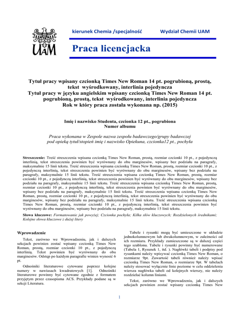kierunek Chemia /specjalność Wydział Chemii UAM Praca licencjacka Tytuł pracy wpisany czcionką Times New Roman 14 pt. pogrubioną, prostą, tekst wyśrodkowany, interlinia pojedyncza Tytuł pracy w języku angielskim wpisany czcionką Times New Roman 14 pt. pogrubioną, prostą, tekst wyśrodkowany, interlinia pojedyncza Rok w który praca została wykonana np. (2015) Imię i nazwisko Studenta, czcionka 12 pt., pogrubiona Numer albumu Praca wykonana w Zespole nazwa zespołu badawczego/grupy badawczej pod opieką tytuł/stopień imię i nazwisko Opiekuna, czcionka12 pt., pochyła Streszczenie: Treść streszczenia wpisana czcionką Times New Roman, prostą, rozmiar czcionki 10 pt., z pojedynczą interlinią, tekst streszczenia powinien być wyrównany do obu marginesów, wpisany bez podziału na paragrafy, maksymalnie 15 linii tekstu. Treść streszczenia wpisana czcionką Times New Roman, prostą, rozmiar czcionki 10 pt., z pojedynczą interlinią, tekst streszczenia powinien być wyrównany do obu marginesów, wpisany bez podziału na paragrafy, maksymalnie 15 linii tekstu. Treść streszczenia wpisana czcionką Times New Roman, prostą, rozmiar czcionki 10 pt., z pojedynczą interlinią, tekst streszczenia powinien być wyrównany do obu marginesów, wpisany bez podziału na paragrafy, maksymalnie 15 linii tekstu. Treść streszczenia wpisana czcionką Times New Roman, prostą, rozmiar czcionki 10 pt., z pojedynczą interlinią, tekst streszczenia powinien być wyrównany do obu marginesów, wpisany bez podziału na paragrafy, maksymalnie 15 linii tekstu. Treść streszczenia wpisana czcionką Times New Roman, prostą, rozmiar czcionki 10 pt., z pojedynczą interlinią, tekst streszczenia powinien być wyrównany do obu marginesów, wpisany bez podziału na paragrafy, maksymalnie 15 linii tekstu. Treść streszczenia wpisana czcionką Times New Roman, prostą, rozmiar czcionki 10 pt., z pojedynczą interlinią, tekst streszczenia powinien być wyrównany do obu marginesów, wpisany bez podziału na paragrafy, maksymalnie 15 linii tekstu. Słowa kluczowe: Formatowanie jak powyżej; Czcionka pochyła; Kilka słów kluczowych; Rozdzielonych średnikami; Kolejne słowa kluczowe z dużej litery Tabele i rysunki mogą być umieszczone w układzie jednokolumnowym lub dwukolumnowym, w zależności od ich rozmiaru. Przykłady zamieszczone są w dalszej części tego szablonu. Tabele i rysunki powinny być numerowane (Tabela 1, Rysunek 1, itd. ). Nagłówki tabeli i podpisy pod rysunkami należy wpisywać czcionką Times New Roman, o rozmiarze 9pt. Zawartość tabeli również należy wpisać czcionką Times New Roman, o rozmiarze 9pt. W tabelach należy stosować wyłącznie linie poziome w celu oddzielenia wiersza nagłówka tabeli od kolejnych wierszy, nie należy rozdzielać kolumn liniami. Wprowadzenie Tekst, zarówno we Wprowadzeniu, jak i dalszych sekcjach powinien zostać wpisany czcionką Times New Roman, prostą, rozmiar czcionki 10 pt., z pojedynczą interlinią. Tekst powinien być wyrównany do obu marginesów. Odstęp po każdym paragrafie winien wynosić 6 pt. Odnośniki literaturowe cytowane poprzez kolejne numery w nawiasach kwadratowych [1]. Odnośniki literaturowe powinny być cytowane zgodnie z formatem przyjętym przez czasopisma ACS. Przykłady podane są w sekcji Literatura. Tekst, zarówno we Wprowadzeniu, jak i dalszych sekcjach powinien zostać wpisany czcionką Times New 1 Zespół (tu wpisać nazwę zespołu / grupy badawczej) Roman, prostą, rozmiar czcionki 10 pt., z pojedynczą interlinią. Tekst powinien być wyrównany do obu marginesów. Odstęp po każdym paragrafie winien wynosić 6 pt. Tabele i rysunki mogą być umieszczone w układzie jednokolumnowym lub dwukolumnowym, w zależności od ich rozmiaru. Przykłady zamieszczone są w dalszej części tego szablonu. Tabele i rysunki powinny być numerowane (Tabela 1, Rysunek 1, itd. ). Nagłówki tabeli i podpisy pod rysunkami należy wpisywać czcionką Times New Roman, o rozmiarze 9pt. Zawartość tabeli również należy wpisać czcionką Times New Roman, o rozmiarze 9pt. W tabelach należy stosować wyłącznie linie poziome w celu oddzielenia wiersza nagłówka tabeli od kolejnych wierszy, nie należy rozdzielać kolumn liniami. Odnośniki literaturowe cytowane poprzez kolejne numery w nawiasach kwadratowych [1]. Odnośniki literaturowe powinny być cytowane zgodnie z formatem przyjętym przez czasopisma ACS. Przykłady podane są w sekcji Literatura. Tabele i rysunki mogą być umieszczone w układzie jednokolumnowym lub dwukolumnowym, w zależności od ich rozmiaru. Przykłady zamieszczone są w dalszej części tego szablonu. Tabele i rysunki powinny być numerowane (Tabela 1, Rysunek 1, itd. ). Nagłówki tabeli i podpisy pod rysunkami należy wpisywać czcionką Times New Roman, o rozmiarze 9pt. Zawartość tabeli również należy wpisać czcionką Times New Roman, o rozmiarze 9pt. W tabelach należy stosować wyłącznie linie poziome w celu oddzielenia wiersza nagłówka tabeli od kolejnych wierszy, nie należy rozdzielać kolumn liniami. Tekst, zarówno we Wprowadzeniu, jak i dalszych sekcjach powinien zostać wpisany czcionką Times New Roman, prostą, rozmiar czcionki 10 pt., z pojedynczą interlinią. Tekst powinien być wyrównany do obu marginesów. Odstęp po każdym paragrafie winien wynosić 6 pt. Tekst, zarówno we Wprowadzeniu, jak i dalszych sekcjach powinien zostać wpisany czcionką Times New Roman, prostą, rozmiar czcionki 10 pt., z pojedynczą a) b) c) H H H H Rysunek 1. Przykład rysunku umieszczonego w pojedynczej kolumnie. Podpis: Tomes New Roman 9pt. interlinią. Tekst powinien być wyrównany do obu marginesów. Odstęp po każdym paragrafie winien wynosić 6 pt. Odnośniki literaturowe cytowane poprzez kolejne numery w nawiasach kwadratowych [1]. Odnośniki literaturowe powinny być cytowane zgodnie z formatem przyjętym przez czasopisma ACS. Przykłady podane są w sekcj
