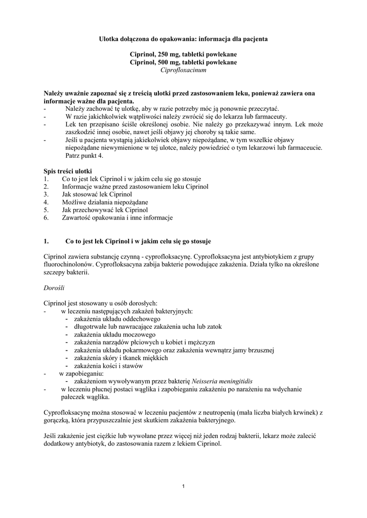 Ulotka dołączona do opakowania: informacja dla pacjenta Ciprinol, 250 mg, tabletki powlekane Ciprinol, 500 mg, tabletki powlekane Ciprofloxacinum Należy uważnie zapoznać się z treścią ulotki przed zastosowaniem leku, ponieważ zawiera ona informacje ważne dla pacjenta. Należy zachować tę ulotkę, aby w razie potrzeby móc ją ponownie przeczytać. W razie jakichkolwiek wątpliwości należy zwrócić się do lekarza lub farmaceuty. Lek ten przepisano ściśle określonej osobie. Nie należy go przekazywać innym. Lek może zaszkodzić innej osobie, nawet jeśli objawy jej choroby są takie same. Jeśli u pacjenta wystąpią jakiekolwiek objawy niepożądane, w tym wszelkie objawy niepożądane niewymienione w tej ulotce, należy powiedzieć o tym lekarzowi lub farmaceucie. Patrz punkt 4. Spis treści ulotki 1. Co to jest lek Ciprinol i w jakim celu się go stosuje 2. Informacje ważne przed zastosowaniem leku Ciprinol 3. Jak stosować lek Ciprinol 4. Możliwe działania niepożądane 5. Jak przechowywać lek Ciprinol 6. Zawartość opakowania i inne informacje 1. Co to jest lek Ciprinol i w jakim celu się go stosuje Ciprinol zawiera substancję czynną - cyprofloksacynę. Cyprofloksacyna jest antybiotykiem z grupy fluorochinolonów. Cyprofloksacyna zabija bakterie powodujące zakażenia. Działa tylko na określone szczepy bakterii. Dorośli Ciprinol jest stosowany u osób dorosłych: w leczeniu następujących zakażeń bakteryjnych: - zakażenia układu oddechowego - długotrwałe lub nawracające zakażenia ucha lub zatok - zakażenia układu moczowego - zakażenia narządów płciowych u kobiet i mężczyzn - zakażenia układu pokarmowego oraz zakażenia wewnątrz jamy brzusznej - zakażenia skóry i tkanek miękkich - zakażenia kości i stawów w zapobieganiu: - zakażeniom wywoływanym przez bakterię Neisseria meningitidis w leczeniu płucnej postaci wąglika i zapobieganiu zakażeniu po narażeniu na wdychanie pałeczek wąglika. Cyprofloksacynę można stosować w leczeniu pacjentów z neutropenią (mała liczba białych krwinek) z gorączką, która przypuszczalnie jest skutkiem zakażenia bakteryjnego. Jeśli zakażenie jest ciężkie lub wywołane przez więcej niż jeden rodzaj bakterii, lekarz może zalecić dodatkowy antybiotyk, do zastosowania razem z lekiem Ciprinol. 1 Dzieci i młodzież Ciprinol jest stosowany u dzieci i młodzieży, pod specjalistyczną kontrolą lekarską, w następujących zakażeniach bakteryjnych: zakażenia płuc i oskrzeli u dzieci i młodzieży chorych na mukowiscydozę powikłane zakażenia układu moczowego, w tym zakażenia nerek (odmiedniczkowe zapalenie nerek) płucna postać wąglika (zapobieganie zakażeniom po kontakcie z pałeczkami wąglika i leczenie). Ciprinol może również być zastosowany do leczenia innych ciężkich zakażeń u dzieci i młodzieży, jeśli lekarz uzna to za konieczne. 2. Informacje ważne przed zastosowaniem leku Ciprinol Kiedy nie stosować leku Ciprinol: jeśli pacjent ma uczulenie na substancję czynną, inne leki z grupy chinolonów lub na którykolwiek z pozostałych składników tego leku (wymienionych w punkcie 6), u pacjentów przyjmujących jednocześnie tyzanidynę (patrz punkt 2 „Ciprinol a inne leki”). Ostrzeżenia i środki ostrożności Przed rozpoczęciem stosowania leku Ciprinol należy omówić to z lekarzem lub farmaceutą. Należy poinformować lekarza jeśli: u pacjenta występowały kiedykolwiek problemy z nerkami, ponieważ może być konieczna zmiana dawki leku, pacjent choruje na padaczkę lub ma inne zaburzenia neurologiczne, u pacjenta występowały w przeszłości problemy ze ścięgnami podczas leczenia takimi antybiotykami, jak lek Ciprinol, pacjent choruje na cukrzycę - po zastosowaniu cyprofloksacyny u pacjenta może znacznie zmniejszyć się stężenie cukru (wystąpić tzw. hipoglikemia), u pacjenta stwierdzono miastenię (rodzaj osłabienia mięśni), u pacjenta lub w jego rodzinie występuje niedobór dehydrogenazy glukozo-6-fosforanowej (G6PD), należy poinformować o tym lekarza - po zastosowaniu cyprofloksacyny może wystąpić niedokrwistość (anemia). W leczeniu niektórych zakażeń układu moczowo-płciowego lekarz może dodatkowo, oprócz cyprofloksacyny, przepisać inny antybiotyk. Jeśli u pacjenta nie nastąpi poprawa stanu zdrowia po trzech dniach leczenia, należy zwrócić się do lekarza. Zaburzenia dotyczące serca Należy zachować ostrożność podczas stosowania tego typu leków, jeśli: u pacjenta stwierdzono wrodzone lub występujące w rodzinie wydłużenie odstępu QT (widoczne w zapisie EKG - badaniu aktywności elektrycznej serca), u pacjenta stwierdzono zaburzenia równowagi elektrolitowej we krwi (zwłaszcza małe stężenie potasu i magnezu we krwi), pacjent ma bardzo wolny rytm serca (zwany bradykardią), pacjent ma słabą pracę serca (niewydolność serca), pacjent przebył zawał mięśnia sercowego, pacjent jest kobietą lub osobą w podeszłym wieku, pacjent stosuje inne leki mogące powodować zmiany w zapisie EKG (patrz punkt 2 „Ciprinol a inne leki”). 2 Podczas stosowania leku Ciprinol Jeżeli podczas stosowania leku Ciprinol wystąpi którykolwiek z poniższych objawów, należy natychmiast powiedzieć o tym lekarzowi. Lekarz zadecyduje, czy trzeba przerwać stosowanie leku Ciprinol. - Ciężka, nagła reakcja alergiczna (reakcja anafilaktyczna lub wstrząs, obrzęk naczynioruchowy). Z niewielkim prawdopodobieństwem, ale nawet po przyjęciu pierwszej dawki może wystąpić ciężka reakcja alergiczna, z następującymi objawami: ucisk w klatce piersiowej, zawroty głowy, nudności, omdlenia lub zawroty głowy podczas wstawania. Jeżeli tak się stanie, należy przerwać stosowanie leku Ciprinol i natychmiast skontaktować się z lekarzem. - Sporadycznie może wystąpić ból i obrzęk stawów oraz zapalenie ścięgna, szczególnie u pacjentów w podeszłym wieku i leczonych jednocześnie kortykosteroidami. W okr