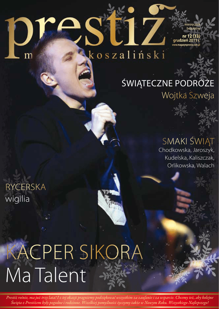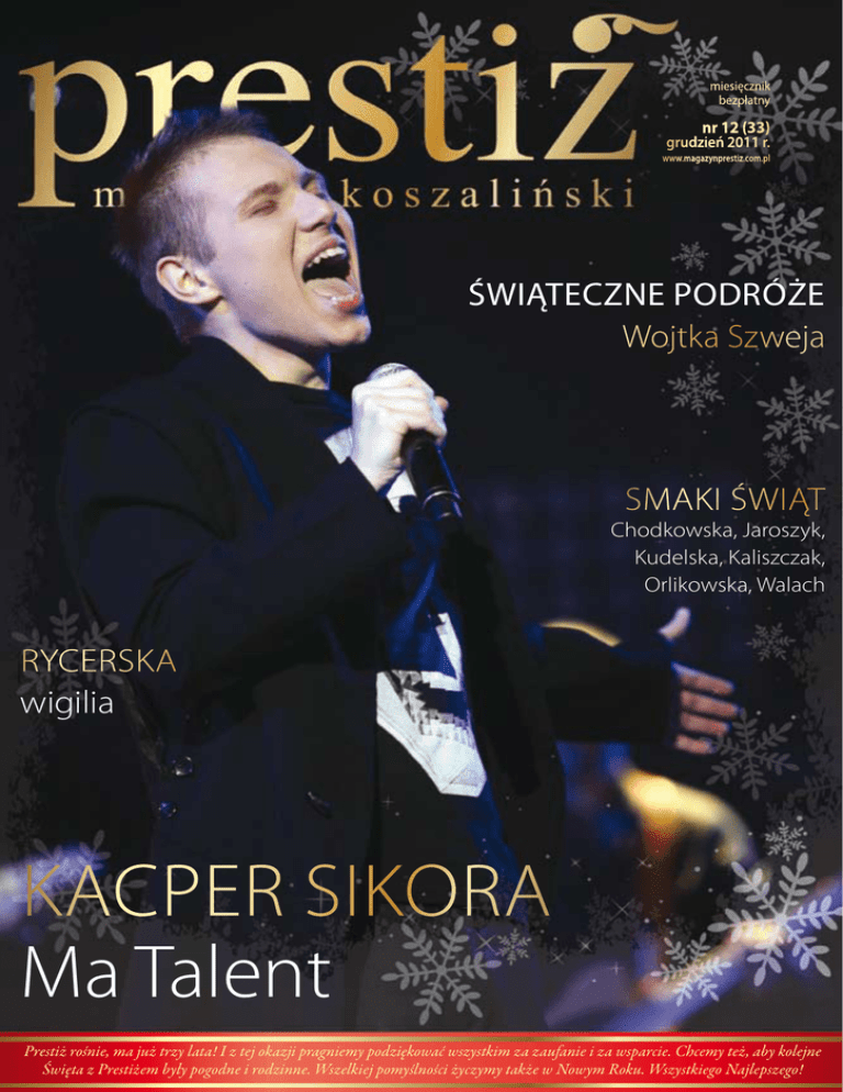 miesięcznik bezpłatny nr 12 (33) grudzień 2011 r. www.magazynprestiz.com.pl Świąteczne podróże Wojtka Szweja Smaki świąt Chodkowska, Jaroszyk, Kudelska, Kaliszczak, Orlikowska, Walach Rycerska wigilia Kacper Sikora Ma Talent Prestiż rośnie, ma już trzy lata! I z tej okazji pragniemy podziękować wszystkim za zaufanie i za wsparcie. Chcemy też, aby kolejne Święta z Prestiżem były pogodne i rodzinne. Wszelkiej pomyślności życzymy także w Nowym Roku. Wszystkiego Najlepszego! Rozmowa z mgr inż. Mirosławem Szusterem, Konsultantem Projektu Innowacyjnych Technologii w EkoWodrol Koszalin Sp. z o. o. EkoWodrol Sp. z o.o. poprzez udział w Regionalnym Programie Operacyjnym Województwa Zachodniopomorskiego na lata 2007-2013, zyskał nowe możliwości produkcji zaworów SZUSTER system. Co dzięki programowi udało się zrealizować? - Przede wszystkim uzyskaliśmy możliwość produkcji szerokiej gamy odmian i średnic zaworów zwrotnych kolanowych oraz wykonań materiałowych, o nazwach handlowych ESK (DN32-DN300) i COMBI (DN50-DN100) oraz wykonań specjalnych. Do momentu rozpoczęcia PRO WZ posiadaliśmy w sprzedaży ograniczony zakres średnic zaworów zwrotnych kolanowych jak i ich wykonań materiałowych, co utrudniało nam współpracę handlową z partnerami zagranicznymi. Co było motywacją do udziału w PRO WZ? -Przede wszystkim zainteresowanie rynku nowym produktem. Otrzymywaliśmy wiele pytań o inne średnice zaworów niż dotychczas produkowane oraz o specjalne wykonania konstrukcyjne i materiałowe zaworów. Uświadomiliśmy sobie, że potencjał tego produktu jest bardzo duży oraz istnieje pilna potrzeba rozszerzenia produkcji o większe średnice i wykonania specjalne. Jakie inne inwestycje wpłynęły na wzrost konkurencyjności koszalińskiego EkoWodrolu? -W ramach programu wdrożyliśmy produkcję zaworów z żeliwa sferoidalnego, które ma o wiele lepsze parametry techniczne niż dotychczas używane żeliwo szare. Dodatkowo uruchomiliśmy produkcję kul do zaworów, dzięki czemu mamy pełną kontrolę nad jakością finalnego produktu i możliwość dostosowania wyrobu pod konkretne wymagania odbiorcy. W wielu publikacjach Państwa firmy przywołane jest wyrażenie „jedyne na rynku”, czego ono dokładniej dotyczy? -Odnosi się ono do normy PN-EN 12050-4. Jest to Norma Europejska dotycząca zaworów zwrotnych. Właśnie zawory SZUSTER system, jako „jedyne na rynku”, w pełni ją spełniają. Jest to gwarancja niezawodności działania, innowacyjności oraz najwyższej jakości produktu. W ramach PRO WZ zostało również uruchomione zautomatyzowane stanowisko do prowadzenia prób ciśnieniowych zaworów zwrotnych kolanowych. Na tym EkoWodrol zakończy inwestycje w ramach PRO WZ? -Oczywiście bardzo wiele udało nam się do tej pory zrobić, lecz mamy jeszcze inne zadania do wykonania. Jednym z nich jest uruchomienie produkcji uszczelek gumowych typu „U” do zaworów zwrotnych COMBI. Czy są już jakieś korzyści handlowe wynikające z udziału w programie? -Jak najbardziej tak. Z każdym kolejnym rokiem obserwujemy wzrost sprzedaży zaworów SZUSTER system. W ostatnim czasie EkoWodrol sfinalizował transakcję z firmą francuską i niemiecką, których przedmiotem były zawory ESK (DN250 i DN300). Dostarczamy także zawory do renomowanych międzynarodowych firm pompowych. To pokazuje, że pozycja koszalińskiej firmy jest również silna na rynku zagranicznym. Czego Pan by życzył firmie EkoWodrol w zbliżającym się, wielkimi krokami, Nowym Roku? -Zarówno EkoWodrol-owi jak i wszystkim czytelnikom magazynu Prestiż, życzyłbym spełnienia wszystkich postawionych sobie celów zarówno w życiu zawodowym jak i prywatnym. EkoWodrol Sp. z o.o. Koszalin tel. +48 94 348 60 40, fax +48 94 348 60 41 [email protected] www.ekowodrol.pl Dział Sprzedaży Nowych Produktów, tel. +48 94 346 22 18 kom. 607 280 064 Spis treści Słowo od naczelnego Czasem to niezwykłe, kiedy niepostrzeżenie pojawia się kolejny grudzień. Po pierwsze dlatego że to czas podsumowań roku, po drugie z powodu magii Świąt Bożego Narodzenia, no i wreszcie, że to już trzeci wspólny z Wami rok. „Prestiż” idzie do przedszkola. Chyba możemy sobie pozwolić na stwierdzenie, że całkiem ładne z niego dziecko. Zresztą to także Wasza opinia. Bardzo za nią dziękujemy! Grudniowy „Prestiż” wypełniają oczywiście świąteczne akcenty, choć niespodziewany prezent zrobił nam Kacper Sikora, który „przed chwilą” wygrał program „Mam talent” w TVN. Ponieważ to chłopak „od nas”, znalazł swoje miejsce na okładce. A w środku przeczytacie o nim to, czego nie zdążył powiedzieć na wizji. W niezwykłą podróż zabierze Was Wojtek Szwej, który święta spędzał za granicą w miastach, na statku i na plaży. W magazynie cofamy się także do średniowiecza. Za sprawą Koszalińskiej Kompanii Rycerskiej dowiecie się jak wyglądała wigilia w czasach Jagiellonów, a o swoich ulubionych współczesnych potrawach świątecznych opowiadają znani koszalinianie. Grudzień tradycyjnie kojarzy się z pomocą potrzebującym, u nas znajdziecie materiał o pomyśle na całoroczną pomoc zainicjowaną przez Północną Izbę Gospodarczą. Zachęcamy Was także do zagłębienia się w nasze stałe pozycje: przedstawiamy kolejne niebanalne wnętrze i takiż pojazd. Miłośnicy astrologii znajdą sesję modową inspirowaną znakami zodiaku. Numer jak zawsze rozpoczynają wydarzenia, a kończą zdjęcia kroniki towarzyskiej. Życzymy inspirującej lektury, zdrowych i rodzinnych świąt i prestiżowego Nowego Roku! I piszcie do nas: [email protected] Kuba Grabski miesięcznik bezpłatny FELIETON 6 Rozmowy w pociągu. Bez noży, porządków i karpia, czyli jak przeżyć święta. Joanna Osińska. WYDARZENIA 7 Szefowa Hortulusa nagrodzona w Brukseli. Kiwanis sumuje. Dla Krzysia Czerwińskiego 8 Znajdą pracę. Nagroda dla pięknej książki. Mistrzowie Świata z 